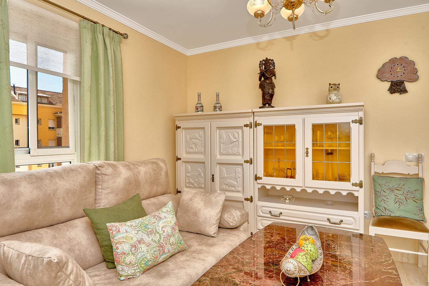 Die Ferienwohnung besteht aus einem schmucken kombinierten Wohn- / Esszimmer mit freiem Blick auf die grüne Palmenoase der Wohnanlage. Vor dem Südfenster des Raumes steht die Couch mit grossem Wohnzimmertisch, der ausreichend Platz bietet, beispielsweise für Tischspiele. In zwei rustikalen Wohnzimmerschränken verbirgt sich das Kaffee, Tee- und Essgeschirr sowie Wasser- / Wein- und Biergläser ebenso wie Schnapsgläschen, Cognac-Schwenker und Sektkelche . Ein runder Esszimmertisch mit vier bequemen Stühlen, ein Sidebord mit Flachbildschirm-TV, ein Mikrowellengerät und eine kleine Musikanlage mit CD-Teil sind ebenfalls vorhanden.