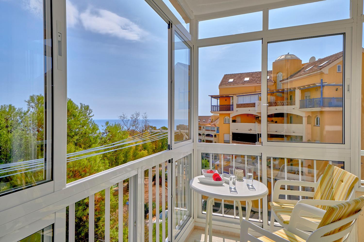 Der Übergang von der Essecke zum Balkonbereich mit Blick auf das südlich gelegene Mittelmeer ist fliessend , und auch hier wird sich der Gast an einem Tisch mit zwei Balkonstühlen gern aufhalten, zumal dieser Bereich auf Ost-Süd-West ausgerichtet ist und man somit ganztägig im Sonnenlicht baden kann.