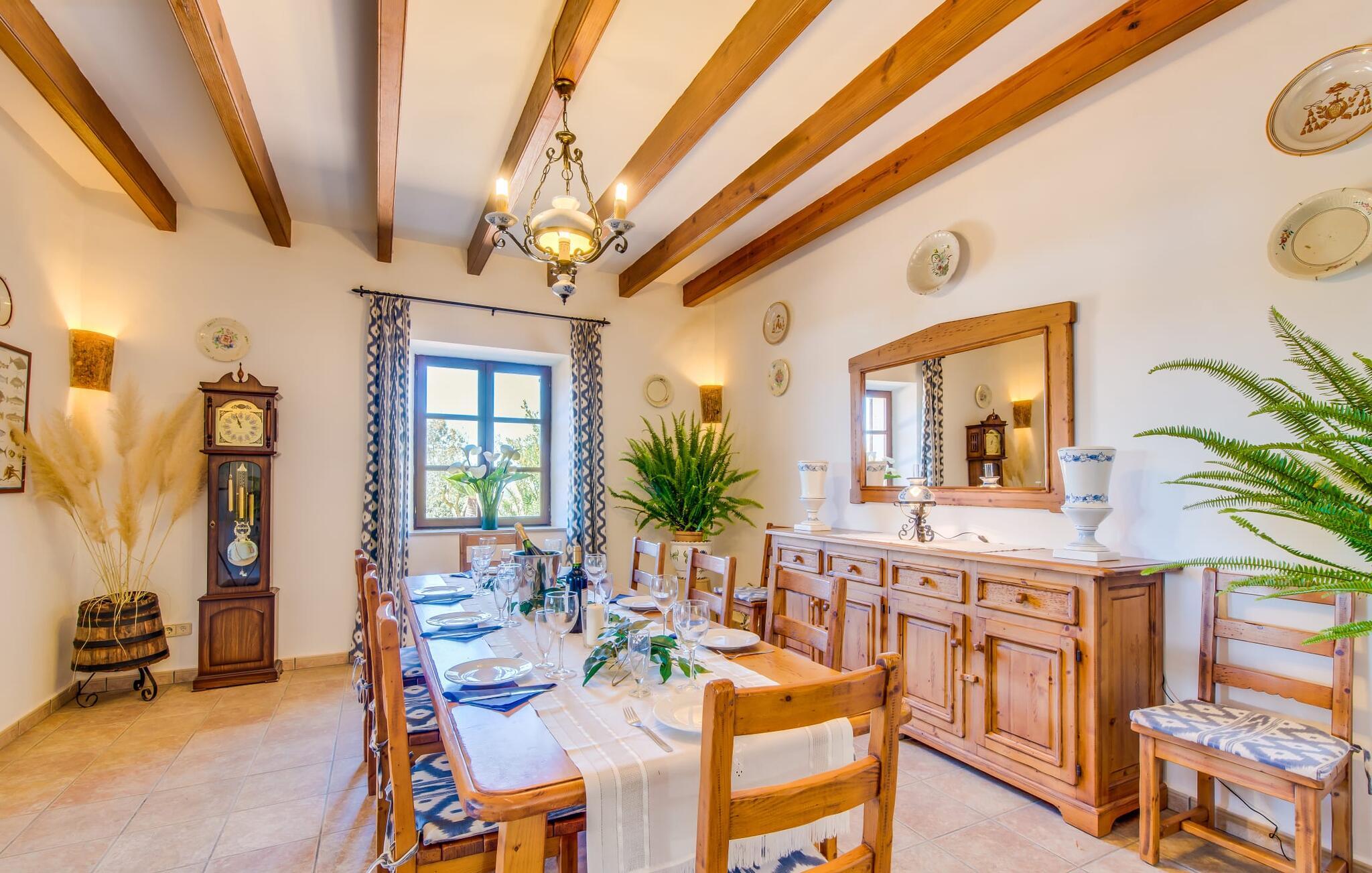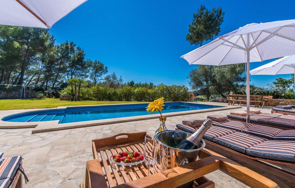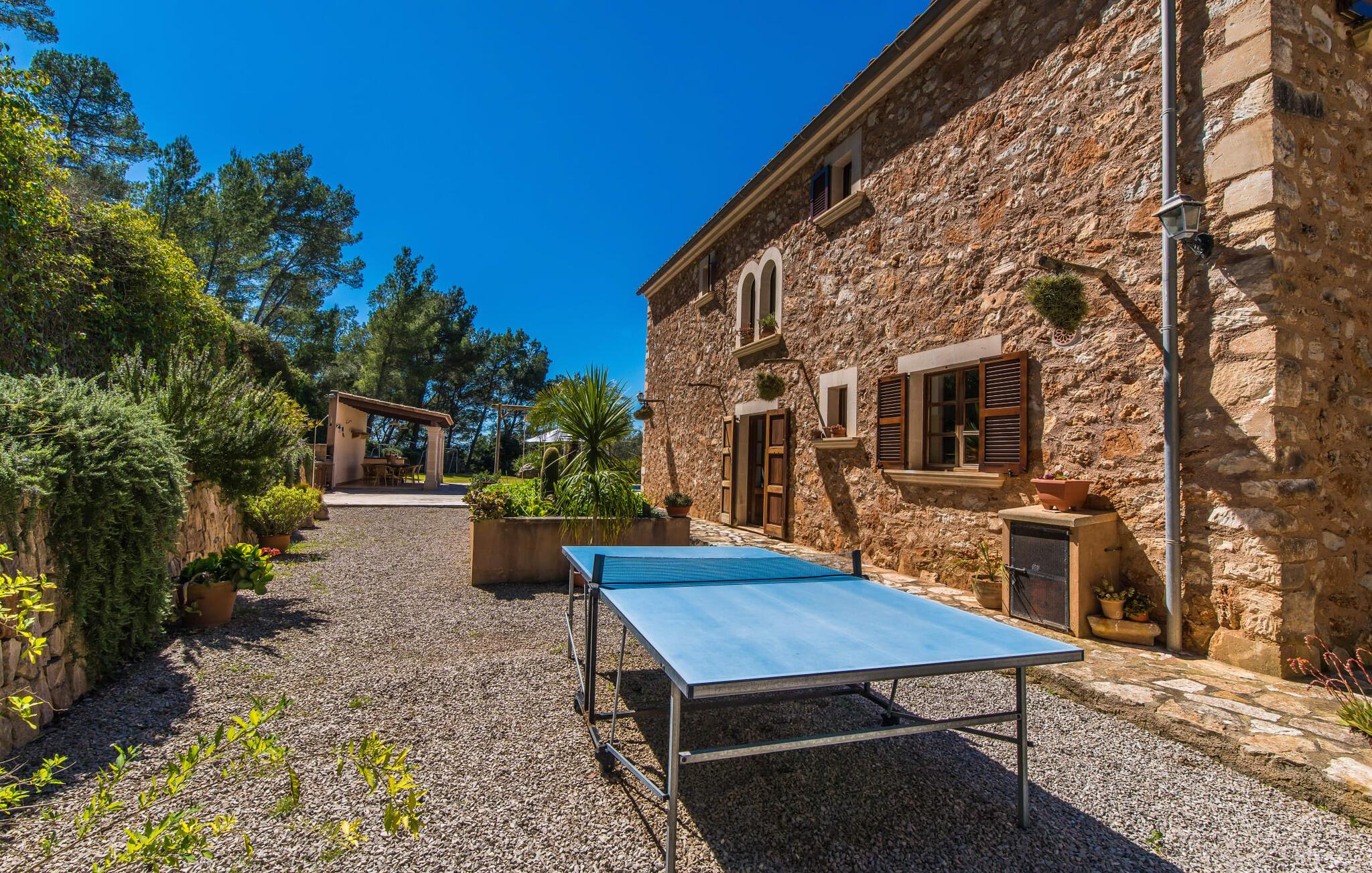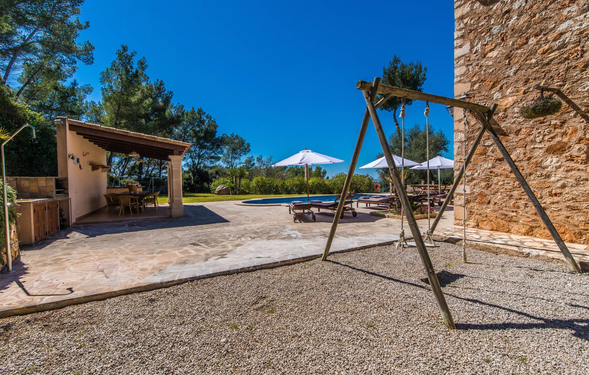 Hvis I vælger at tilbringe jeres ferie på Villa Binifardo Carritxo, kan I forberede jer på at fordybe jer i den mallorcanske livsstil fra det øjeblik I ankommer til det øjeblik I rejser - nyd den betagende udsigt over den østlige del af øen fra ejendommen ved foden af en tyndt skovklædt bakke, mens I på den anden side kan beundre de majestætiske Tramuntana-bjerge. Når I vil tage en pause fra solen, skal I blot trække jer tilbage til den overdækkede terrasse. Ellers er poolen med sit vidunderlige friske vand, der kærtegner jeres hud, det perfekte sted at nyde villaens exceptionelle atmosfære. Husets smukke stenbrudsfacade emmer af varme og tryghed og haven er stor nok til at alle børn i jeres gruppe kan rende rundt i. Uanset om det er på gyngerne, til en lille fodboldturnering eller med en omgang bordtennis, så keder de små sig bestemt ikke, mens I læser en god bog på en af liggestolene, nyder solen, går en tur gennem haven. med palmer og løvtræer eller med Forberedelserne begynder til aftengrillen. Den friske, milde luft vil med garanti vække jeres appetit – så det er virkelig praktisk, at det fremragende vedligeholdte udendørsområde er så indbydende og varieret, at I kan bruge meget tid udendørs; Men husets indretning lader heller ikke noget tilbage at ønske. Den har en typisk mallorcansk stil, der kombinerer mørke trætoner med subtile og muntre farver. Fra det herskabelige indgangsparti fører en trappe til øverste etage, hvor der er tre soveværelser med dobbeltsenge og to badeværelser - hvoraf det ene har badekar. Et særligt højdepunkt ved denne villa er mangfoldigheden af hyggelige siddepladser: på første sal er der en lille stue med panoramavindue samt et opholdsområde lige ved siden af trappen og tagterrassen giver en vidunderlig mulighed for at nyde skønne ferieoplevelser sammen med jeres medrejsende. Soveværelserne er praktiske og enkelt indrettede og har mange vinduespartier, der oversvømmer rummene med lys. jeres skønne stue med fladskærms-tv venter jer i stueetagen - hvis I har lyst til at koble af med en god film. Spisestuen på tværs af gangen danner en sublim ramme om festlige måltider. I det tilstødende køkken finder I også et spisebord og en pejs, der vidner om bygningens historie. Men der er ikke noget nostalgisk over villaens indretning: Mange apparater, herunder køleskabet med fryserum, er førsteklasses og formidler en ægte følelse af luksus. Det vidunderlige landskab omkring villaen emmer af ro - østkystens idylliske strande, den såkaldte Calas de Mallorca, med deres karakteristiske forrevne klippeformationer og paradisiske bugter kan nås med lejebil på knap en halv time. Til shopping anbefaler vi Manacor, 20 km væk, som er særligt kendt for sine lædervarer. Den rolige by Felanitx ligger kun 5 km væk. Der kan I udforske et af øens vartegn, klosteret Sant Salvador, eller nyde den afslappede atmosfære på søndagsmarkedet. Den statelige villa "Binifardo Carritxo" har mange trumfkort i ærmet: en smuk have med en fortryllende panoramaudsigt over det romantiske bakkelandskab, kun 12,5 km fra det smukke Cala Marçal med sit glitrende turkise vand. Og også mange gode udflugtsmål, herunder den rolige Felanitx, hvor I kan fylde op med forsyninger på søndagsmarkedet eller bestige klosteret Sant Salvador. Golfbanen Vall D'Or ligger kun 7 km væk.