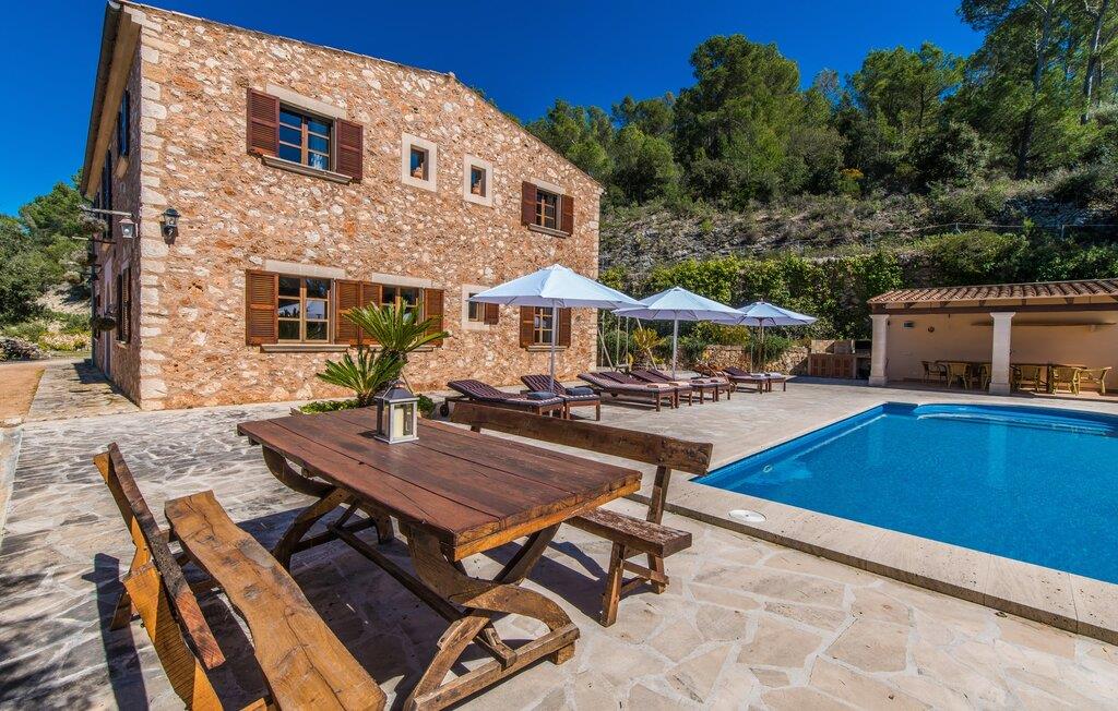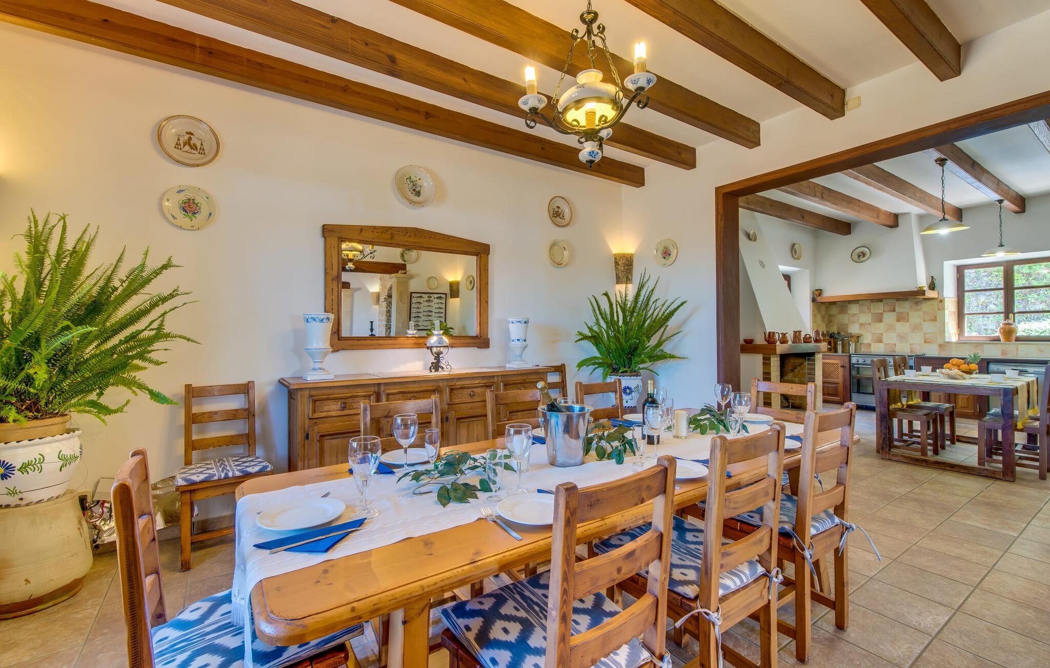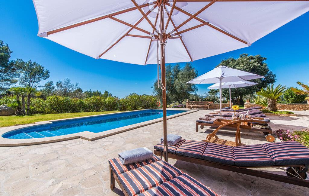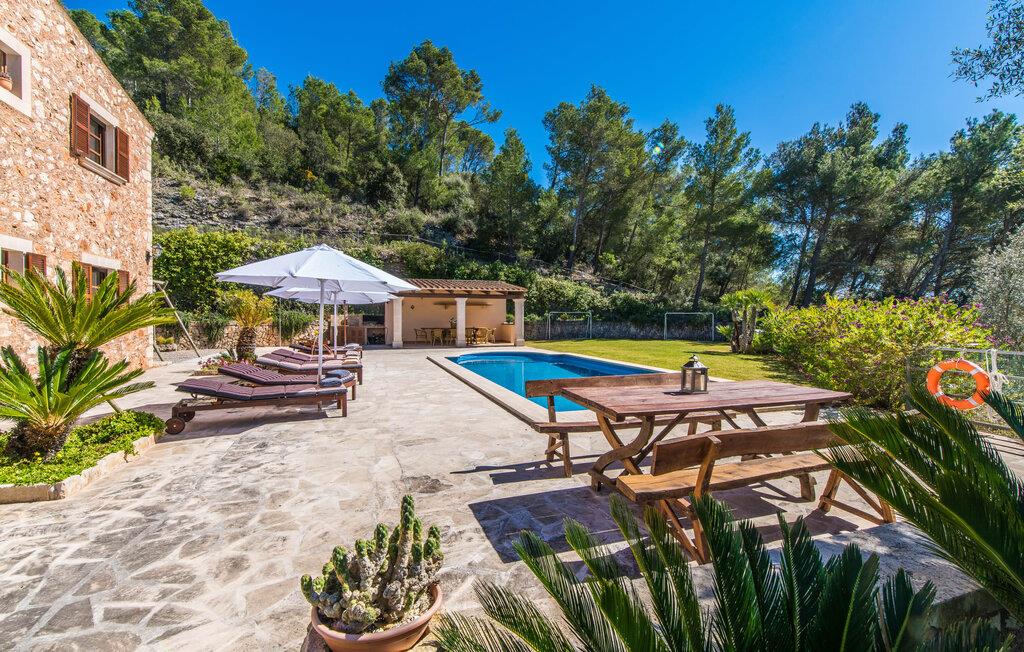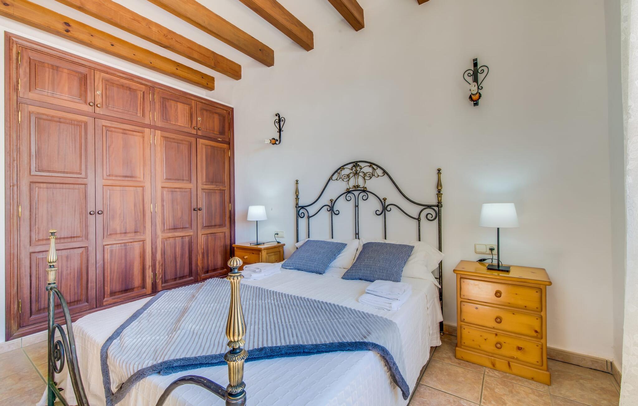 Hvis I vælger at tilbringe jeres ferie på Villa Binifardo Carritxo, kan I forberede jer på at fordybe jer i den mallorcanske livsstil fra det øjeblik I ankommer til det øjeblik I rejser - nyd den betagende udsigt over den østlige del af øen fra ejendommen ved foden af en tyndt skovklædt bakke, mens I på den anden side kan beundre de majestætiske Tramuntana-bjerge. Når I vil tage en pause fra solen, skal I blot trække jer tilbage til den overdækkede terrasse. Ellers er poolen med sit vidunderlige friske vand, der kærtegner jeres hud, det perfekte sted at nyde villaens exceptionelle atmosfære. Husets smukke stenbrudsfacade emmer af varme og tryghed og haven er stor nok til at alle børn i jeres gruppe kan rende rundt i. Uanset om det er på gyngerne, til en lille fodboldturnering eller med en omgang bordtennis, så keder de små sig bestemt ikke, mens I læser en god bog på en af liggestolene, nyder solen, går en tur gennem haven. med palmer og løvtræer eller med Forberedelserne begynder til aftengrillen. Den friske, milde luft vil med garanti vække jeres appetit – så det er virkelig praktisk, at det fremragende vedligeholdte udendørsområde er så indbydende og varieret, at I kan bruge meget tid udendørs; Men husets indretning lader heller ikke noget tilbage at ønske. Den har en typisk mallorcansk stil, der kombinerer mørke trætoner med subtile og muntre farver. Fra det herskabelige indgangsparti fører en trappe til øverste etage, hvor der er tre soveværelser med dobbeltsenge og to badeværelser - hvoraf det ene har badekar. Et særligt højdepunkt ved denne villa er mangfoldigheden af hyggelige siddepladser: på første sal er der en lille stue med panoramavindue samt et opholdsområde lige ved siden af trappen og tagterrassen giver en vidunderlig mulighed for at nyde skønne ferieoplevelser sammen med jeres medrejsende. Soveværelserne er praktiske og enkelt indrettede og har mange vinduespartier, der oversvømmer rummene med lys. jeres skønne stue med fladskærms-tv venter jer i stueetagen - hvis I har lyst til at koble af med en god film. Spisestuen på tværs af gangen danner en sublim ramme om festlige måltider. I det tilstødende køkken finder I også et spisebord og en pejs, der vidner om bygningens historie. Men der er ikke noget nostalgisk over villaens indretning: Mange apparater, herunder køleskabet med fryserum, er førsteklasses og formidler en ægte følelse af luksus. Det vidunderlige landskab omkring villaen emmer af ro - østkystens idylliske strande, den såkaldte Calas de Mallorca, med deres karakteristiske forrevne klippeformationer og paradisiske bugter kan nås med lejebil på knap en halv time. Til shopping anbefaler vi Manacor, 20 km væk, som er særligt kendt for sine lædervarer. Den rolige by Felanitx ligger kun 5 km væk. Der kan I udforske et af øens vartegn, klosteret Sant Salvador, eller nyde den afslappede atmosfære på søndagsmarkedet. Den statelige villa "Binifardo Carritxo" har mange trumfkort i ærmet: en smuk have med en fortryllende panoramaudsigt over det romantiske bakkelandskab, kun 12,5 km fra det smukke Cala Marçal med sit glitrende turkise vand. Og også mange gode udflugtsmål, herunder den rolige Felanitx, hvor I kan fylde op med forsyninger på søndagsmarkedet eller bestige klosteret Sant Salvador. Golfbanen Vall D'Or ligger kun 7 km væk.