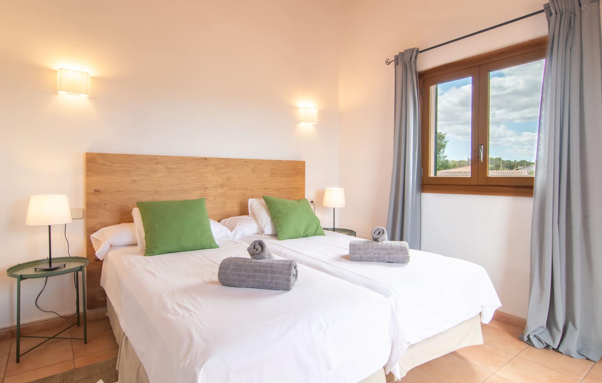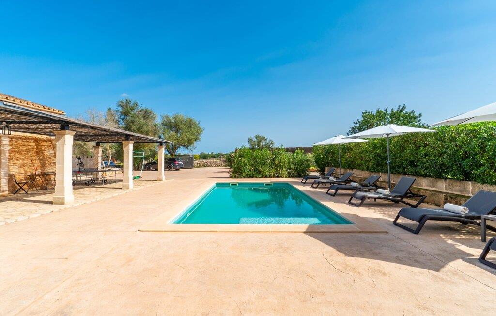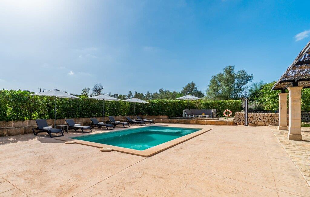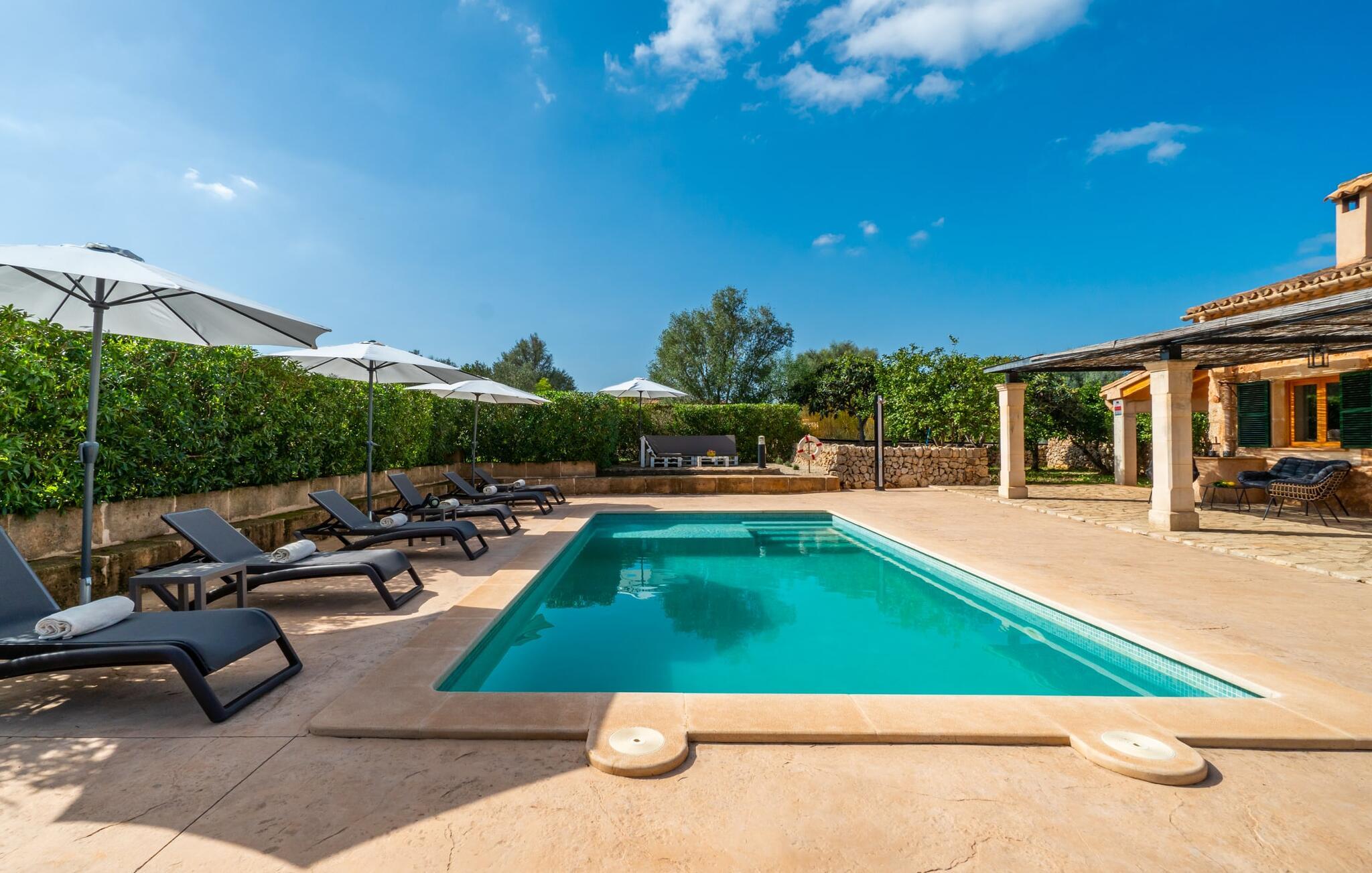 Leder I efter jeres eget lille tilflugtssted på landet? Et sted at have det godt – med pool, solterrasse og oliventræer? Så er Villa “Binitaref” det helt rigtige valg for jer! Det charmerende naturstenshus med klassiske mørkegrønne skodder ligger ugeneret, sydvendt på en grund på knap 7.000 m², hvoraf man kan nyde en vidunderlig udsigt fra de mange, delvist overdækkede terrassearealer omkring huset. Men kun hvis I kan se væk fra poolen, der glitrer i solen og er omgivet af en smuk stenmur, der indbyder til en forfriskende svømmetur eller to. Efter svømning skal I blot tage en lur på en af de komfortable liggestole - vidunderligt! Hvis I foretrækker at slippe dampen, kan I spille volleyball med jeres medrejsende og derefter nyde lækkerierne tilberedt på grillen og serveret ved det elegante glasbord på terrassen. Mens det udvendige område af "Binitaref" ser mere rustikt ud i den typiske villastil, er det indvendige område moderne, lyst og venligt møbleret og designet. I den rummelige stueetage er der også den hyggelige stue med to komfortable sofaer, hvorfra I enten kan se den knitrende ild eller blot se TV. Et stilrent spisebord er bekvemt placeret i køkkenet, så I ikke skal rejse langt med fyldte bakker. Mæt og træt kan I trække jer tilbage til et af de tre behageligt diskrete dobbeltværelser med aircondition. To af dem er i stueetagen, den ene er på øverste etage og er tilgængelig via en luftig trappe. To stilfulde badeværelser, begge med badekar og et med en-suite, runder den absolut overbevisende boligkomfort i jeres sommerhus af. Hvis I kan lide at tilbringe tid udendørs, nyde gåture, vandreture og cykelture, så er "Binitaref" det ideelle udgangspunkt. Bare begynd at vandre eller cykle, de landbrugsmæssige omgivelser er betagende! Sineu, Costitx (med dets observatorium), Sencelles, Sant Joan og Lloret de Vistalegre betragtes som Mallorcas virkelige hjerte! Måske tror I ikke på myten om, at verdens akse ligger under klokketårnet i kirken Sineu. Hvad vi ved er, at denne maleriske lille landlige by har alt, hvad feriegæster kan ønske sig: gamle legender, kulturelle værdier, gode restauranter som Moli Den Pau, beliggende i en vindmølle, og talrige vinkældre, hvoraf nogle også serverer solide mallorcanske retter. Besøgende fra alle dele af øen strømmer til det ugentlige husdyrmarked om onsdagen, og skilte fra det centrale Sa Plaça fører til interessante seværdigheder som klostre, kirker og palæer. Marker, vindmøller, olivenlunde og vinmarker præger øens centrum, som også kan udforskes på cykel. Og hvis I ikke vil gå glip af en dag på stranden: strandene i Badia d'Alcúdia, ca. 27 km væk, kan hurtigt nås... Moderne ophold i landlige omgivelser: Villa "Binitaref" i heart of Mallorca blev bygget i en vidunderlig solrig sydvendt beliggenhed midt i Bygget i marker og enge - simpelthen ideel til lange gå- og cykelture. Men ejendommen har også meget at byde på: I kan enten køle af i den skrånende pool, spille volleyball eller bare nyde at lave ingenting i en af de komfortable udendørs lænestole på den overdækkede terrasse. Den nærmeste strand ligger kun 27 km væk.