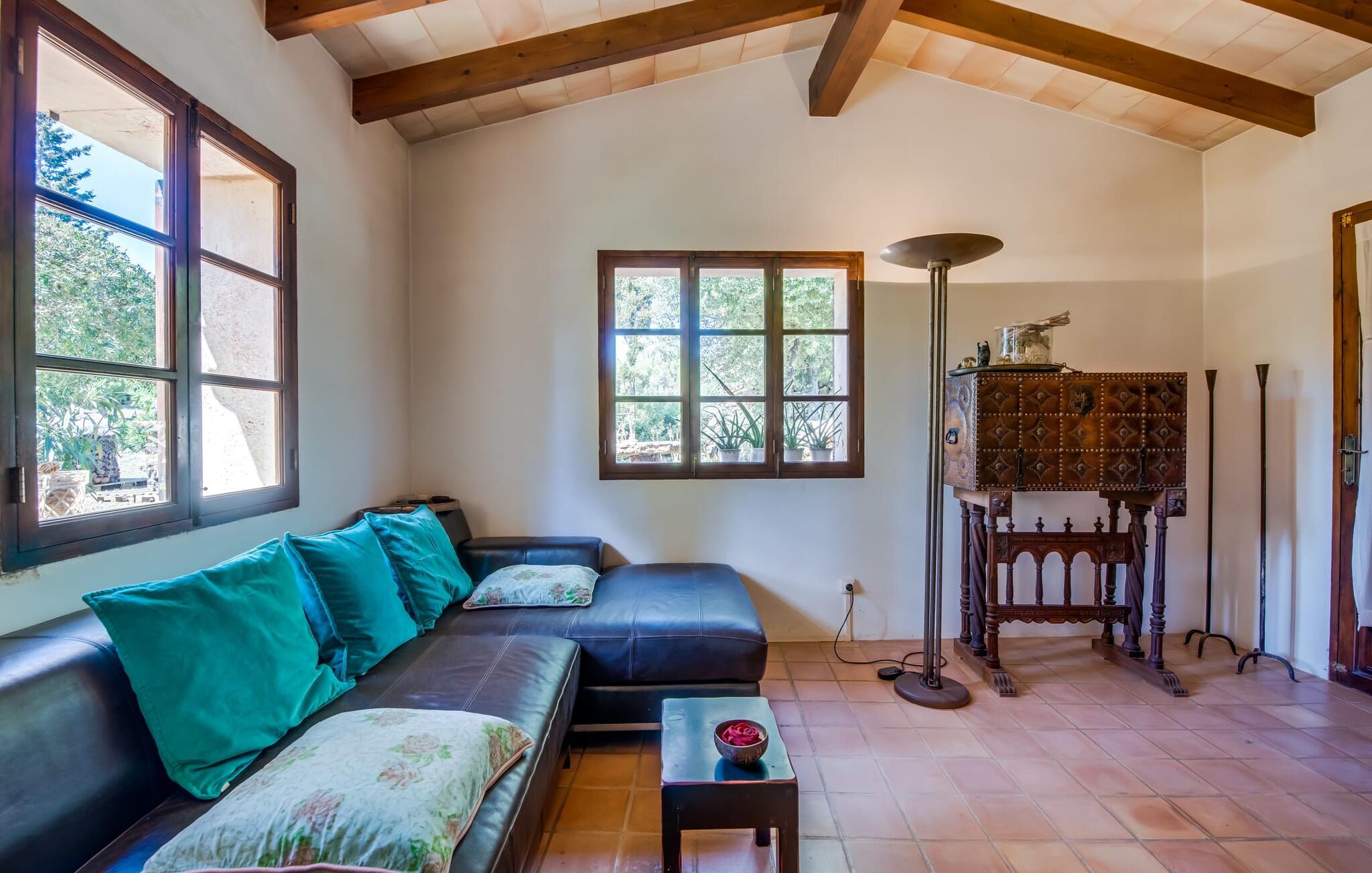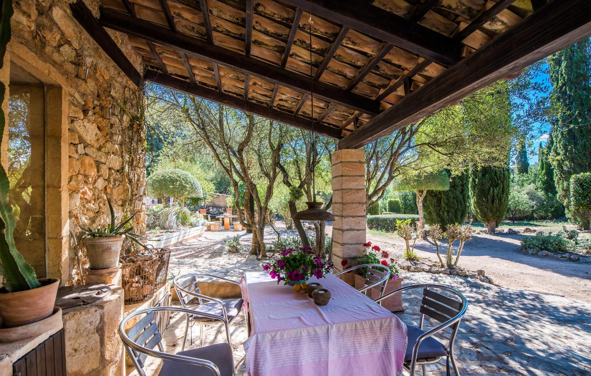 "Bona Feina", som betyder "godt gået" på catalansk, beskriver passende denne fortryllende villa på den østlige del af Mallorca. Dette charmerende naturstenshus har en unik planløsning og er omgivet af en smukt anlagt have med gamle oliventræer og høje cypresser. Omgivet af omfattende oliven- og mandellunde er villaen et paradis for naturelskere med får, æsler og legesyge lam. Familier vil sætte pris på den let forhøjede pool, omgivet af natursten og græsplæner, perfekt til solbadning eller afslapning under forteltet. En udendørs bruser byder på forfriskende muligheder hele året rundt. Villaen er indrettet med smagfuld indretning, herunder kunst og potteplanter, hvilket skaber en varm atmosfære. Den overdækkede terrasse er ideel til fælles måltider, ofte i selskab med villaens venlige bosiddende katte. Indvendigt kombinerer den åbne opholds- og spiseafdeling klarhed med unikke detaljer, herunder en lysekrone over spisebordet og en knitrende åben ild. Rustikke stenvægge og elegante bambusstivere forstærker rummeligheden. Det veludstyrede køkken har moderne bekvemmeligheder, mens det store soveværelse udstråler en hjemlig charme med sin queen-size seng. Andre soveværelser er ligeså indbydende, hvoraf det ene har udgang til en dejlig altan. Det lyse fælles badeværelse er udstyret med moderne bekvemmeligheder og sikrer et behageligt ophold for alle gæster. Fred og ro med en yderst æstetisk stemning: Den smukke naturstensvilla "Bona Feina" ligger i en absolut idyllisk beliggenhed, kun omkring 3 km fra den berømte kunstnerby Artà. Den smukke sandstrand Canyamel ligger kun omkring 13 km væk med jeres udlejningsbil.