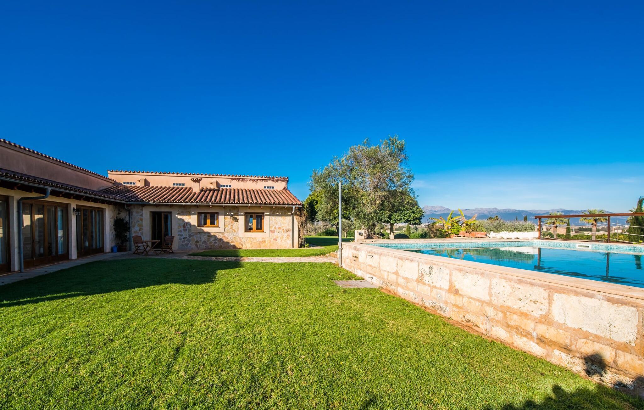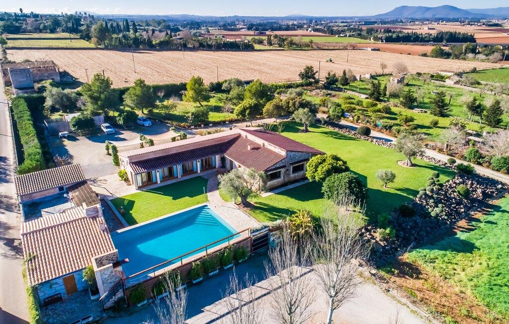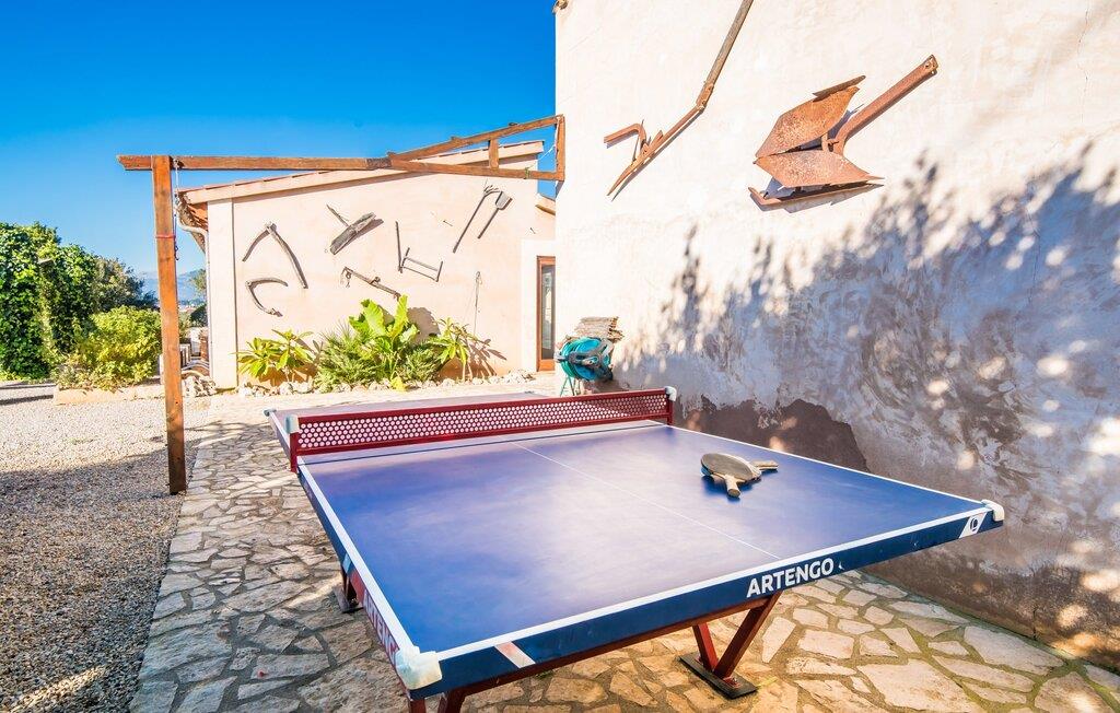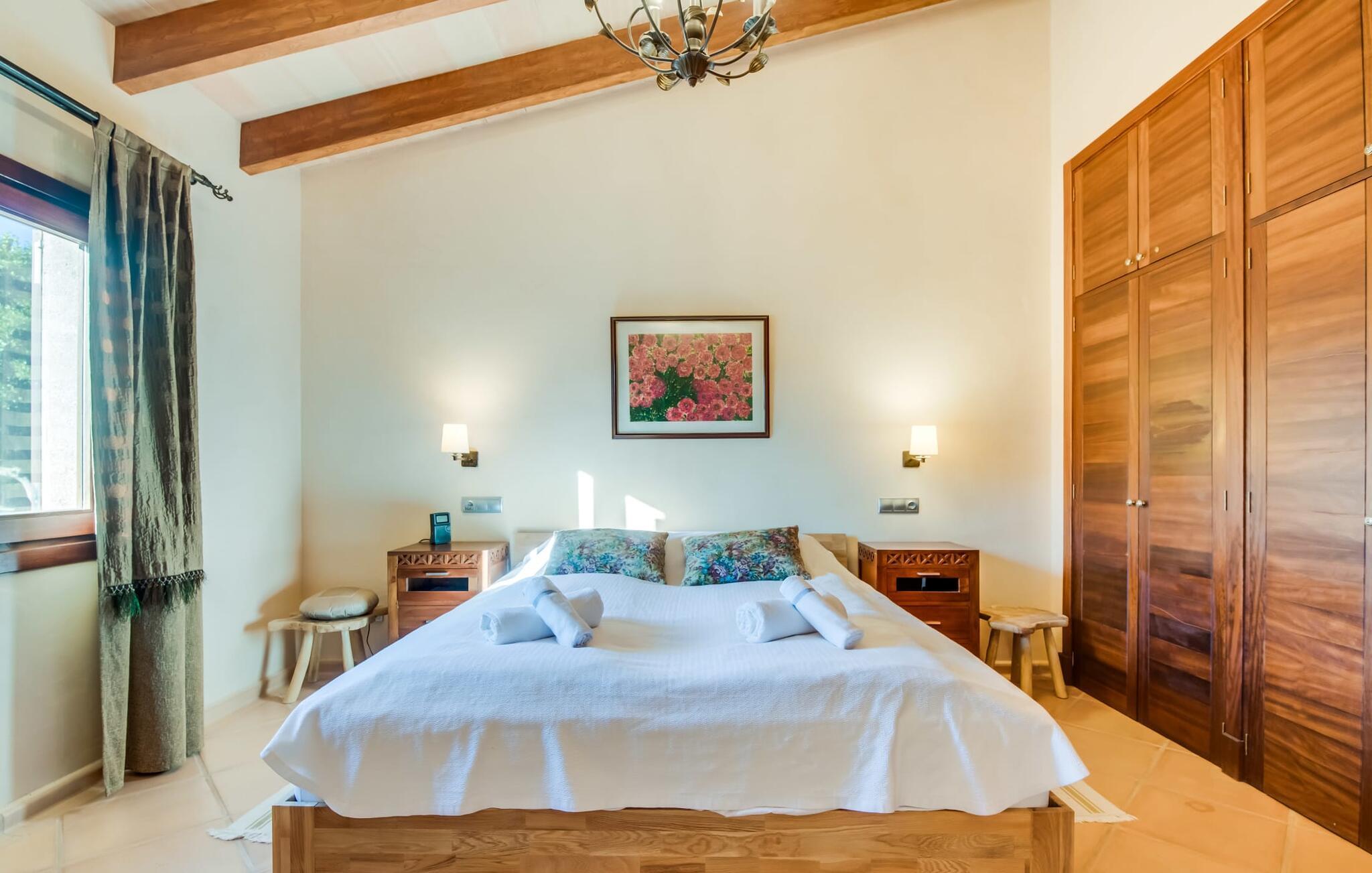 Denne smarte ejendom er et absolut behagelig bondehus på Mallorca, med masser af plads og en yderst velholdt stemning foran Tores Muros. I bor her i et meget landligt miljø og nyder en fantastisk udsigt over de nærliggende Tramuntana-bjerge. På hele 17.200 m² kan I blot brede jer ud og nyde de mange indbydende steder, som det stilfuldt indrettede område har at byde på. Uanset om det er overdækket, naturligt skyggefuldt eller åbent, uanset om det er på græsplæne, grus eller terrasse, på en liggestol eller en stol - alle vil med garanti finde deres bedste sted at slappe af her! Den 12 meter lange pool, som ikke kun har en behagelig trappe, men også en udendørs bruser og et vippebræt, er attraktiv. Bordtennisbordet bidrager til det sjove ved denne bondegård. Om aftenen får I måske lyst til at holde en grillaften, som I sammen kan fejre på den overdækkede terrasse lige ved siden af huset. Generøsitet er også dagens orden i stueetagen af fincaen og komplementerer effektivt den hyggelige indretning. Harmoniske farver, masser af træ og dygtigt udvalgt belysning og dekoration sætter klare standarder hvad angår æstetik. Den store stue-spisestue med forskellige steder at slappe af samt spisebord og direkte udgang til terrassen er særdeles indbydende. Det store fladskærms-tv er også installeret her. Køkkenet, fuldt udstyret med højkvalitetsapparater, er halvåbent og er med sin store kogeø ideel til at tilberede måltider. Herfra er der også direkte adgang til det fri. I den anden del af bygningen er der fem komfortabelt indrettede dobbeltværelser, hvoraf det ene har eget badeværelse. De andre soveværelser deler to ekstra badeværelser, hvilket sikrer tilstrækkelig privatliv, selv når de er fuldt besat. Denne charmerende bondegård på Mallorca scorer ikke kun point for sin nærhed til havet, men også for sin nærhed til havet, da det kun er omkring 15 minutter i bil fra Playa de Muro og kun ti fra Can Picafort. Der er heller ikke langt til Sa Pobla med sine gode indkøbsmuligheder. På grund af beliggenheden nær flere gader, som også kan høres akustisk afhængig af vinden, er transportforbindelserne særligt gode her. Den frodige og meget velholdte ejendom gør desuden længere ophold på gårdens område meget attraktivt.