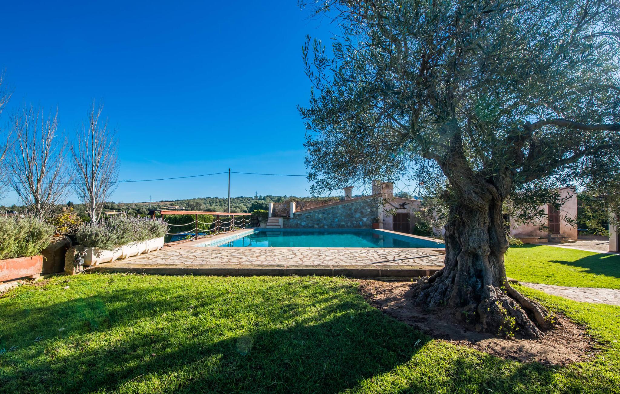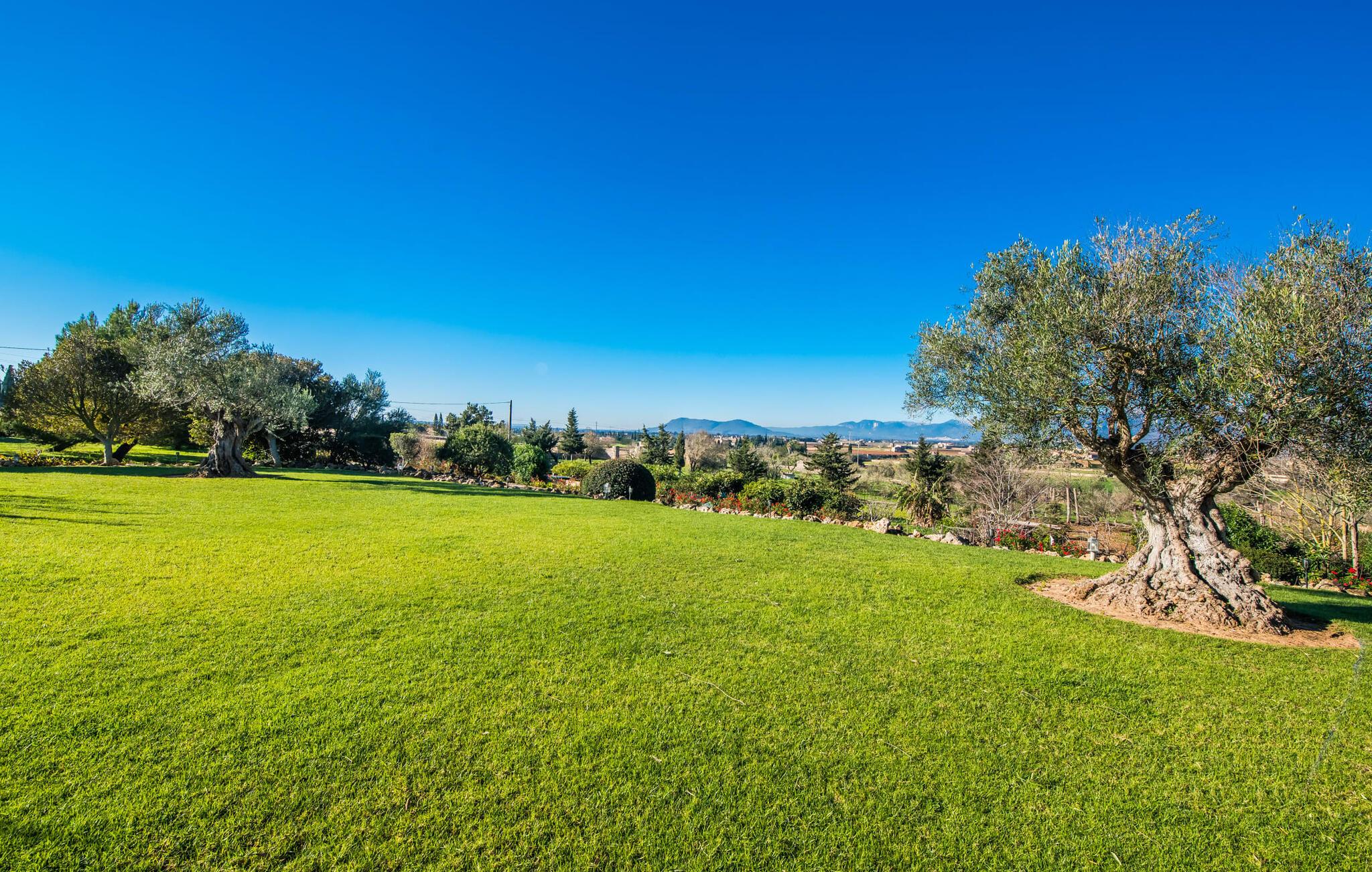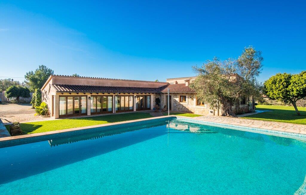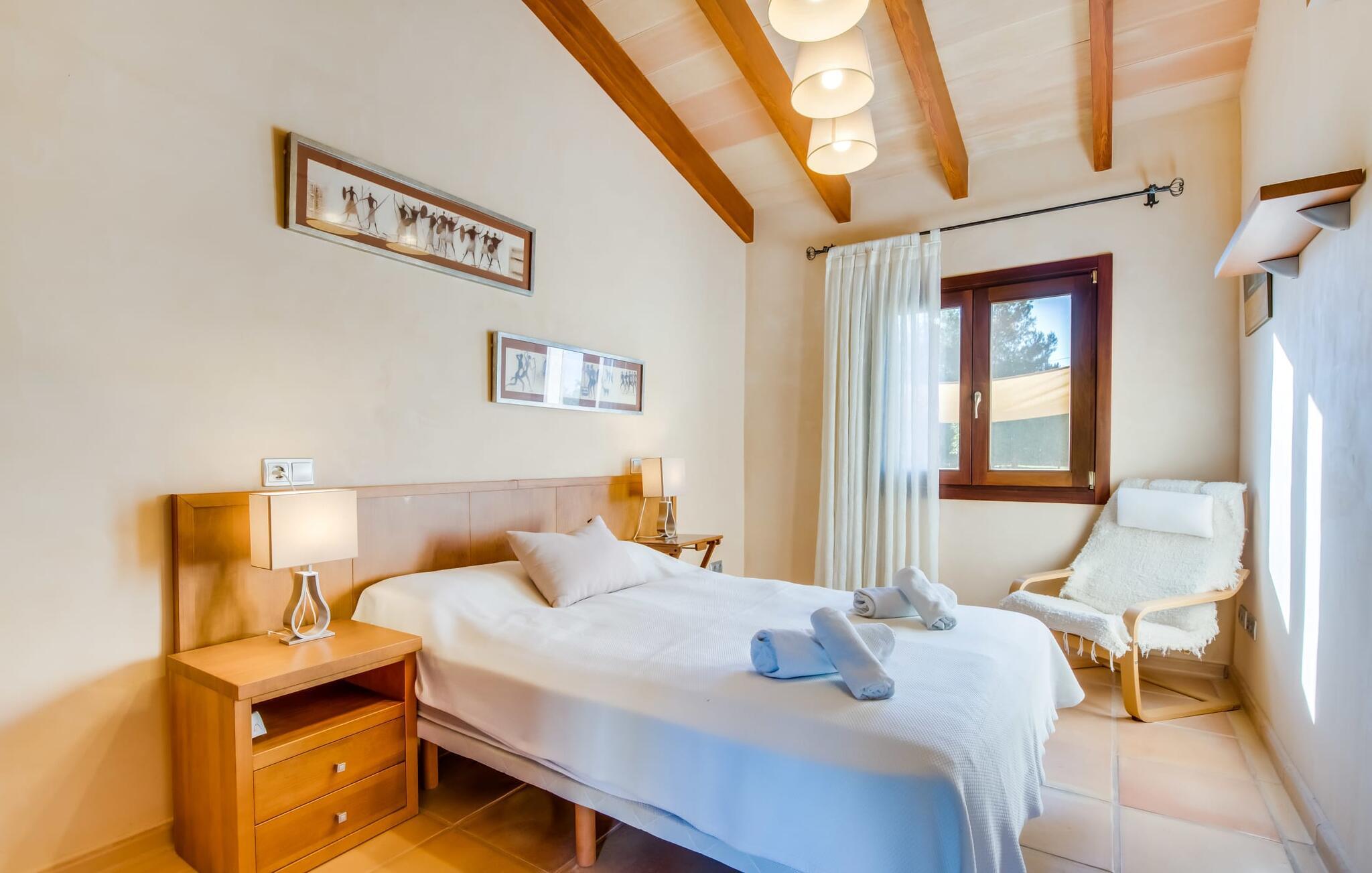 Denne smarte ejendom er et absolut behagelig bondehus på Mallorca, med masser af plads og en yderst velholdt stemning foran Tores Muros. I bor her i et meget landligt miljø og nyder en fantastisk udsigt over de nærliggende Tramuntana-bjerge. På hele 17.200 m² kan I blot brede jer ud og nyde de mange indbydende steder, som det stilfuldt indrettede område har at byde på. Uanset om det er overdækket, naturligt skyggefuldt eller åbent, uanset om det er på græsplæne, grus eller terrasse, på en liggestol eller en stol - alle vil med garanti finde deres bedste sted at slappe af her! Den 12 meter lange pool, som ikke kun har en behagelig trappe, men også en udendørs bruser og et vippebræt, er attraktiv. Bordtennisbordet bidrager til det sjove ved denne bondegård. Om aftenen får I måske lyst til at holde en grillaften, som I sammen kan fejre på den overdækkede terrasse lige ved siden af huset. Generøsitet er også dagens orden i stueetagen af fincaen og komplementerer effektivt den hyggelige indretning. Harmoniske farver, masser af træ og dygtigt udvalgt belysning og dekoration sætter klare standarder hvad angår æstetik. Den store stue-spisestue med forskellige steder at slappe af samt spisebord og direkte udgang til terrassen er særdeles indbydende. Det store fladskærms-tv er også installeret her. Køkkenet, fuldt udstyret med højkvalitetsapparater, er halvåbent og er med sin store kogeø ideel til at tilberede måltider. Herfra er der også direkte adgang til det fri. I den anden del af bygningen er der fem komfortabelt indrettede dobbeltværelser, hvoraf det ene har eget badeværelse. De andre soveværelser deler to ekstra badeværelser, hvilket sikrer tilstrækkelig privatliv, selv når de er fuldt besat. Denne charmerende bondegård på Mallorca scorer ikke kun point for sin nærhed til havet, men også for sin nærhed til havet, da det kun er omkring 15 minutter i bil fra Playa de Muro og kun ti fra Can Picafort. Der er heller ikke langt til Sa Pobla med sine gode indkøbsmuligheder. På grund af beliggenheden nær flere gader, som også kan høres akustisk afhængig af vinden, er transportforbindelserne særligt gode her. Den frodige og meget velholdte ejendom gør desuden længere ophold på gårdens område meget attraktivt.