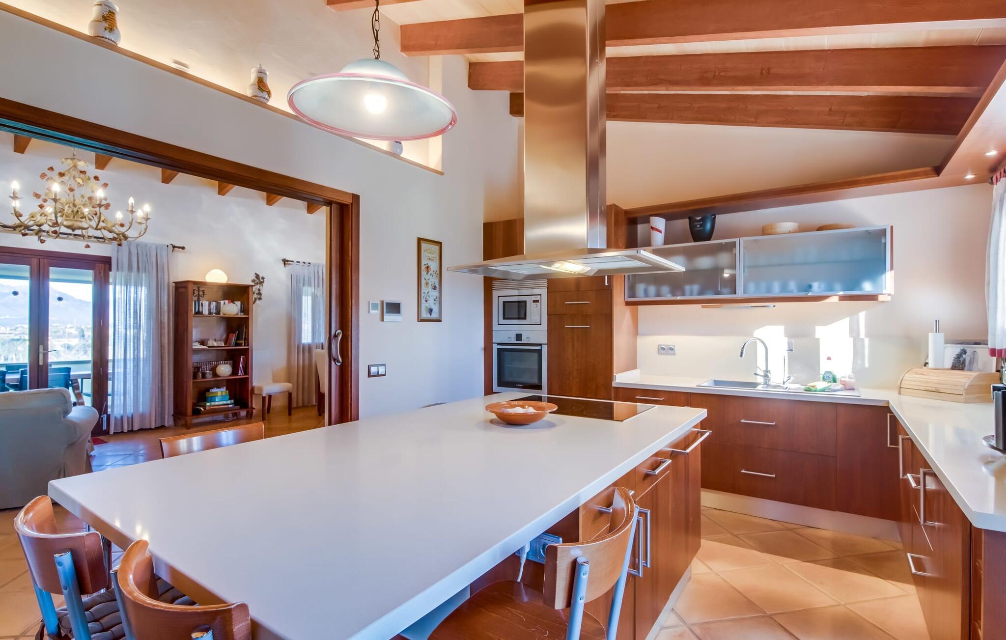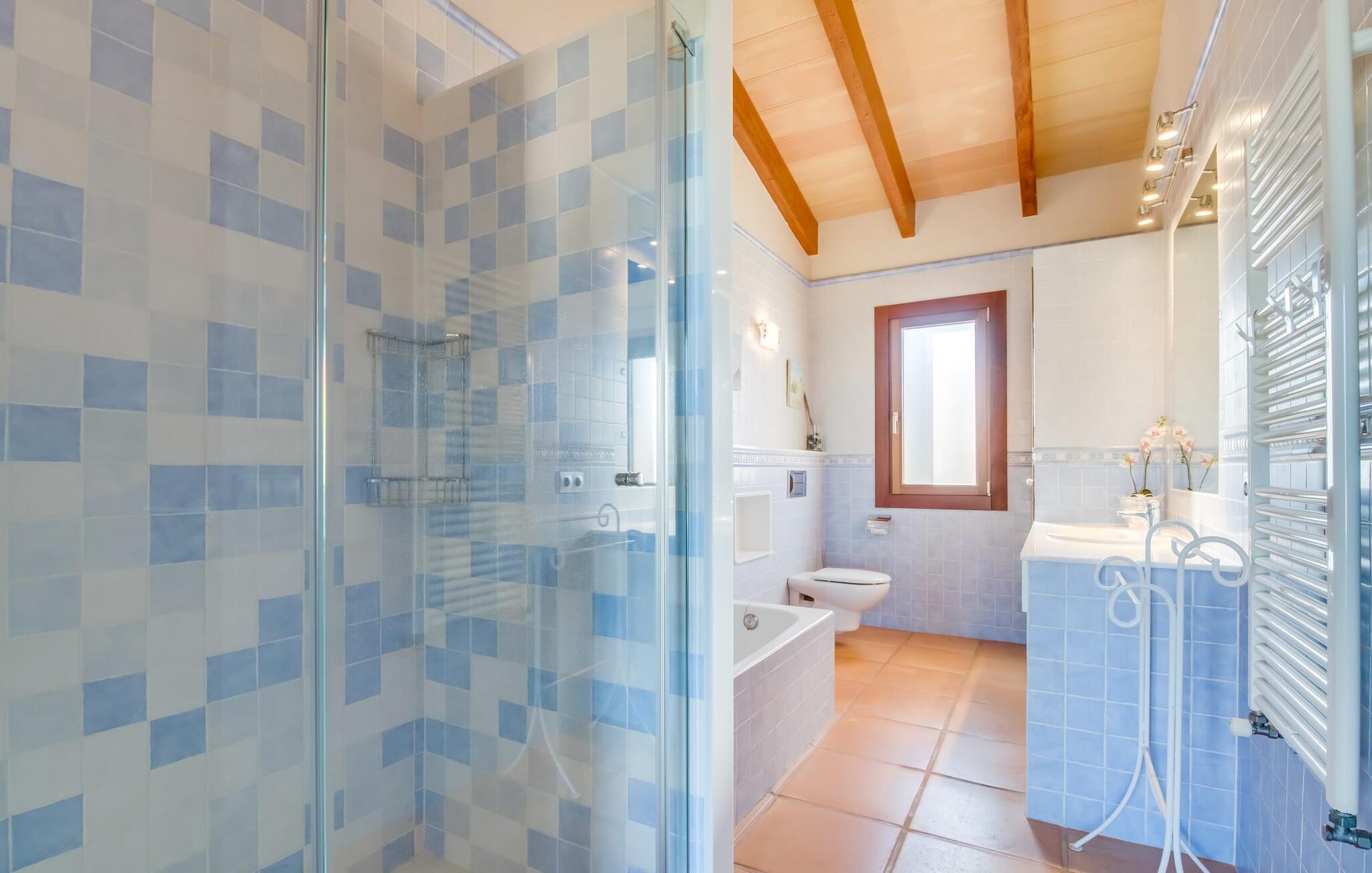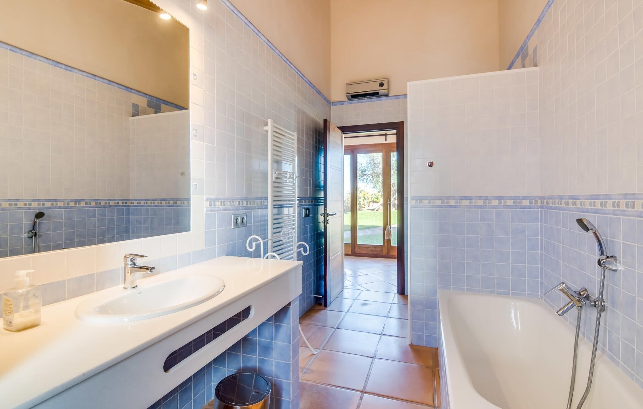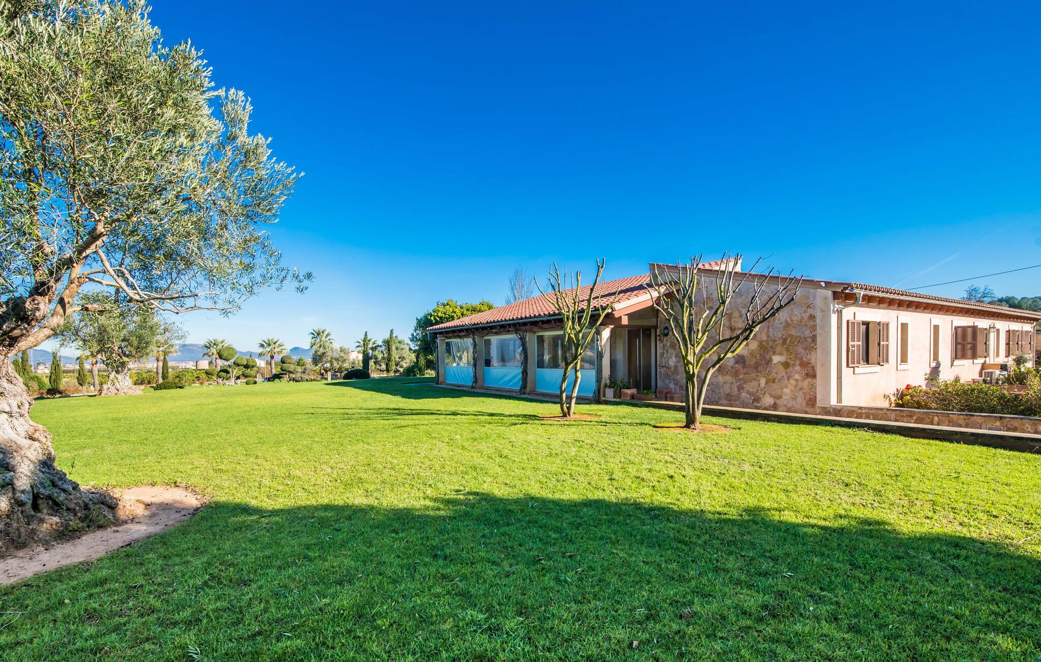 Denne smarte ejendom er et absolut behagelig bondehus på Mallorca, med masser af plads og en yderst velholdt stemning foran Tores Muros. I bor her i et meget landligt miljø og nyder en fantastisk udsigt over de nærliggende Tramuntana-bjerge. På hele 17.200 m² kan I blot brede jer ud og nyde de mange indbydende steder, som det stilfuldt indrettede område har at byde på. Uanset om det er overdækket, naturligt skyggefuldt eller åbent, uanset om det er på græsplæne, grus eller terrasse, på en liggestol eller en stol - alle vil med garanti finde deres bedste sted at slappe af her! Den 12 meter lange pool, som ikke kun har en behagelig trappe, men også en udendørs bruser og et vippebræt, er attraktiv. Bordtennisbordet bidrager til det sjove ved denne bondegård. Om aftenen får I måske lyst til at holde en grillaften, som I sammen kan fejre på den overdækkede terrasse lige ved siden af huset. Generøsitet er også dagens orden i stueetagen af fincaen og komplementerer effektivt den hyggelige indretning. Harmoniske farver, masser af træ og dygtigt udvalgt belysning og dekoration sætter klare standarder hvad angår æstetik. Den store stue-spisestue med forskellige steder at slappe af samt spisebord og direkte udgang til terrassen er særdeles indbydende. Det store fladskærms-tv er også installeret her. Køkkenet, fuldt udstyret med højkvalitetsapparater, er halvåbent og er med sin store kogeø ideel til at tilberede måltider. Herfra er der også direkte adgang til det fri. I den anden del af bygningen er der fem komfortabelt indrettede dobbeltværelser, hvoraf det ene har eget badeværelse. De andre soveværelser deler to ekstra badeværelser, hvilket sikrer tilstrækkelig privatliv, selv når de er fuldt besat. Denne charmerende bondegård på Mallorca scorer ikke kun point for sin nærhed til havet, men også for sin nærhed til havet, da det kun er omkring 15 minutter i bil fra Playa de Muro og kun ti fra Can Picafort. Der er heller ikke langt til Sa Pobla med sine gode indkøbsmuligheder. På grund af beliggenheden nær flere gader, som også kan høres akustisk afhængig af vinden, er transportforbindelserne særligt gode her. Den frodige og meget velholdte ejendom gør desuden længere ophold på gårdens område meget attraktivt.