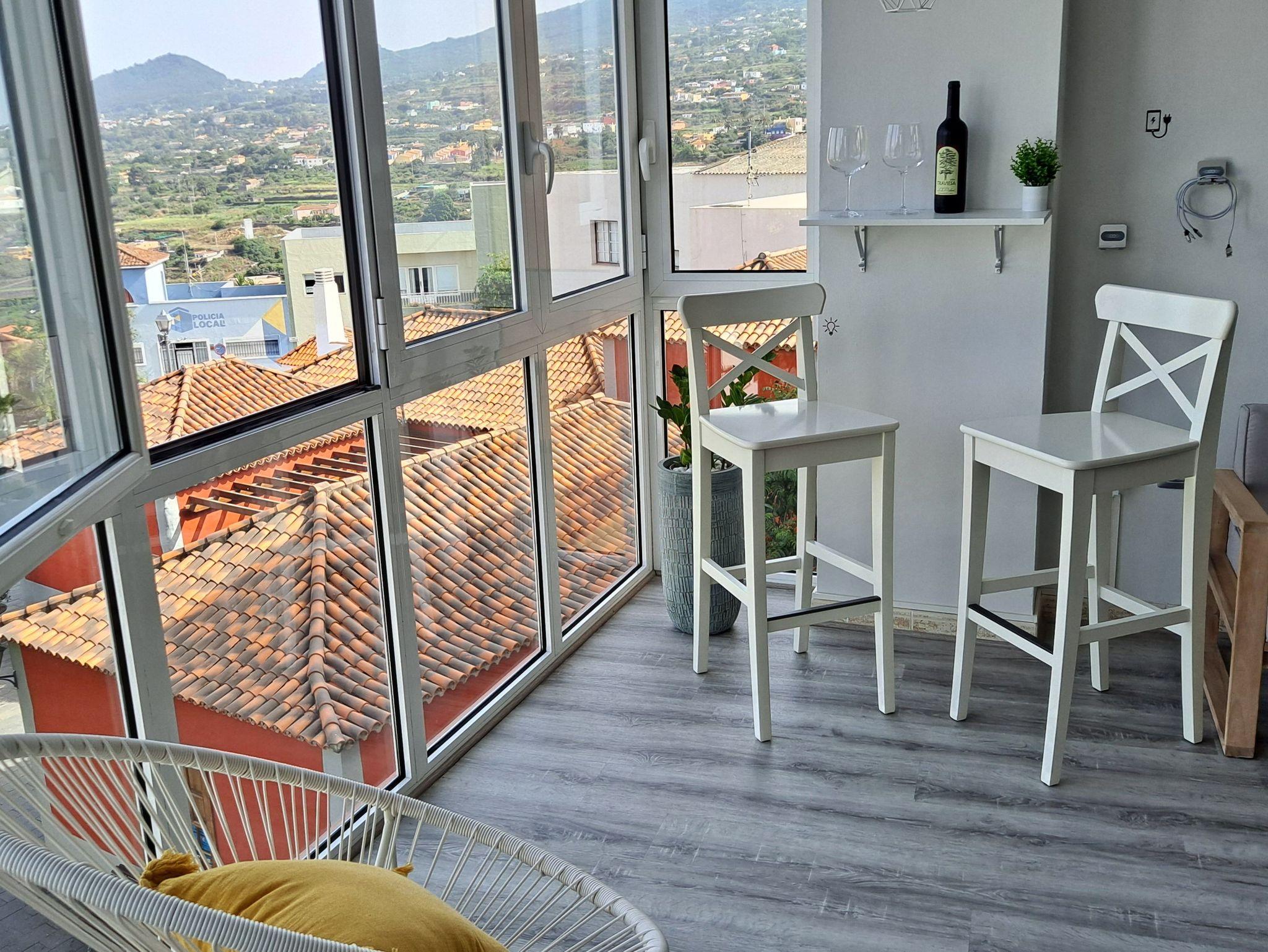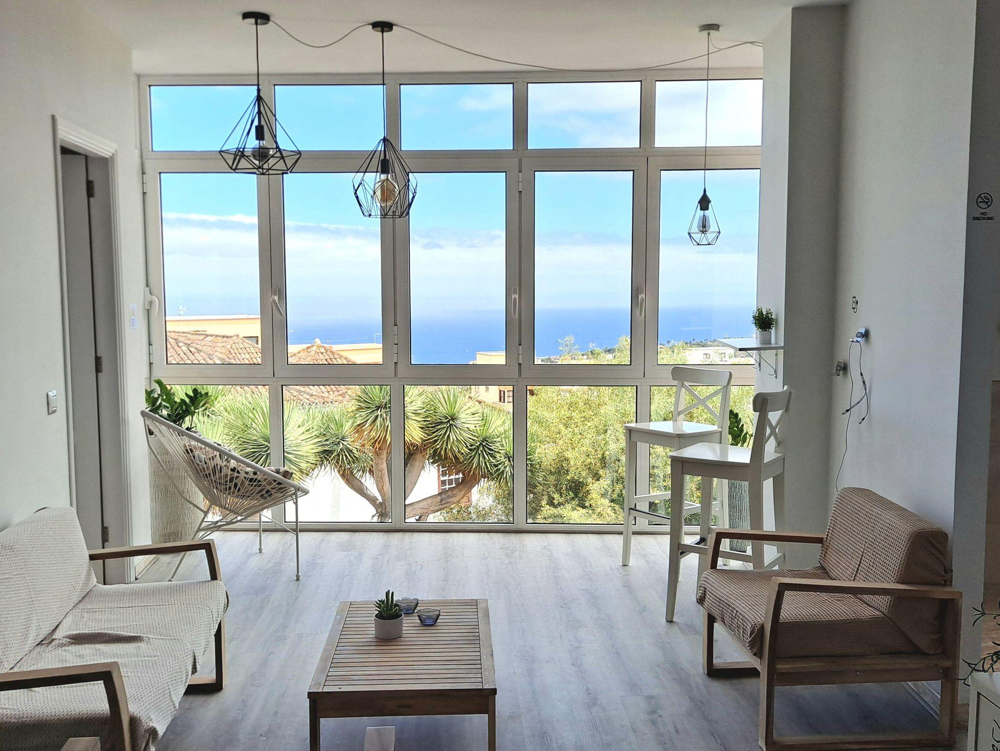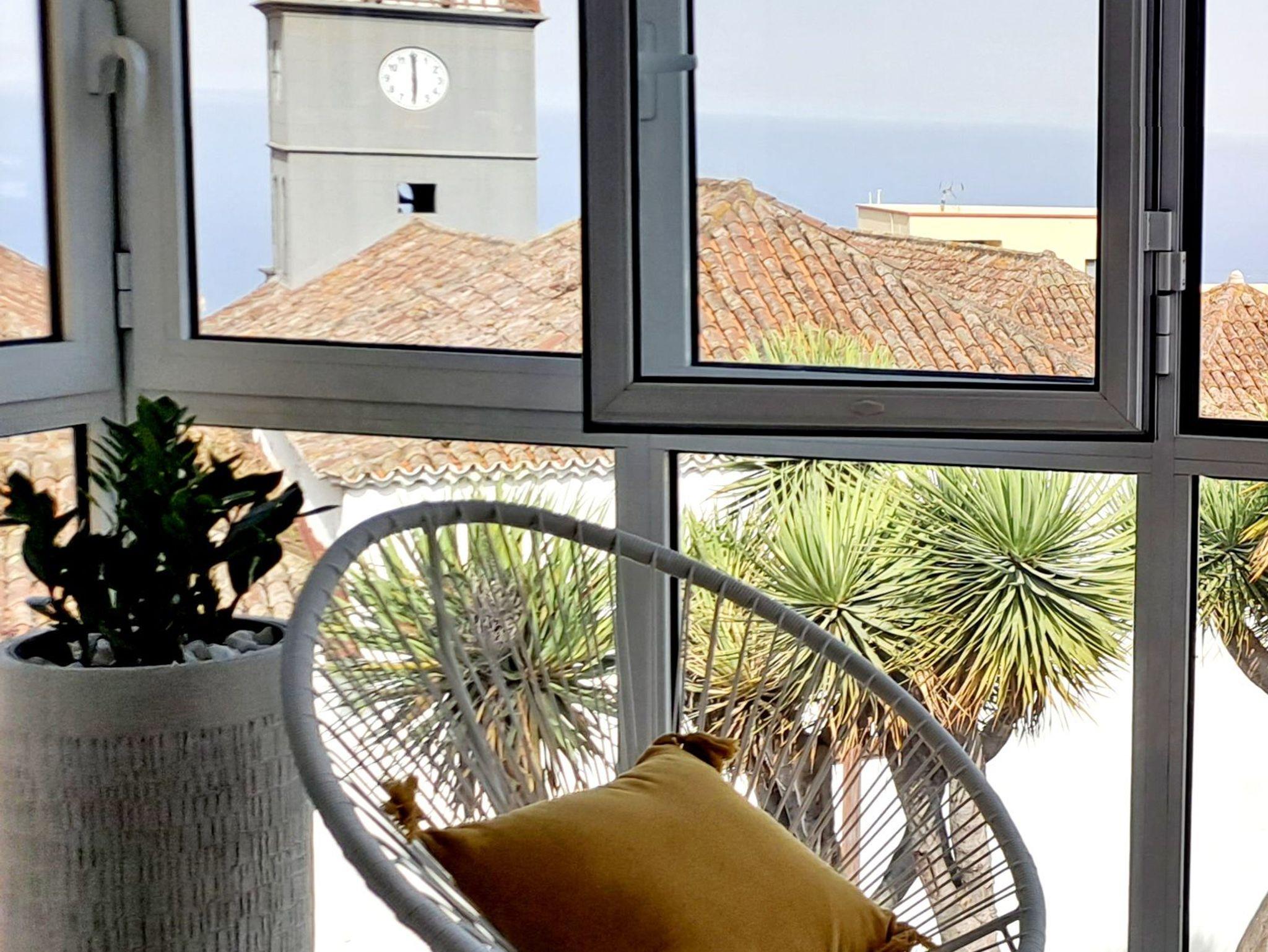 Apartment mit großer Fensterfront im Zentrum der Altstadt von San Pedro de Breña Alta mit Panoramablick auf die Weite des Atlantiks mit Blick auf die Inseln Teneriffa und La Gomera, die grünen und grünen Berge der Cumbre Nueva und den Himmel von La Isla de Las Estrellas“, neben dem emblematischen Glockenturm der Kirche von San Pedro Apóstol, dem Schutzpatron dieser Stadt.