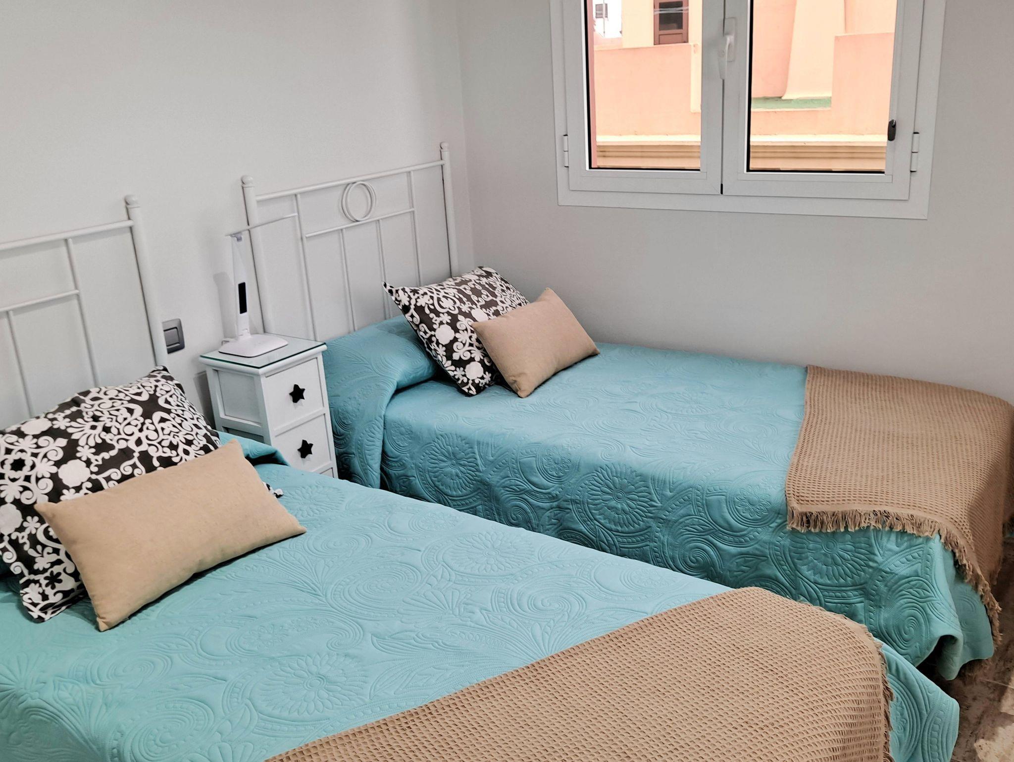 Im Schlafzimmer mit französischem Doppelbett steht ein großer Einbauschrank sowie ein kleiner Schreibtisch am Fenster. Ein Splitgerät (Klimaanlage/Heizung) sorgt für angenehme Temperaturen. Das zweite Schlafzimmer hat zwei getrennte Einzelbetten.