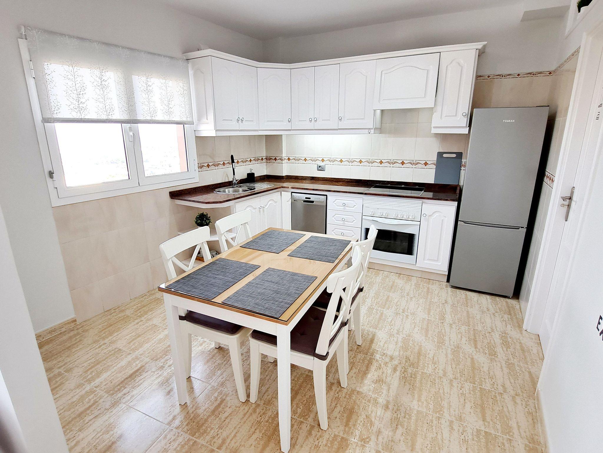 • Küchenzeile mit Elektroherd (4 Platten), Backofen, Dunstabzug, Mikrowelle, Toaster, Kaffemaschine, Kühl/Gefrierkombination, Spülmaschine, Theke mit zwei Hockern