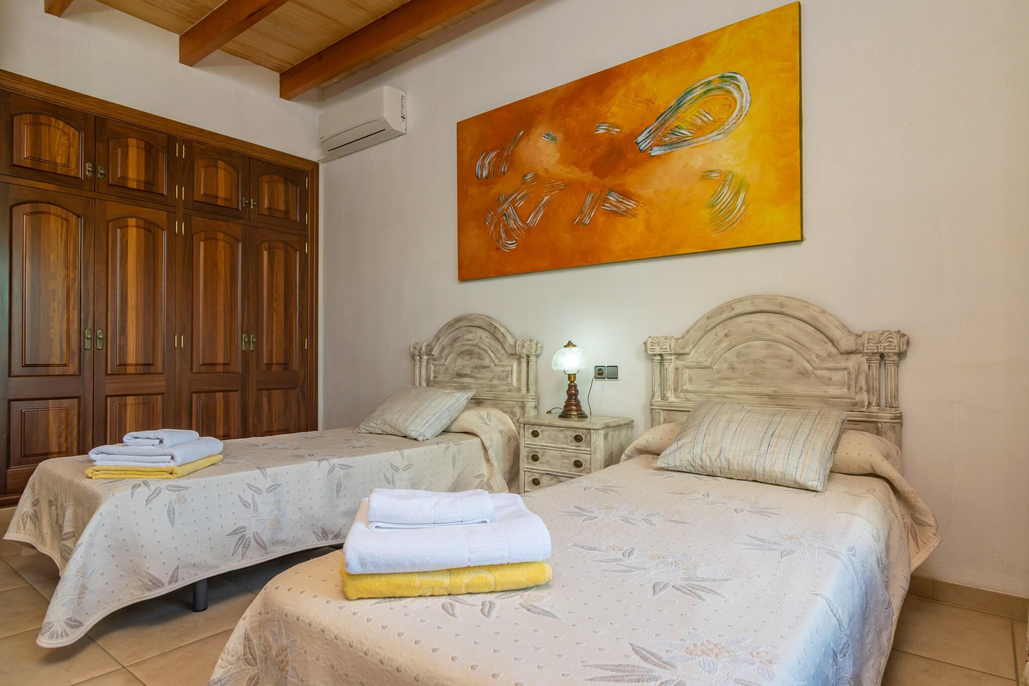Het chloorbad is enorm groot en heeft afmetingen van 16 x 8 meter en een diepte die varieert van 0,7 tot 2,2 meter. Het wordt omgeven door een zeer verzorgde mediterrane tuin, waar u kunt zonnebaden op zes ligstoelen, een aperitief kunt nuttigen onder de luifel of een verfrissende buitendouche kunt nemen. Kookt u graag buiten, dan vindt u op de gemeubileerde veranda een vaste barbecue. Daarnaast is er nog een veranda met uitzicht op het zwembad, een ideale plek om te ontbijten. Afhankelijk van het seizoen dragen verschillende fruitbomen, waaronder sinaasappel-, citroen- en perzikbomen, smakelijke vruchten. Deze woning is volledig privé en er zijn geen directe buren. Niet alleen van buiten, maar ook van binnen is dit pand een pareltje. Een ruime woon-eetkamer, ingericht met rustieke elementen en voorzien van alle apparatuur zoals airconditioning, dvd en satelliettelevisie, nodigt uit om u thuis te voelen. In het laagseizoen is het erg gezellig om een ??kopje thee te drinken bij de open haard. De aparte keuken is volledig uitgerust, zodat u kunt koken alsof u thuis bent. Wat de slaapkamers betreft, er is één met een tweepersoonsbed en twee met twee eenpersoonsbedden, allemaal met airconditioning en kledingkast. Twee badkamers, één met douche en de andere met ligbad, bedienen het huis. De wasmachine, strijkijzer en strijkplank bevinden zich in een van de badkamers. Voor onze kleinste gasten bieden wij maximaal twee wiegjes en twee kinderstoelen. Búger is een authentiek stadje in het noord-centrale deel van Mallorca, ongeveer 15 kilometer van de kust. In het centrum vindt u een supermarkt en restaurants. Er zijn meer diensten en grote supermarkten in de naburige stad Sa Pobla. Rond Búger zijn er veel landelijke wegen om te fietsen en wandelen. U kunt een bezoek brengen aan de ondergrondse bronnen van Campanet, die na hevige regenval beginnen te stromen, of een lange excursie maken naar het klooster van Lluc. Wat de stranden betreft: het dichtstbijzijnde zandstrand is Playa de Muro en het is een rustige plek omringd door duinen. Can Picafort en Puerto de Alcúdia zijn levendiger en beschikken over alle denkbare voorzieningen. Als u van wandelen houdt, kunt u van Alcúdia naar Can Picafort gaan, waarbij u het hele Playa de Muro doorkruist. Voor eventuele extra kosten kunt u contact opnemen met de adverteerder. Huisdieren zijn welkom. Het vieren van evenementen is niet toegestaan. Er is buiten parkeergelegenheid voor 4 auto's. Afstanden Strand: 15,6 km - Platja de Muro Luchthaven: 46,9 km - Luchthaven Son Sant Joan Golfbaan: 15,1 km - Golf Pollença Stad: 2,2 km - Buger Treinstation: 4,7 km - Sa Pobla Bushalte: 2,2 km - Plaça de la Constituci³, Buger Veerboot: 22,5 km - Haven Alcudia Ziekenhuis: 13,6 km - Comarcal d'Inca-ziekenhuis Toeristenvergunning: ETV/887