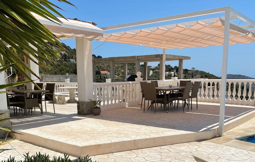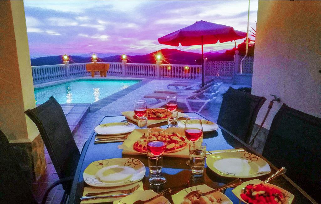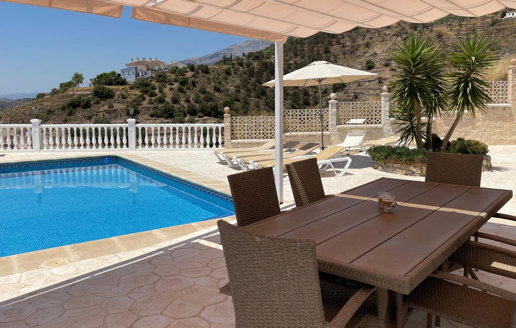 Udsigten fra grunden er fantastisk; I kan se det smukke bjerglandskab, ud over landsbyen, havet og Marokko i klart vejr. Der er terrasser i forskellige niveauer, blandt andet ved poolen, og bag ved huset er der anlagt en terrasse med den smukkeste udsigt.