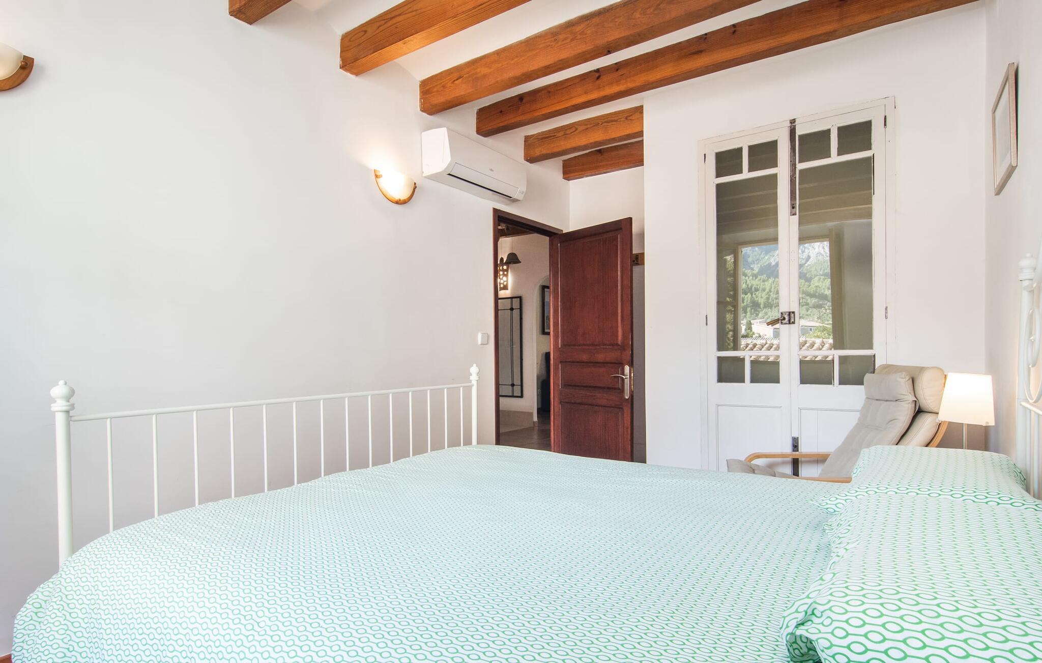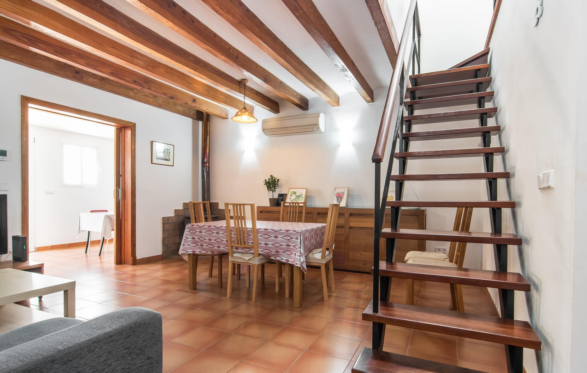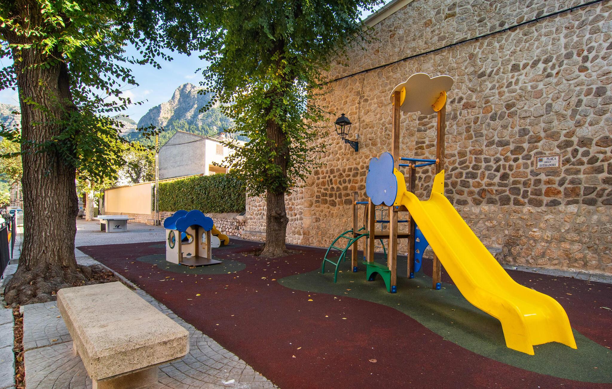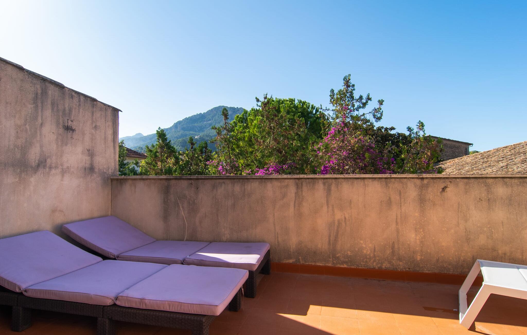 Dette attraktive rækkehus byder på en fantastisk udsigt over den imponerende kulisse af Tramuntana-bjergene. Den bekvemme beliggenhed giver også mulighed for spontane ture uden at skulle bruge bilen. Tag på vandretur i de nærliggende bjerge eller udforsk området på cykel! Hvis I gerne vil tilbringe en dag indendørs, finder I også indbydende steder at slappe af og blive hængende. Balkonen og tagterrassen byder på sidde- og afslapningsmuligheder direkte under Mallorcas himmel. Og hvis I har lyst til at gå en tur gennem landsbyen, skal I bare klatre ned af trapperne og gå. En anden mulighed er at finde et hyggeligt sted i husets rummelige interiør. Den åbne stue og spisestue med TV og pejs byder på flere muligheder. I kan også sidde i det tilstødende køkken. Derudover finder I et fuldt udstyret køkken, perfekt til selvforplejning. Udgangen til altanen er meget praktisk. På denne stueplan er der også et soveværelse med dobbeltseng og et værelse med en barneseng. Her er også et brusebad. På øverste etage er der yderligere to rummelige soveværelser og et badeværelse med bruser og badekar. Grundet det eksisterende varm-kolde klimaanlæg er dette rækkehus behageligt at bo i året rundt. En ferie i dette veludstyrede rækkehus på Mallorca betyder at have al den daglige infrastruktur lige uden for døren. I bor her kun 5 minutters gang fra den smukke bymidte. En række butikker og restauranter med smukke baghaver inviterer jer til at shoppe og slappe af. Stranden i Port de Sóller ligger ca. 5 km væk. En sporvogn, der kører flere gange om dagen, forbinder de to steder.