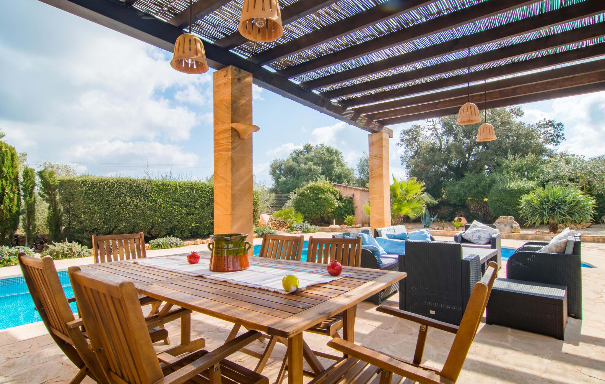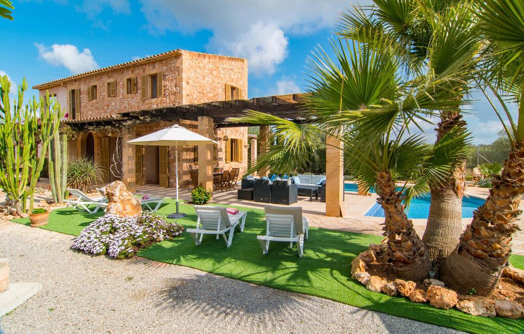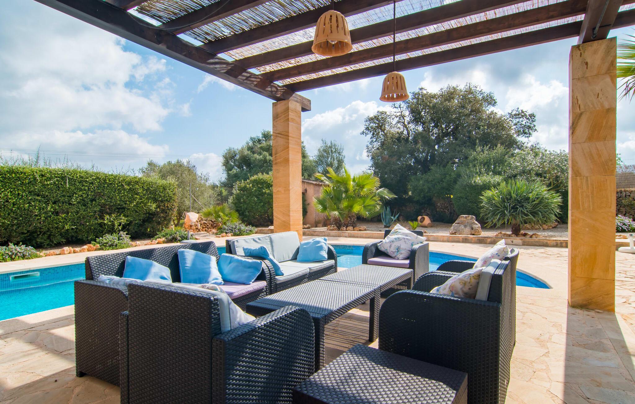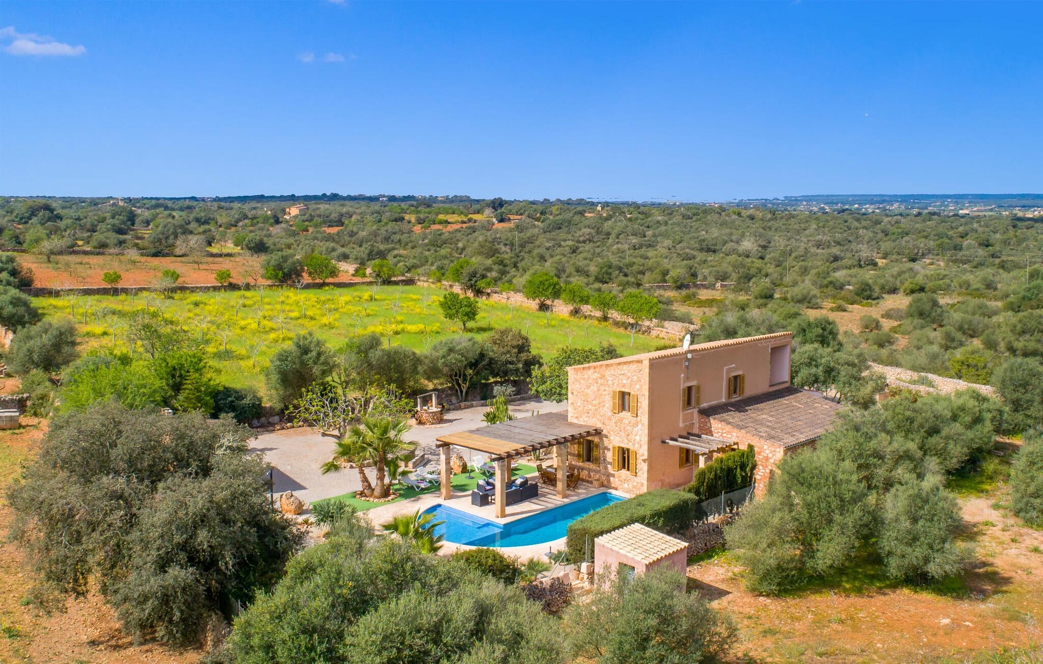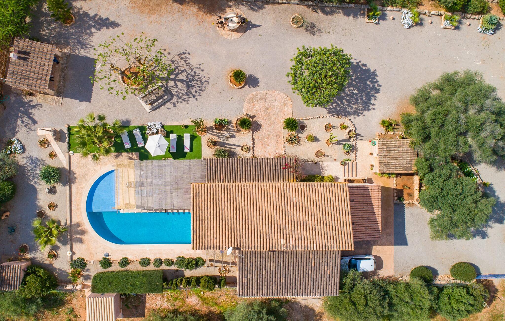 Man kunne næsten tro, at denne safranfarvede middelhavsvilla med sine oliven-, figen- og johannesbrødtræer, sine palmer, cypresser og kaktusser opstod fra selve Campos' frugtbare jord. Nybygget i 2015, lige så ærlig, ukompliceret og solmoden som en god vin, lidt mousserende steder og fuld af karakter, selv den første smag giver lyst til mere. En unik halvmåneformet pool omkring den overdækkede terrasse byder på alt det vand, I har brug for til jeres daglige svømmetur - et rigtigt blikfang! Her kan I afslutte dagen komfortabelt - med en sen morgenmad, et blad eller et glas vin - mens børnene plasker trygt rundt omkring jer. Man kunne næsten tale om en ferie i swimmingpoolen i stedet for ved poolen, og man kunne blive fristet til at hoppe direkte ud af et af vinduerne i det kølige vand (men lad være med det - det er hensynsløst, og I kommer til skade) . )...men "Ca Na Carmen" sikrer, at I ikke taber hovedet. Som en frugt, der holder, hvad dens ydre skal lover, skuffer indersiden heller ikke: Mallorca, jordnær, solrig og blomstret. En frisk brise synes at blæse gennem huset, og luftige gardiner giver rummet et let strejf. Den rummelige, åbne stue, madlavning og spiseplads omgiver hyggelige lyseblå sofaer, der inviterer jer til at fordybe jer i en filmaften. I kan selvfølgelig også drive ud i drømmenes rige i de behageligt enkle soveværelser med solide træsenge; Soveværelserne er indrettet med et udvalg af mørkere eller lysere møbler, og et af de øverste soveværelser har direkte adgang til en overdækket altan med vidunderlig udsigt over træerne til bjergene udenfor. Hvis I sover her, kan I lade døren stå åben. Badeværelserne - et i stueetagen og et på øverste etage - er hver delt af to soveværelser. Det eneste, der er tilbage at nævne, er det moderne, veludstyrede køkken med sin egen plads i solen, på hvis vægge friske, sprøde grøntsager fra det ugentlige marked i Campos hænger appetitligt: et paradis for vegetarer og rawfood-fans - hvis det var tilfældet. Det ville ikke være en fantastisk murstensgrill lige foran døren, der bare råber på at blive brugt. Det ville være en skam ikke at... ¡Buen provencho! I et landskab domineret af køer og marker er det nemt at få appetit op. Ud over dets middelalderlige centrum tilbyder den venlige by Campos nogle kulinariske insidertips, herunder den charmerende bistro Moda Café og Pastisseria Pomar, der er kendt over hele øen for sine mandelkager. Men begynder jeres vandrefødder at klø i “Ca Na Carmen” om sommeren, anbefaler vi en tur til Mallorcas sydspids. I Colònia de Sant Jordi inviterer restauranter og caféer, der ligger direkte på havnen, til at nyde havudsigten. Tag en 30-minutters bådtur til Cabrera (bogstaveligt talt "Gedeøen"), opdag det fortryllende lys fra Den Blå Grotte eller køl blot af i det krystalklare vand. Lyder det ikke som himlen på jorden? I en helt rolig, landlig beliggenhed og alligevel kun få kilometer på Ma-19 fra den lille by Campos med butikker og et supermarked, venter middelhavsvillaen "Ca Na Carmen" på gæster, der ønsker at udforske den sydlige del af øen. Santanyi, Ses Salines og Colònia de Sant Jordi på spidsen af øen er endnu ikke oversvømmet af turister og byder på vidunderlige naturlige sandstrande som Es Trenc eller den lille Cala Santanyi samt imponerende kystvandringer.