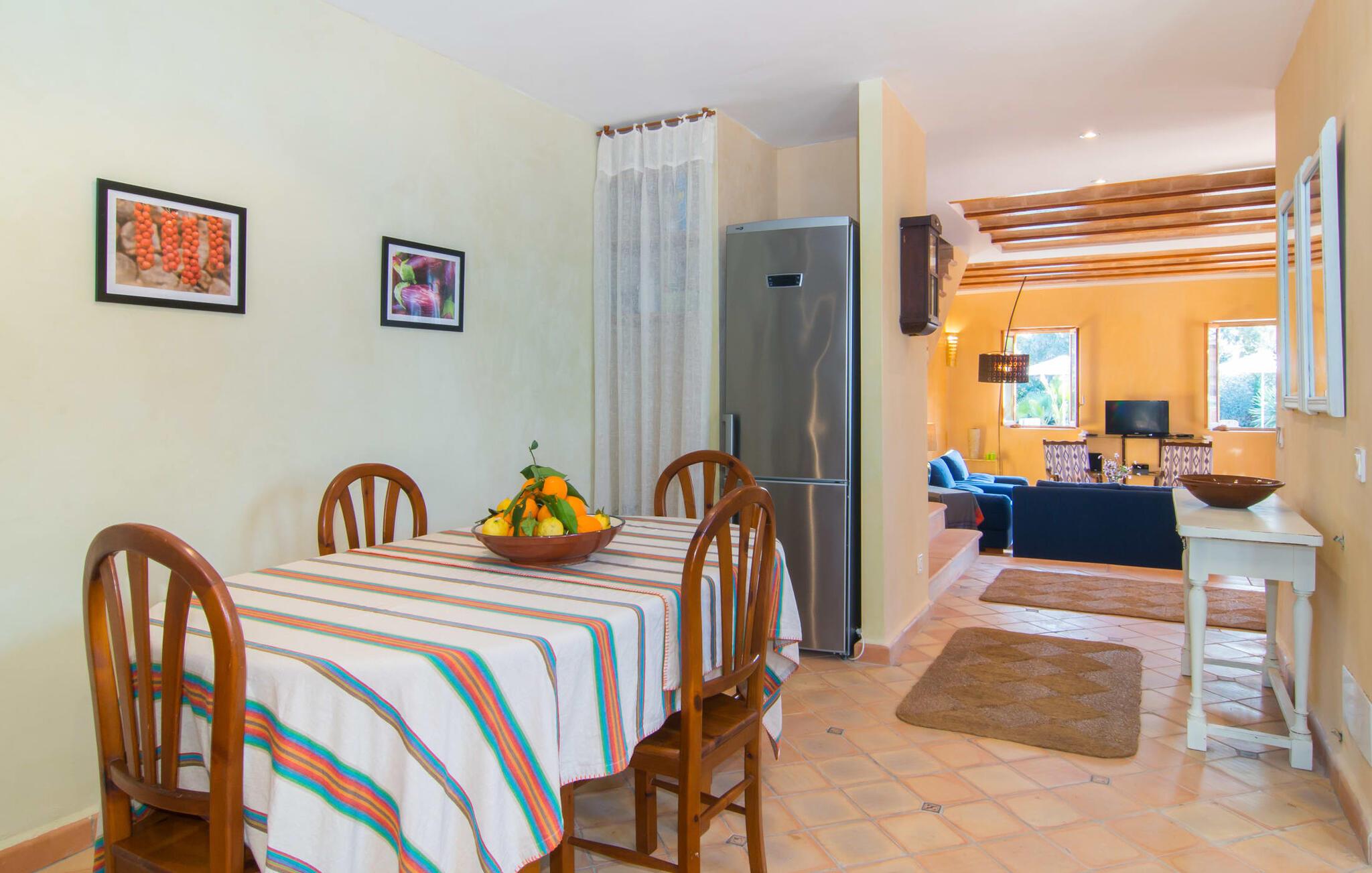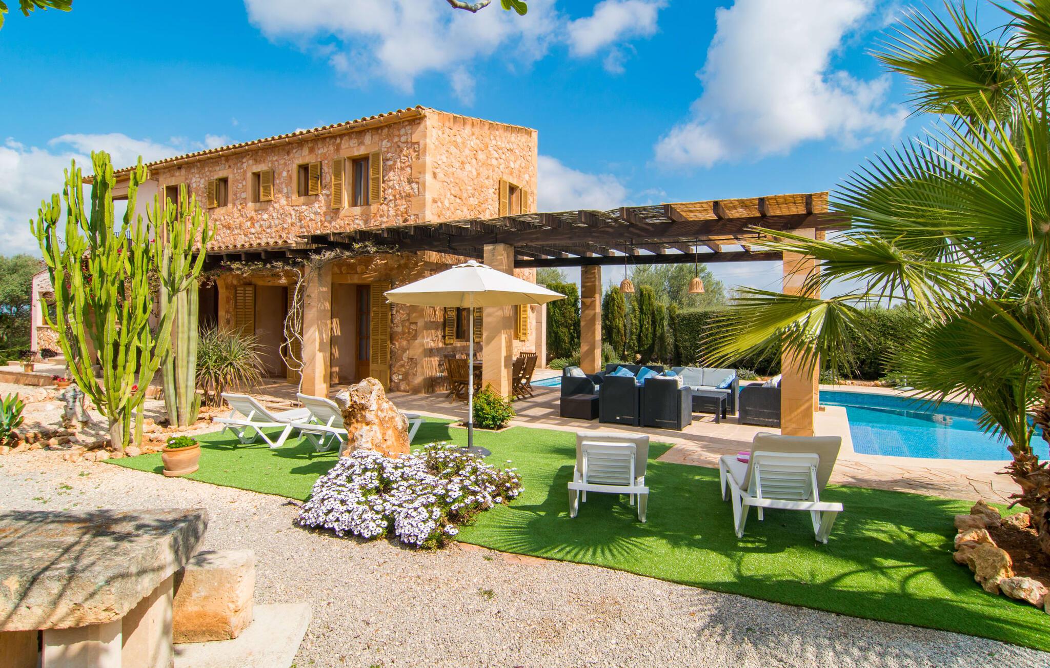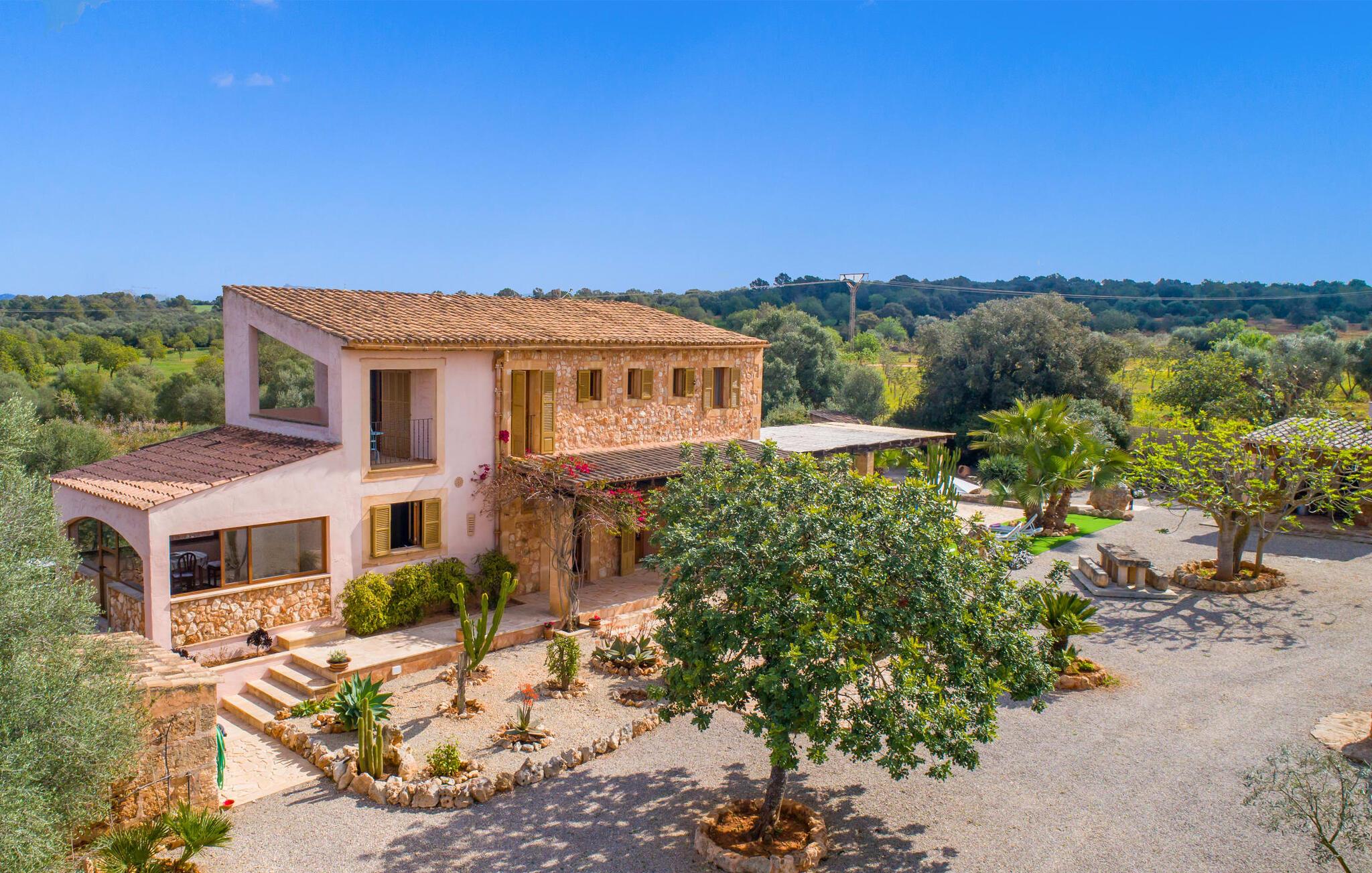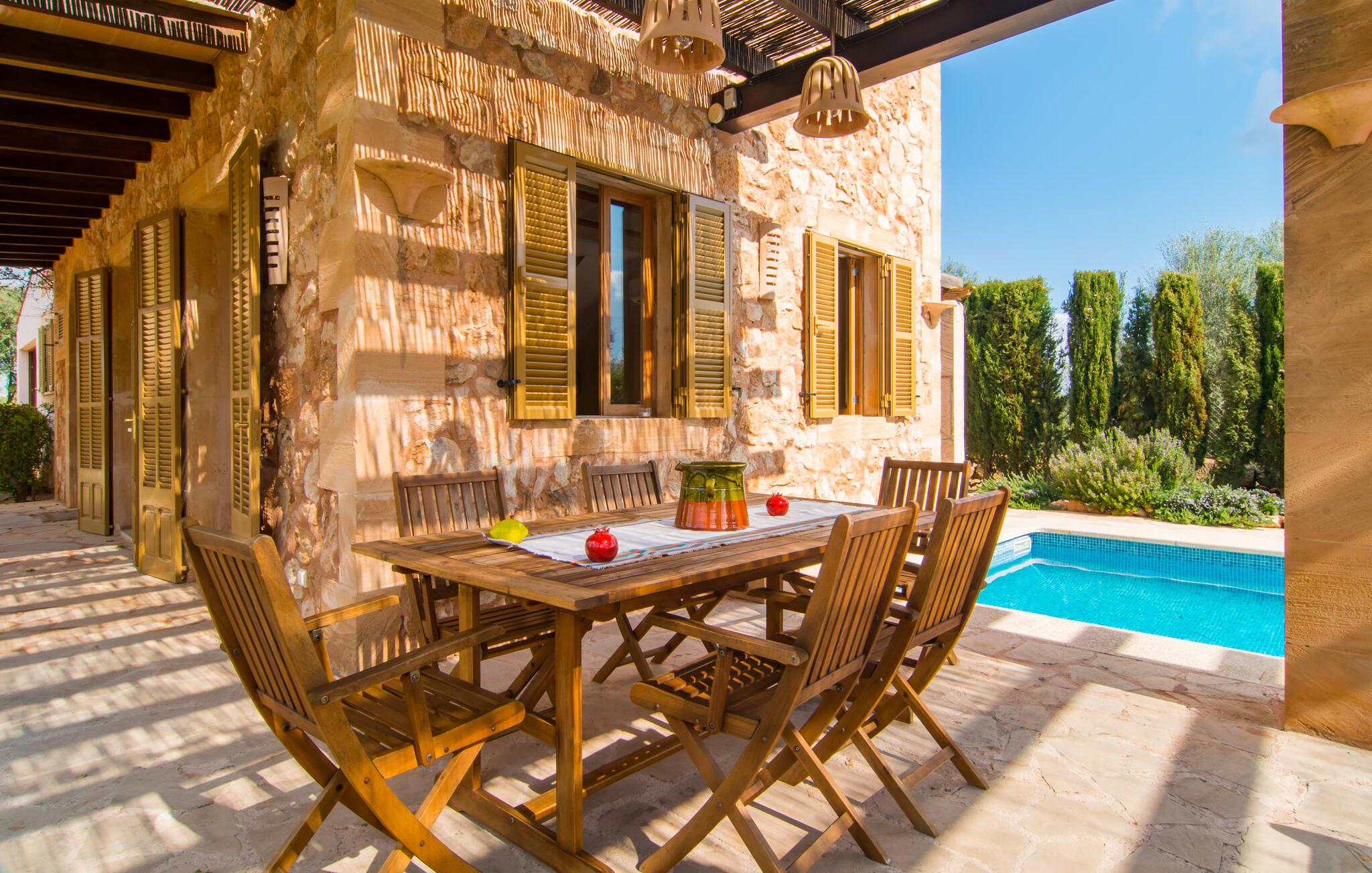 Man kunne næsten tro, at denne safranfarvede middelhavsvilla med sine oliven-, figen- og johannesbrødtræer, sine palmer, cypresser og kaktusser opstod fra selve Campos' frugtbare jord. Nybygget i 2015, lige så ærlig, ukompliceret og solmoden som en god vin, lidt mousserende steder og fuld af karakter, selv den første smag giver lyst til mere. En unik halvmåneformet pool omkring den overdækkede terrasse byder på alt det vand, I har brug for til jeres daglige svømmetur - et rigtigt blikfang! Her kan I afslutte dagen komfortabelt - med en sen morgenmad, et blad eller et glas vin - mens børnene plasker trygt rundt omkring jer. Man kunne næsten tale om en ferie i swimmingpoolen i stedet for ved poolen, og man kunne blive fristet til at hoppe direkte ud af et af vinduerne i det kølige vand (men lad være med det - det er hensynsløst, og I kommer til skade) . )...men "Ca Na Carmen" sikrer, at I ikke taber hovedet. Som en frugt, der holder, hvad dens ydre skal lover, skuffer indersiden heller ikke: Mallorca, jordnær, solrig og blomstret. En frisk brise synes at blæse gennem huset, og luftige gardiner giver rummet et let strejf. Den rummelige, åbne stue, madlavning og spiseplads omgiver hyggelige lyseblå sofaer, der inviterer jer til at fordybe jer i en filmaften. I kan selvfølgelig også drive ud i drømmenes rige i de behageligt enkle soveværelser med solide træsenge; Soveværelserne er indrettet med et udvalg af mørkere eller lysere møbler, og et af de øverste soveværelser har direkte adgang til en overdækket altan med vidunderlig udsigt over træerne til bjergene udenfor. Hvis I sover her, kan I lade døren stå åben. Badeværelserne - et i stueetagen og et på øverste etage - er hver delt af to soveværelser. Det eneste, der er tilbage at nævne, er det moderne, veludstyrede køkken med sin egen plads i solen, på hvis vægge friske, sprøde grøntsager fra det ugentlige marked i Campos hænger appetitligt: et paradis for vegetarer og rawfood-fans - hvis det var tilfældet. Det ville ikke være en fantastisk murstensgrill lige foran døren, der bare råber på at blive brugt. Det ville være en skam ikke at... ¡Buen provencho! I et landskab domineret af køer og marker er det nemt at få appetit op. Ud over dets middelalderlige centrum tilbyder den venlige by Campos nogle kulinariske insidertips, herunder den charmerende bistro Moda Café og Pastisseria Pomar, der er kendt over hele øen for sine mandelkager. Men begynder jeres vandrefødder at klø i “Ca Na Carmen” om sommeren, anbefaler vi en tur til Mallorcas sydspids. I Colònia de Sant Jordi inviterer restauranter og caféer, der ligger direkte på havnen, til at nyde havudsigten. Tag en 30-minutters bådtur til Cabrera (bogstaveligt talt "Gedeøen"), opdag det fortryllende lys fra Den Blå Grotte eller køl blot af i det krystalklare vand. Lyder det ikke som himlen på jorden? I en helt rolig, landlig beliggenhed og alligevel kun få kilometer på Ma-19 fra den lille by Campos med butikker og et supermarked, venter middelhavsvillaen "Ca Na Carmen" på gæster, der ønsker at udforske den sydlige del af øen. Santanyi, Ses Salines og Colònia de Sant Jordi på spidsen af øen er endnu ikke oversvømmet af turister og byder på vidunderlige naturlige sandstrande som Es Trenc eller den lille Cala Santanyi samt imponerende kystvandringer.
