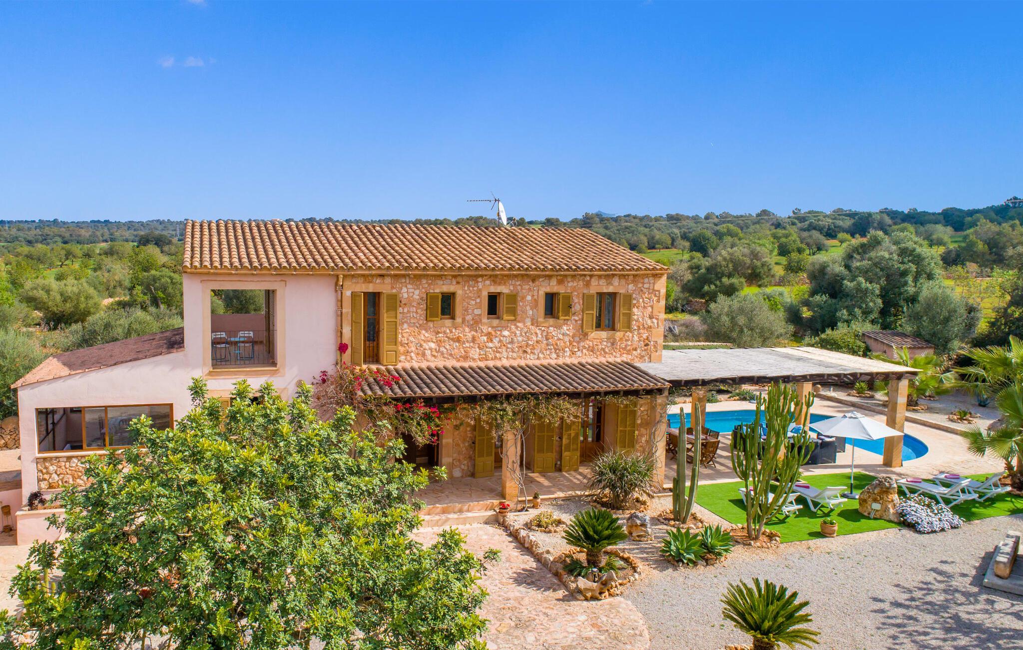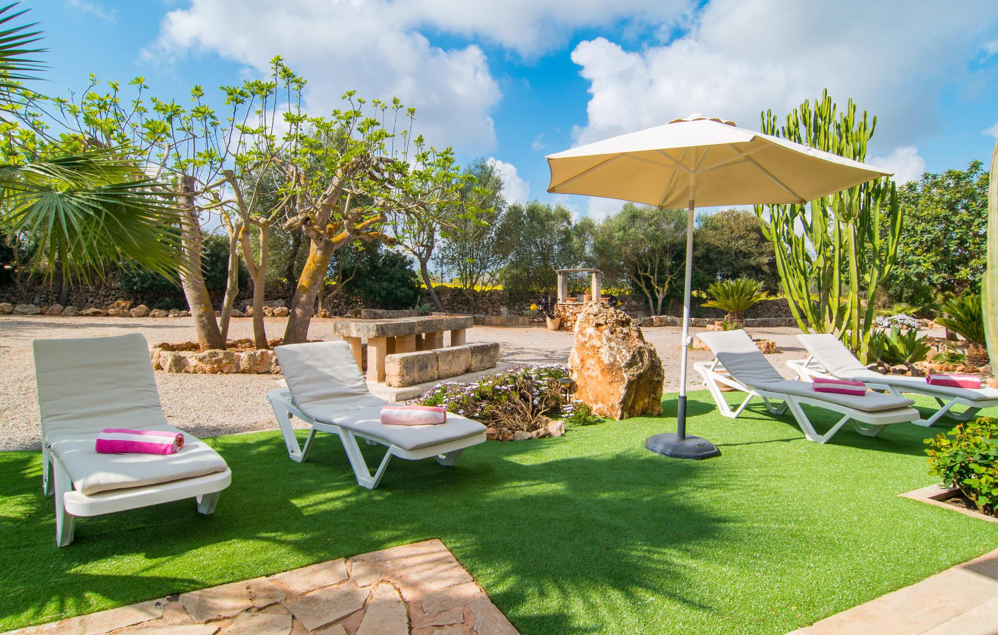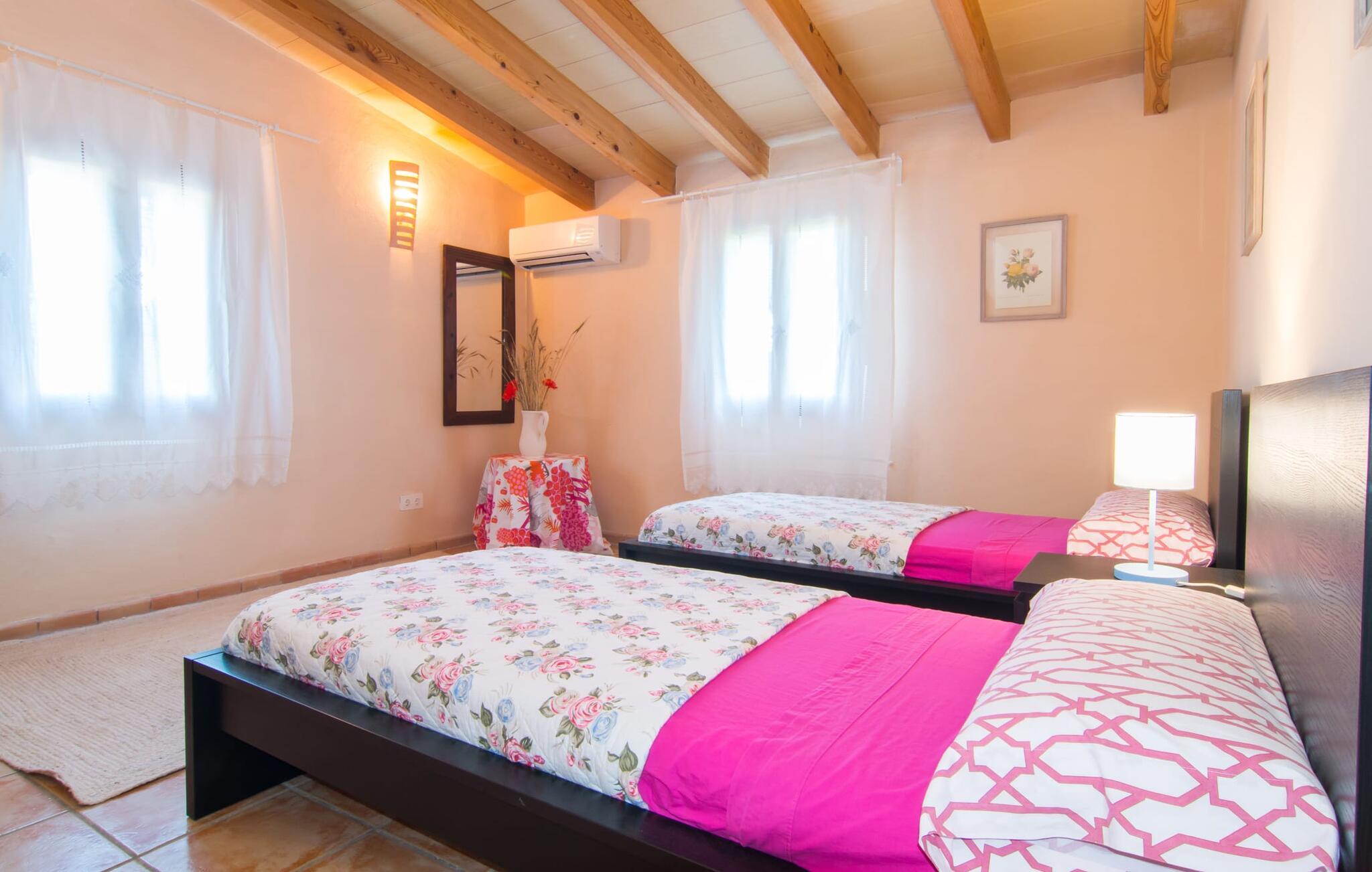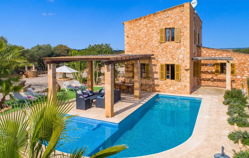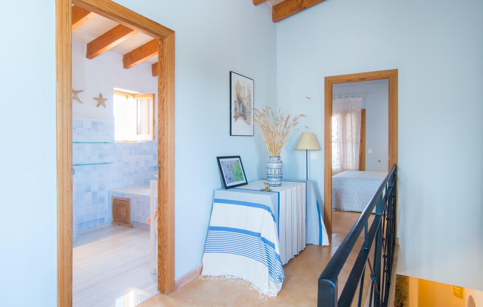 Man kunne næsten tro, at denne safranfarvede middelhavsvilla med sine oliven-, figen- og johannesbrødtræer, sine palmer, cypresser og kaktusser opstod fra selve Campos' frugtbare jord. Nybygget i 2015, lige så ærlig, ukompliceret og solmoden som en god vin, lidt mousserende steder og fuld af karakter, selv den første smag giver lyst til mere. En unik halvmåneformet pool omkring den overdækkede terrasse byder på alt det vand, I har brug for til jeres daglige svømmetur - et rigtigt blikfang! Her kan I afslutte dagen komfortabelt - med en sen morgenmad, et blad eller et glas vin - mens børnene plasker trygt rundt omkring jer. Man kunne næsten tale om en ferie i swimmingpoolen i stedet for ved poolen, og man kunne blive fristet til at hoppe direkte ud af et af vinduerne i det kølige vand (men lad være med det - det er hensynsløst, og I kommer til skade) . )...men "Ca Na Carmen" sikrer, at I ikke taber hovedet. Som en frugt, der holder, hvad dens ydre skal lover, skuffer indersiden heller ikke: Mallorca, jordnær, solrig og blomstret. En frisk brise synes at blæse gennem huset, og luftige gardiner giver rummet et let strejf. Den rummelige, åbne stue, madlavning og spiseplads omgiver hyggelige lyseblå sofaer, der inviterer jer til at fordybe jer i en filmaften. I kan selvfølgelig også drive ud i drømmenes rige i de behageligt enkle soveværelser med solide træsenge; Soveværelserne er indrettet med et udvalg af mørkere eller lysere møbler, og et af de øverste soveværelser har direkte adgang til en overdækket altan med vidunderlig udsigt over træerne til bjergene udenfor. Hvis I sover her, kan I lade døren stå åben. Badeværelserne - et i stueetagen og et på øverste etage - er hver delt af to soveværelser. Det eneste, der er tilbage at nævne, er det moderne, veludstyrede køkken med sin egen plads i solen, på hvis vægge friske, sprøde grøntsager fra det ugentlige marked i Campos hænger appetitligt: et paradis for vegetarer og rawfood-fans - hvis det var tilfældet. Det ville ikke være en fantastisk murstensgrill lige foran døren, der bare råber på at blive brugt. Det ville være en skam ikke at... ¡Buen provencho! I et landskab domineret af køer og marker er det nemt at få appetit op. Ud over dets middelalderlige centrum tilbyder den venlige by Campos nogle kulinariske insidertips, herunder den charmerende bistro Moda Café og Pastisseria Pomar, der er kendt over hele øen for sine mandelkager. Men begynder jeres vandrefødder at klø i “Ca Na Carmen” om sommeren, anbefaler vi en tur til Mallorcas sydspids. I Colònia de Sant Jordi inviterer restauranter og caféer, der ligger direkte på havnen, til at nyde havudsigten. Tag en 30-minutters bådtur til Cabrera (bogstaveligt talt "Gedeøen"), opdag det fortryllende lys fra Den Blå Grotte eller køl blot af i det krystalklare vand. Lyder det ikke som himlen på jorden? I en helt rolig, landlig beliggenhed og alligevel kun få kilometer på Ma-19 fra den lille by Campos med butikker og et supermarked, venter middelhavsvillaen "Ca Na Carmen" på gæster, der ønsker at udforske den sydlige del af øen. Santanyi, Ses Salines og Colònia de Sant Jordi på spidsen af øen er endnu ikke oversvømmet af turister og byder på vidunderlige naturlige sandstrande som Es Trenc eller den lille Cala Santanyi samt imponerende kystvandringer.
