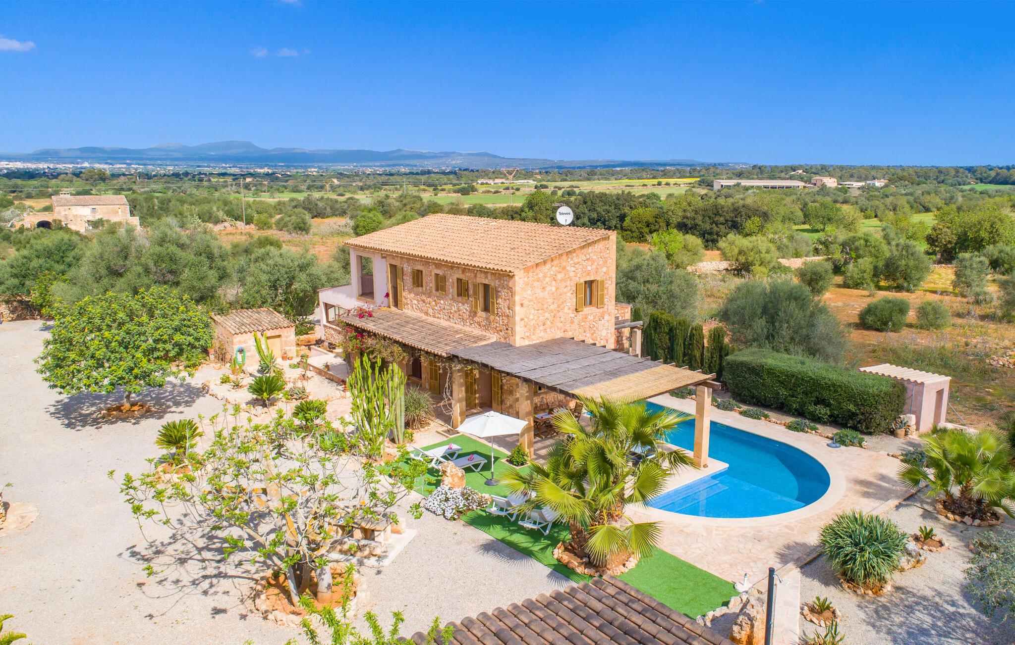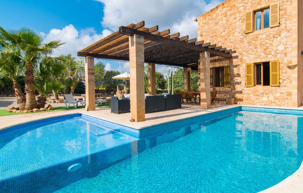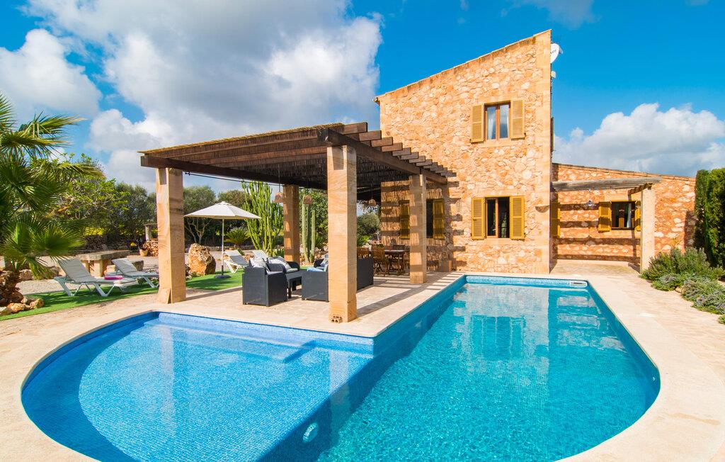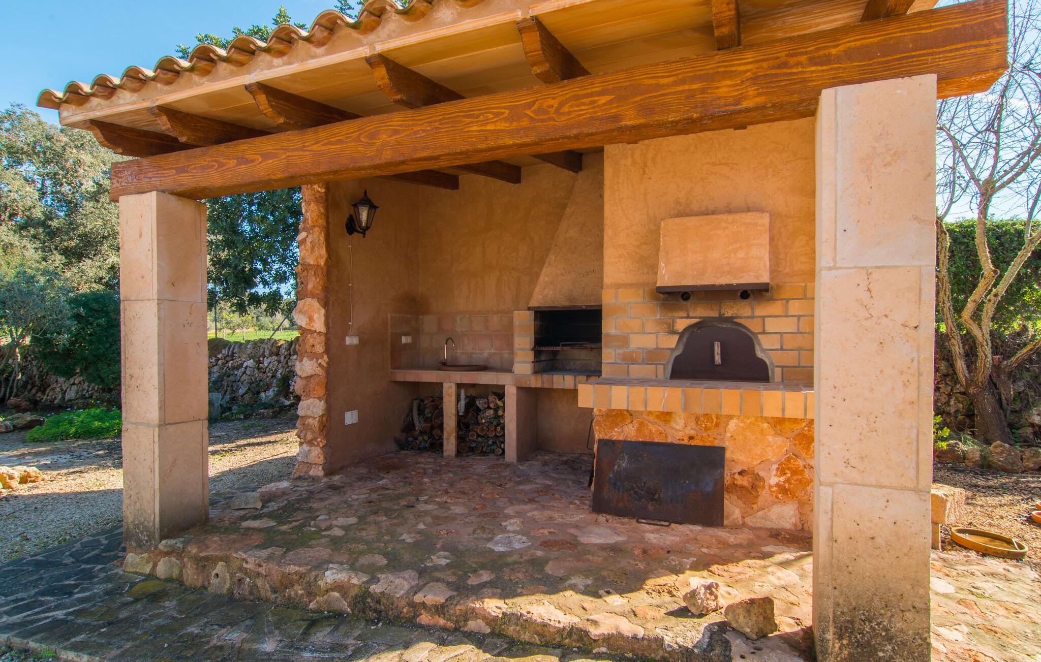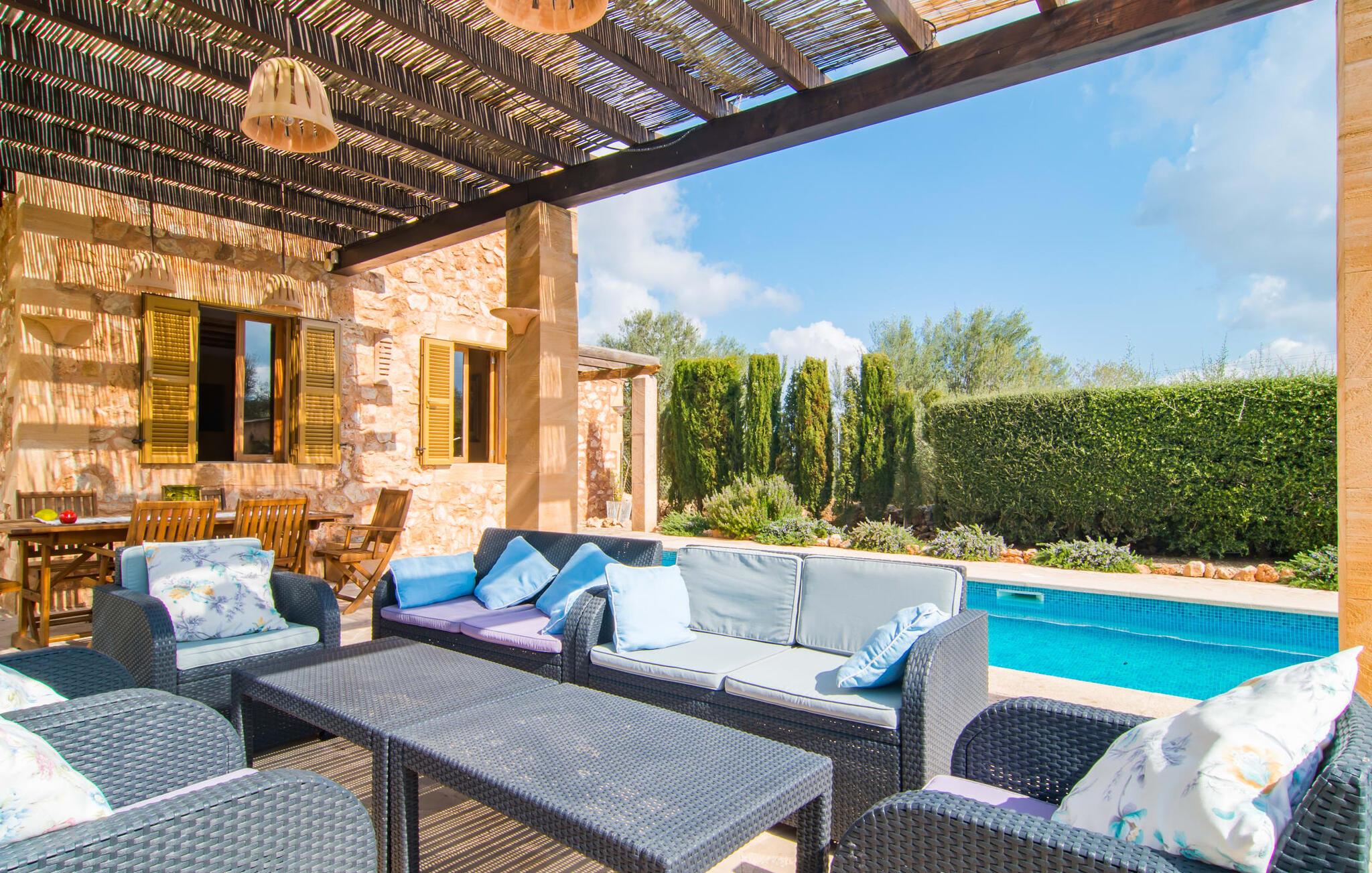 Man kunne næsten tro, at denne safranfarvede middelhavsvilla med sine oliven-, figen- og johannesbrødtræer, sine palmer, cypresser og kaktusser opstod fra selve Campos' frugtbare jord. Nybygget i 2015, lige så ærlig, ukompliceret og solmoden som en god vin, lidt mousserende steder og fuld af karakter, selv den første smag giver lyst til mere. En unik halvmåneformet pool omkring den overdækkede terrasse byder på alt det vand, I har brug for til jeres daglige svømmetur - et rigtigt blikfang! Her kan I afslutte dagen komfortabelt - med en sen morgenmad, et blad eller et glas vin - mens børnene plasker trygt rundt omkring jer. Man kunne næsten tale om en ferie i swimmingpoolen i stedet for ved poolen, og man kunne blive fristet til at hoppe direkte ud af et af vinduerne i det kølige vand (men lad være med det - det er hensynsløst, og I kommer til skade) . )...men "Ca Na Carmen" sikrer, at I ikke taber hovedet. Som en frugt, der holder, hvad dens ydre skal lover, skuffer indersiden heller ikke: Mallorca, jordnær, solrig og blomstret. En frisk brise synes at blæse gennem huset, og luftige gardiner giver rummet et let strejf. Den rummelige, åbne stue, madlavning og spiseplads omgiver hyggelige lyseblå sofaer, der inviterer jer til at fordybe jer i en filmaften. I kan selvfølgelig også drive ud i drømmenes rige i de behageligt enkle soveværelser med solide træsenge; Soveværelserne er indrettet med et udvalg af mørkere eller lysere møbler, og et af de øverste soveværelser har direkte adgang til en overdækket altan med vidunderlig udsigt over træerne til bjergene udenfor. Hvis I sover her, kan I lade døren stå åben. Badeværelserne - et i stueetagen og et på øverste etage - er hver delt af to soveværelser. Det eneste, der er tilbage at nævne, er det moderne, veludstyrede køkken med sin egen plads i solen, på hvis vægge friske, sprøde grøntsager fra det ugentlige marked i Campos hænger appetitligt: et paradis for vegetarer og rawfood-fans - hvis det var tilfældet. Det ville ikke være en fantastisk murstensgrill lige foran døren, der bare råber på at blive brugt. Det ville være en skam ikke at... ¡Buen provencho! I et landskab domineret af køer og marker er det nemt at få appetit op. Ud over dets middelalderlige centrum tilbyder den venlige by Campos nogle kulinariske insidertips, herunder den charmerende bistro Moda Café og Pastisseria Pomar, der er kendt over hele øen for sine mandelkager. Men begynder jeres vandrefødder at klø i “Ca Na Carmen” om sommeren, anbefaler vi en tur til Mallorcas sydspids. I Colònia de Sant Jordi inviterer restauranter og caféer, der ligger direkte på havnen, til at nyde havudsigten. Tag en 30-minutters bådtur til Cabrera (bogstaveligt talt "Gedeøen"), opdag det fortryllende lys fra Den Blå Grotte eller køl blot af i det krystalklare vand. Lyder det ikke som himlen på jorden? I en helt rolig, landlig beliggenhed og alligevel kun få kilometer på Ma-19 fra den lille by Campos med butikker og et supermarked, venter middelhavsvillaen "Ca Na Carmen" på gæster, der ønsker at udforske den sydlige del af øen. Santanyi, Ses Salines og Colònia de Sant Jordi på spidsen af øen er endnu ikke oversvømmet af turister og byder på vidunderlige naturlige sandstrande som Es Trenc eller den lille Cala Santanyi samt imponerende kystvandringer.