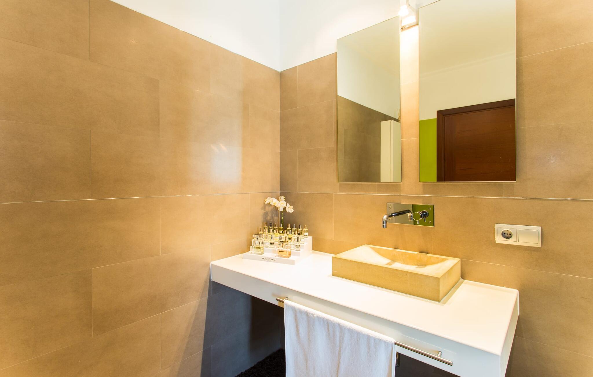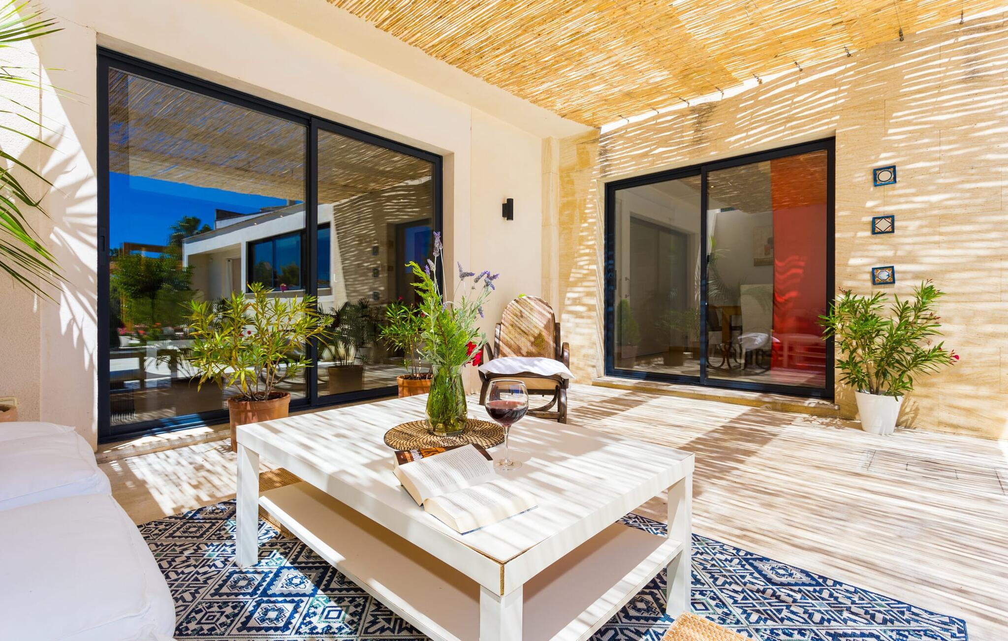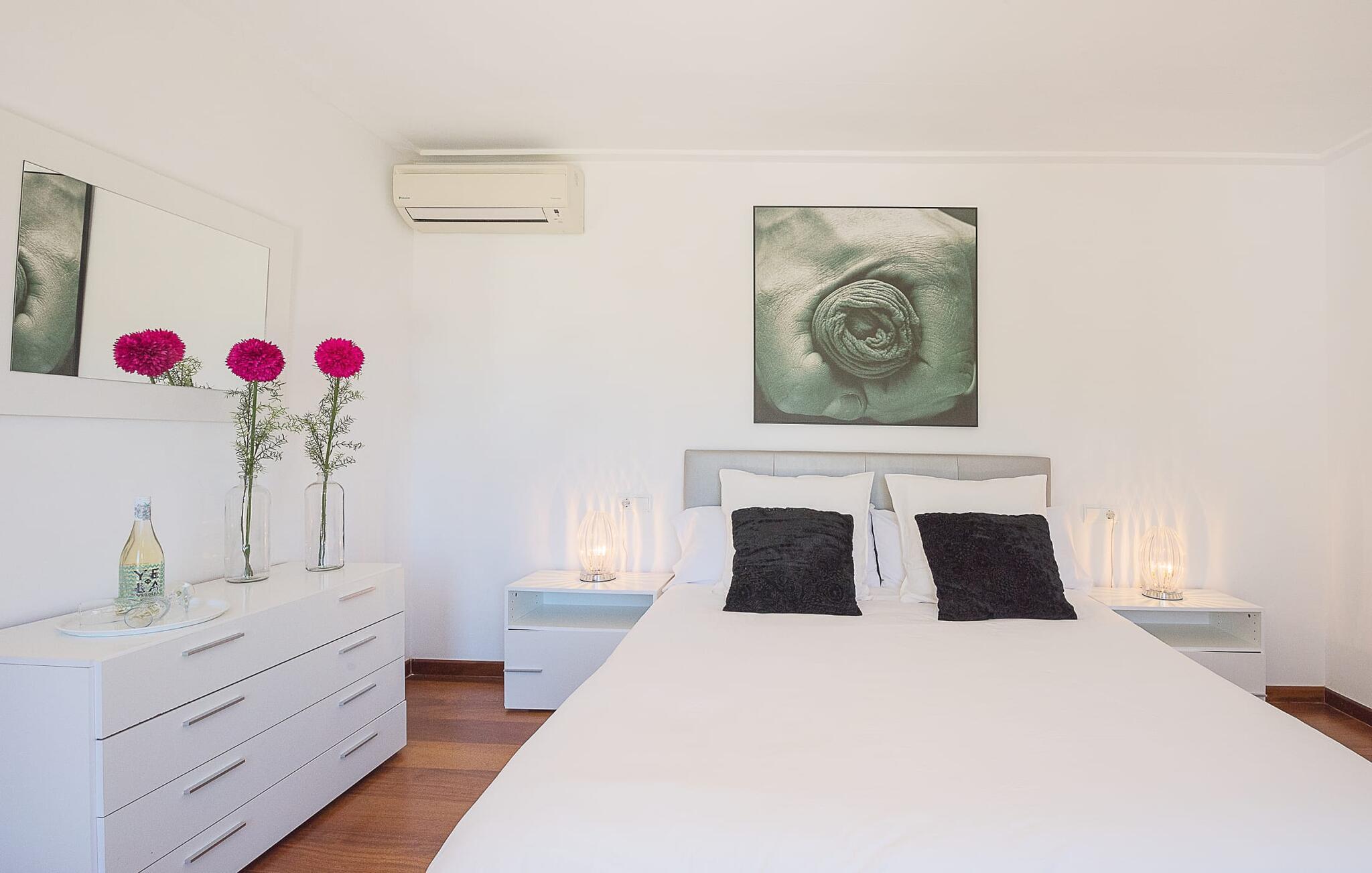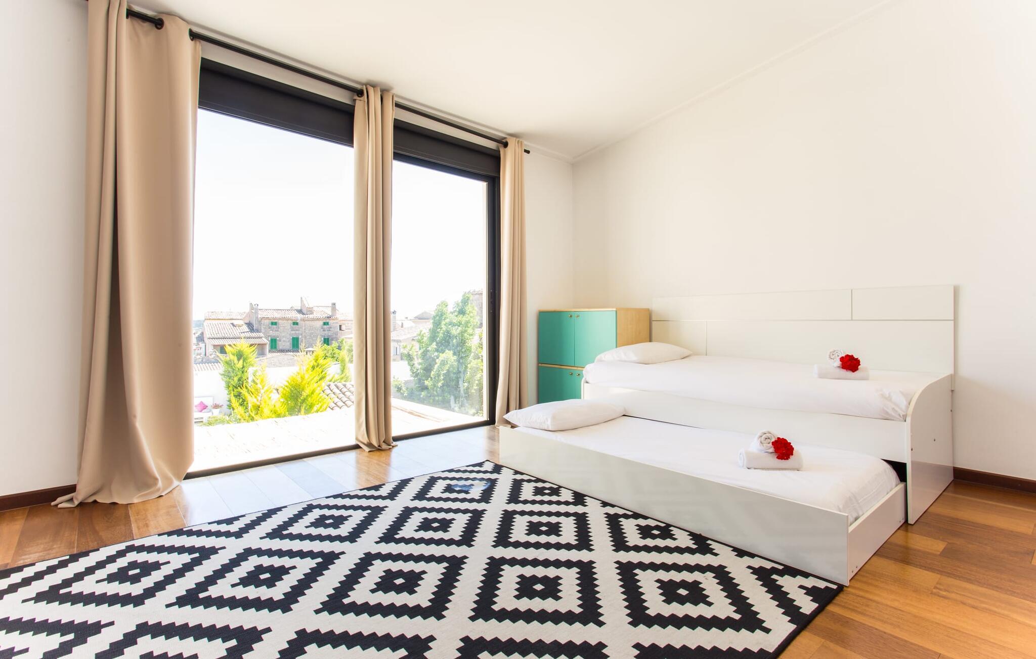 Kunne I tænke jer at holde ferie i et autentisk mallorcansk hus, men stadig være privat og nyde god infrastruktur? Så er det værd at kigge nærmere på. Villaen "Ca Na Molinera" kombinerer ikke kun disse kvaliteter, men supplerer dem med en moderne og meget stilfuld atmosfære, hvor I helt sikkert vil føle jer godt tilpas. Feriehuset ligger direkte i den centrale Pla de Mallorca-region i landsbyen Sant Joan, som byder på en typisk, næsten original flair. Villaen ligner en oase, der skiller sig ud fra omgivelserne takket være dens stilfulde indretning. Ved første øjekast virker alt meget lyst og strålende, og det maleriske udendørsområde inviterer jer til at tilbringe lange, fornøjelige timer udendørs. Et par middelhavsplanter, nogle i krukker, pynter på de ellers enkle og overvejende hvide områder. Der er en fantastisk chill-out zone lavet af pallemøbler lige ved siden af huset. Her kan I slappe af hele dagen lang, ideelt med en kølig drink og måske en forfriskende snack. Farverige puder pifter tingene op med lyse toner. Den brede sti til poolen fører først forbi andre afslapningsområder, som er perfekte steder at slappe af udendørs og med garanti vil være populære blandt alle rejsende. Poolen er meget stor til et rækkehus. I kan svømme rigtige runder over en længde på 12 m – har I nogensinde gjort dette, tidligt om morgenen, når dagens lys og livet begynder at vågne omkring dig? Hvis ikke, så skal I bestemt gøre det og nyde denne helt særlige form for luksus. Der er komfortable liggestole til rådighed, så I kan slappe af bagefter. Der er også et andet højdepunkt ved poolen - en slags renoveret garage, hvor I finder et fantastisk udekøkken med spisebord og køleskab. I denne stilfulde atmosfære med en smuk udsigt over poolen kan I spise sammen og nyde en grillsession om aftenen. Husets indre matcher det ydres æstetik. Moderne, behageligt farverig indretning skaber en meget stilfuld atmosfære, hvor I med det samme ønsker at tilbringe tid. Ekstraordinære arrangementer og individuelle stykker giver hele stemningen et ekstra individuelt præg. Bo i de rummelige værelser og skift frem og tilbage mellem de komfortable udendørs og indendørs områder, som I ønsker. I kan slappe perfekt af i den komfortable sofa i den store, lyse stue. Til underholdning er der et fladskærms-tv med satellitforbindelse og dvd-afspiller samt en højhastigheds internetforbindelse for at sikre jeres digitale forbindelse med venner og familie. Mellem opholds- og køkkenområderne er en spiseplads, der tilbyder en indbydende, eksklusiv fornemmelse for perfekte måltider. Køkkenet er et sandt blikfang med sit sorte og røde look: Her finder I plads nok til alt, hvad I skal bruge, så intet står i vejen for jeres selvforsyning. Der er også et soveværelse og et badeværelse på denne etage. Tager I den ekstravagante trappe op til øverste etage, kommer I til et soveværelse. Herfra kommer I ind i det andet værelse: et stort soveværelse med walk-in closet, en-suite badeværelse og privat terrasse. Der er også et andet badeværelse på dette niveau. Alle værelser er indrettet i elegant stil og har masser af plads. Elegante badeværelser giver plads til alle gæster og er udstyret med attraktive installationer og armaturer. Strygejern og hårtørrer er til rådighed i huset, så I behøver ikke at medbringe jeres eget hjemmefra. Den nærliggende landsby Petra (ca. 7 km) med sine gyldenbrune stenhuse minder om en drømmende by langt væk fra stress og jag. Sørg for at besøge det ugentlige marked og de små barer, caféer og restauranter i denne rolige by, som har udviklet en god infrastruktur, men stadig bevarer sin ro. Lloret de Vistalegre er også en attraktiv by og kun 15 minutter væk i bil. En tur til Inca (20 km) er også umagen værd. Den lille by Inca har en lang tradition inden for læder- og skohåndværk. Dette indbydende hus ligger midt i den smukke landsby Sant Joan - kun 7 km fra Petra, en lille, drømmende by, der har sin charme gennem både smukke gyder og gader omkranset af gamle bygninger. Sineu er også omkring 7 km væk. Et stort marked finder sted her hver onsdag morgen; Markedet i Sant Joan finder sted om torsdagen.