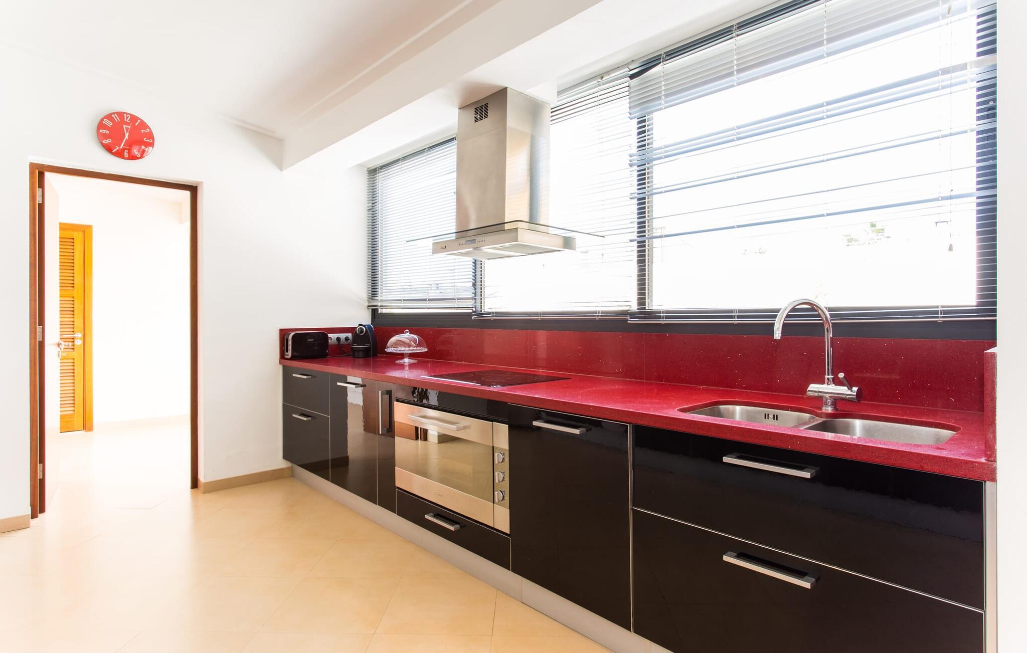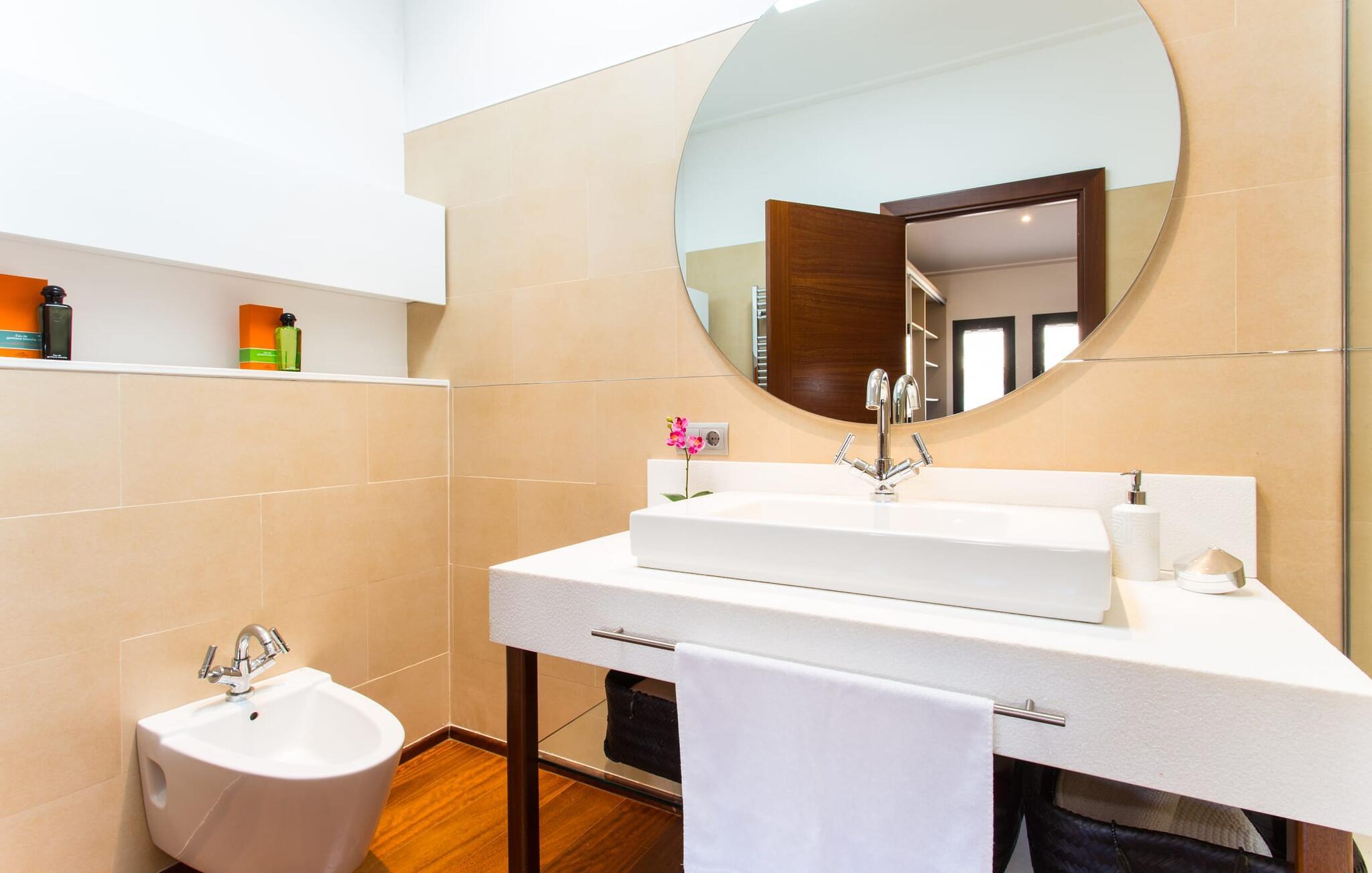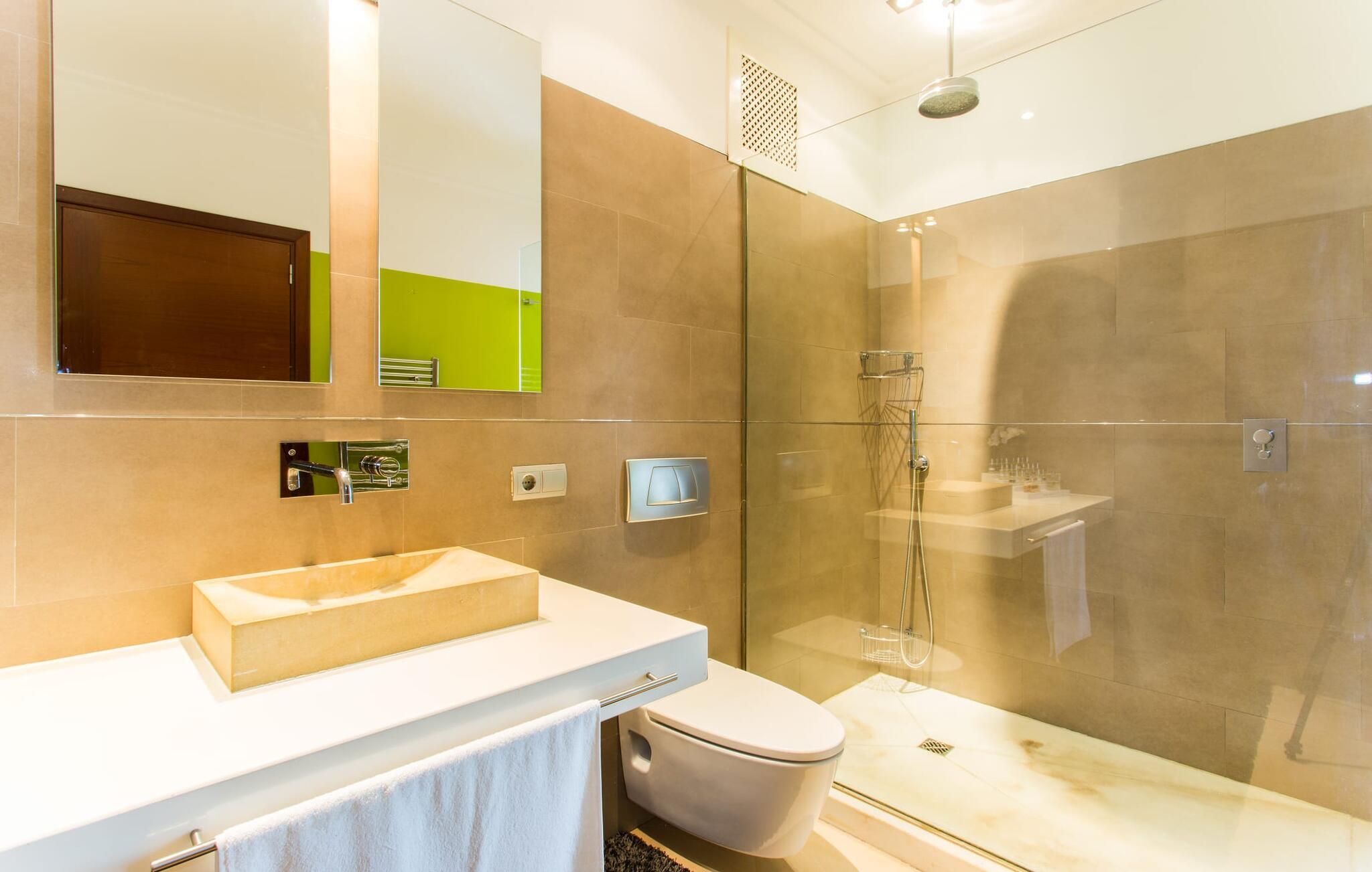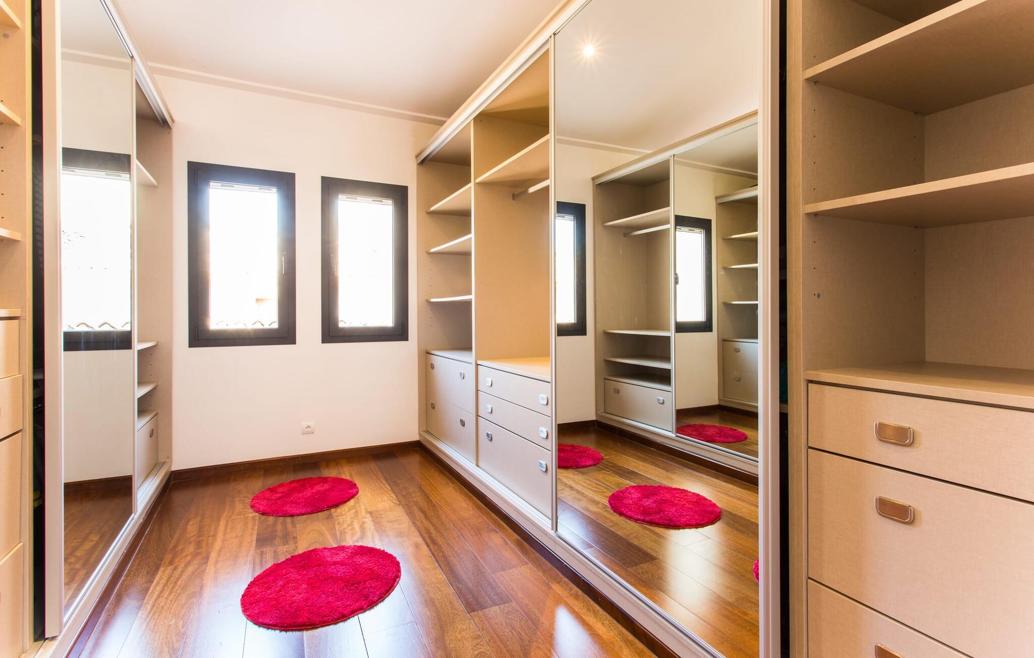 Kunne I tænke jer at holde ferie i et autentisk mallorcansk hus, men stadig være privat og nyde god infrastruktur? Så er det værd at kigge nærmere på. Villaen "Ca Na Molinera" kombinerer ikke kun disse kvaliteter, men supplerer dem med en moderne og meget stilfuld atmosfære, hvor I helt sikkert vil føle jer godt tilpas. Feriehuset ligger direkte i den centrale Pla de Mallorca-region i landsbyen Sant Joan, som byder på en typisk, næsten original flair. Villaen ligner en oase, der skiller sig ud fra omgivelserne takket være dens stilfulde indretning. Ved første øjekast virker alt meget lyst og strålende, og det maleriske udendørsområde inviterer jer til at tilbringe lange, fornøjelige timer udendørs. Et par middelhavsplanter, nogle i krukker, pynter på de ellers enkle og overvejende hvide områder. Der er en fantastisk chill-out zone lavet af pallemøbler lige ved siden af huset. Her kan I slappe af hele dagen lang, ideelt med en kølig drink og måske en forfriskende snack. Farverige puder pifter tingene op med lyse toner. Den brede sti til poolen fører først forbi andre afslapningsområder, som er perfekte steder at slappe af udendørs og med garanti vil være populære blandt alle rejsende. Poolen er meget stor til et rækkehus. I kan svømme rigtige runder over en længde på 12 m – har I nogensinde gjort dette, tidligt om morgenen, når dagens lys og livet begynder at vågne omkring dig? Hvis ikke, så skal I bestemt gøre det og nyde denne helt særlige form for luksus. Der er komfortable liggestole til rådighed, så I kan slappe af bagefter. Der er også et andet højdepunkt ved poolen - en slags renoveret garage, hvor I finder et fantastisk udekøkken med spisebord og køleskab. I denne stilfulde atmosfære med en smuk udsigt over poolen kan I spise sammen og nyde en grillsession om aftenen. Husets indre matcher det ydres æstetik. Moderne, behageligt farverig indretning skaber en meget stilfuld atmosfære, hvor I med det samme ønsker at tilbringe tid. Ekstraordinære arrangementer og individuelle stykker giver hele stemningen et ekstra individuelt præg. Bo i de rummelige værelser og skift frem og tilbage mellem de komfortable udendørs og indendørs områder, som I ønsker. I kan slappe perfekt af i den komfortable sofa i den store, lyse stue. Til underholdning er der et fladskærms-tv med satellitforbindelse og dvd-afspiller samt en højhastigheds internetforbindelse for at sikre jeres digitale forbindelse med venner og familie. Mellem opholds- og køkkenområderne er en spiseplads, der tilbyder en indbydende, eksklusiv fornemmelse for perfekte måltider. Køkkenet er et sandt blikfang med sit sorte og røde look: Her finder I plads nok til alt, hvad I skal bruge, så intet står i vejen for jeres selvforsyning. Der er også et soveværelse og et badeværelse på denne etage. Tager I den ekstravagante trappe op til øverste etage, kommer I til et soveværelse. Herfra kommer I ind i det andet værelse: et stort soveværelse med walk-in closet, en-suite badeværelse og privat terrasse. Der er også et andet badeværelse på dette niveau. Alle værelser er indrettet i elegant stil og har masser af plads. Elegante badeværelser giver plads til alle gæster og er udstyret med attraktive installationer og armaturer. Strygejern og hårtørrer er til rådighed i huset, så I behøver ikke at medbringe jeres eget hjemmefra. Den nærliggende landsby Petra (ca. 7 km) med sine gyldenbrune stenhuse minder om en drømmende by langt væk fra stress og jag. Sørg for at besøge det ugentlige marked og de små barer, caféer og restauranter i denne rolige by, som har udviklet en god infrastruktur, men stadig bevarer sin ro. Lloret de Vistalegre er også en attraktiv by og kun 15 minutter væk i bil. En tur til Inca (20 km) er også umagen værd. Den lille by Inca har en lang tradition inden for læder- og skohåndværk. Dette indbydende hus ligger midt i den smukke landsby Sant Joan - kun 7 km fra Petra, en lille, drømmende by, der har sin charme gennem både smukke gyder og gader omkranset af gamle bygninger. Sineu er også omkring 7 km væk. Et stort marked finder sted her hver onsdag morgen; Markedet i Sant Joan finder sted om torsdagen.