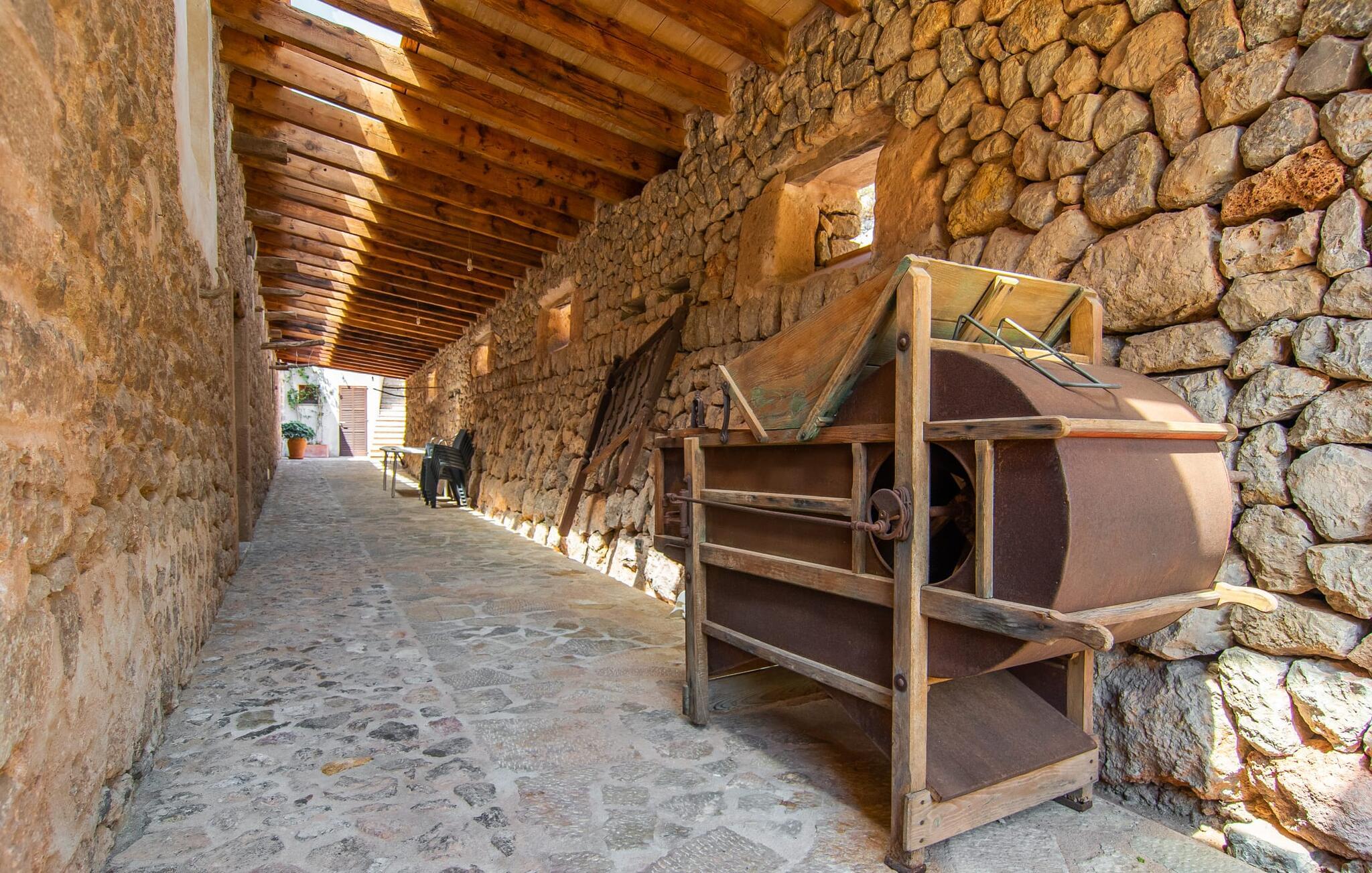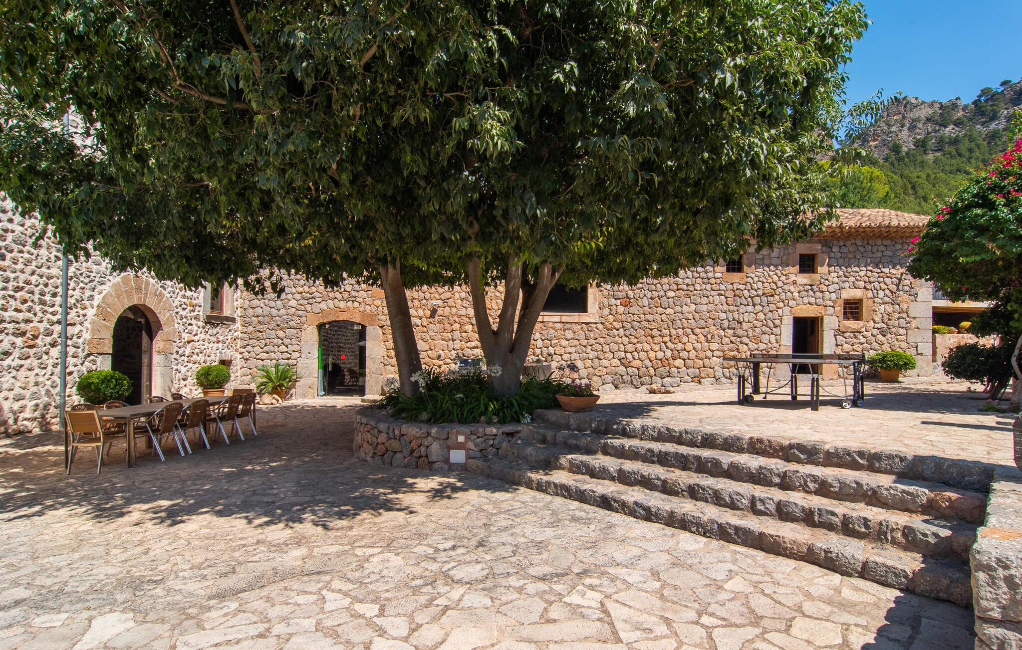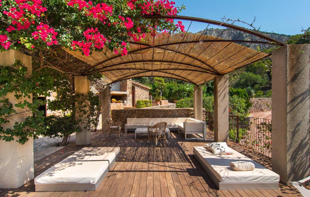 Kunne I tænke jer at tilbringe en uforglemmelig ferie med familie og venner? Det vidunderligt smukke og fantastisk beliggende bondehus “Ca S'Hereu del Puerto de Soller” i den nordvestlige del af Mallorca kan rumme op til tolv personer. Naturstensejendommen med den integrerede gamle oliemølle er ikke kun meget rummelig, men også rigtig smuk. Stuehuset blev totalrenoveret med stor indsats og smag og kombinerer i dag perfekt moderne komfort med traditionelle detaljer. Enhver, der elsker deres privatliv, er kommet til det rigtige sted, stuehuset ligger i en absolut rolig, landlig sydlig og afsondret beliggenhed. Der er forskellige meget velholdte terrasseområder rundt om huset - der er også tagterrasse - til afslapning. Hvis I har lyst, kan I spille et spil bordtennis eller tage en dukkert i poolen og nyde den unikke udsigt over de omkringliggende grønne bakker. I kan også tage afslappende gåture på den enorme ejendom med terrassehave og måske tage et kig på jeres egen appelsinlund. I kan parkere jeres lejebil direkte ved huset på grusparkeringspladsen eller under den skyggefulde carport. Et bondehus på Mallorca som noget ud af en billedbog - eller fra et blankt boligmagasin: naturstensgulve og -vægge overalt, kombineret med masser af hvide og naturlige farver, typiske mallorcanske antikke møbler, med en masse stil, suppleret med enkle, moderne designer stykker og smart placerede lamper, der bringer alt til sit bedste, flytter lyset. Huset strækker sig over 1. sal og har i alt tre overetager. Et særligt træk: et par trin fører ned fra første sal. Der er flere rum hugget ind i klippen, hvoraf nogle stadig indeholder elementer fra den gamle oliemølle - i dag et behageligt sted at læse og slappe af. De diskret og smagfuldt designede soveværelser, hver med luksuriøse en-suite badeværelser, er fordelt på de tre øverste etager. På første og tredje sal inviterer rummelige køkkener udstyret med højkvalitetsapparater til at lave mad og spise sammen. På anden og tredje sal er der desuden to store stuer med indbydende sofaer og fjernsyn. For at holde denne smukke ejendom i top stand arbejder gartnere og viceværter så diskret som muligt i flere timer næsten hver dag. Det stilfuldt renoverede bondehus "Ca S'Hereu del Puerto de Soller" ligger i en absolut rolig nordvestlig beliggenhed, kun 3 km fra Port de Sóller og dens strand i den nordvestlige del af Mallorca. Fra jeres kæmpe ejendom med pool, terrasser og jeres egen appelsinlund kan I nyde en vidunderlig udsigt over det bakkede landskab.