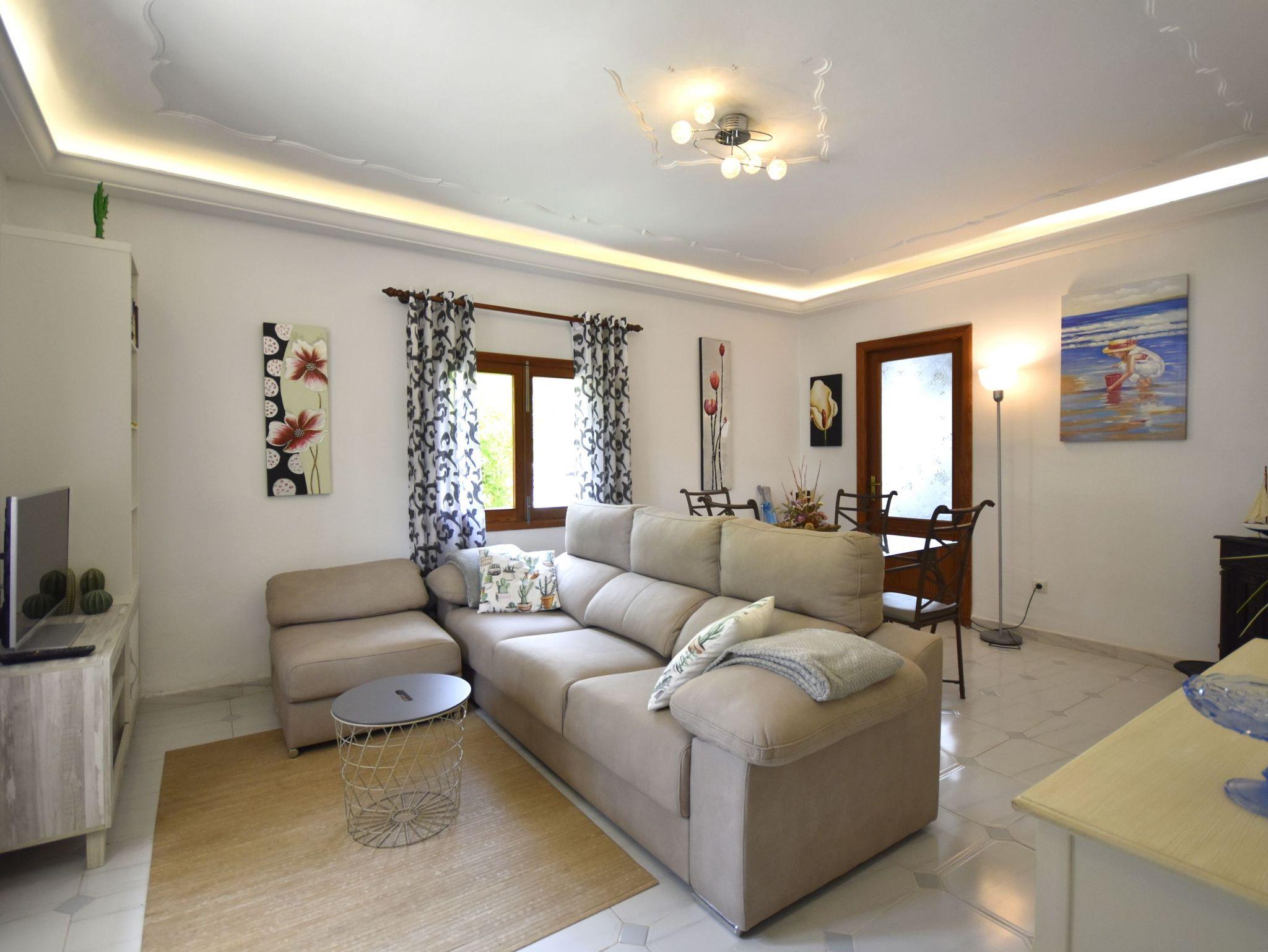 Das helle und gemütliche Wohnzimmer ist mit Klimaanlage, Kamin und WLAN im gesamten Haus ausgestattet und lädt zum Entspannen ein.