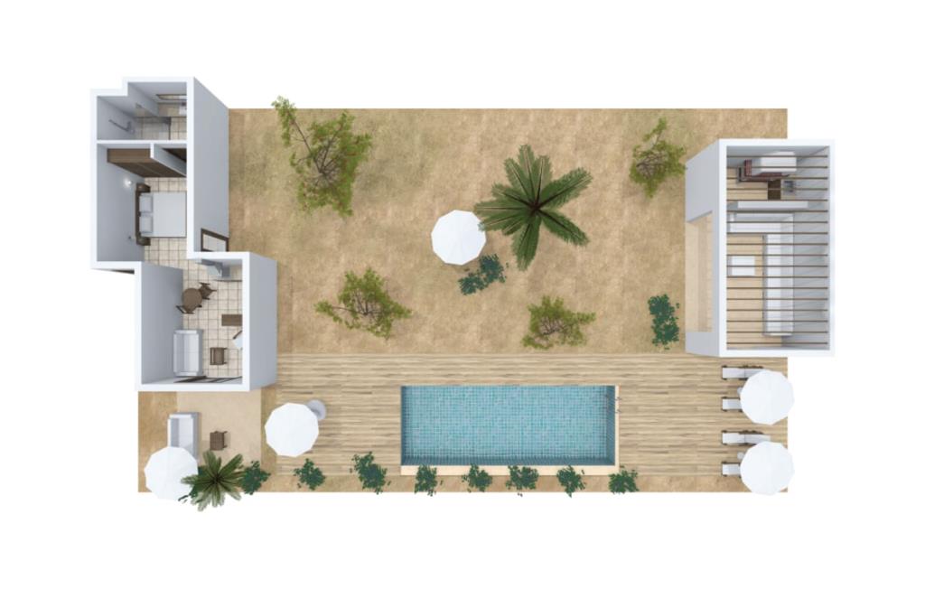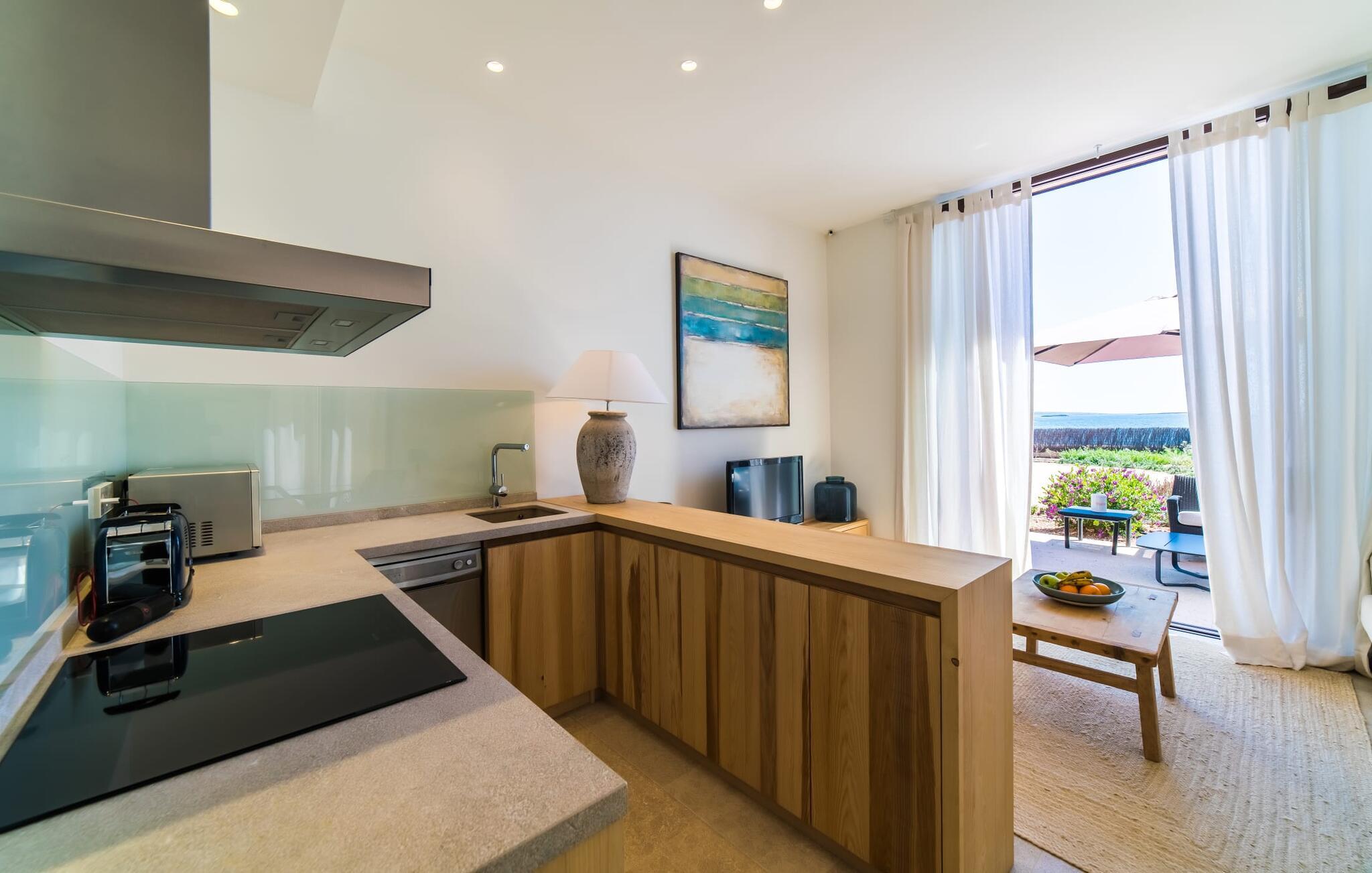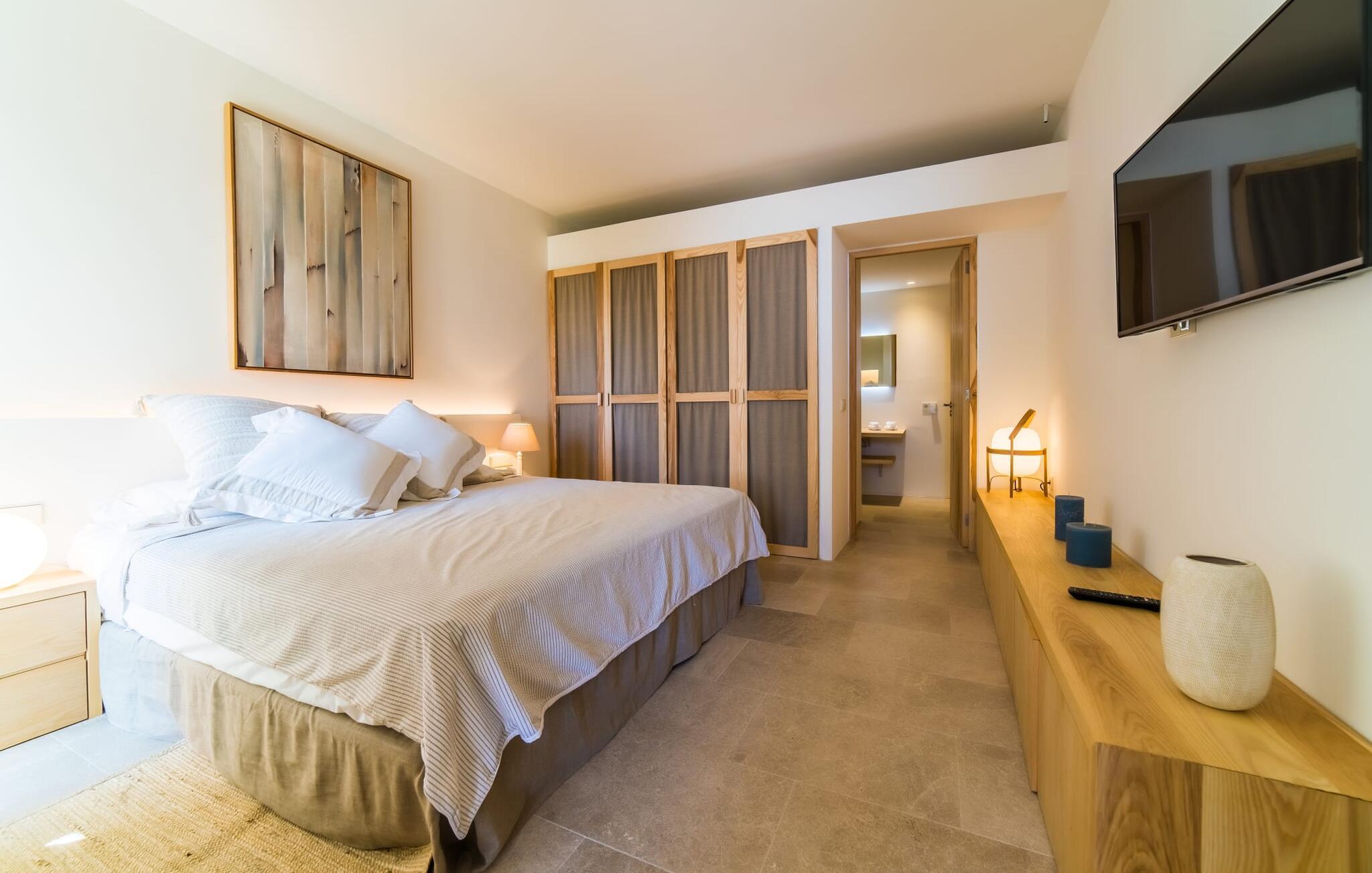 “Villa Cabrera” fordeler sig over 50 m² bag luftige gardiner – der er selvfølgelig også en dør. I kan også tage den afslappede strandfølelse med indendørs, hvor strandens og havets farver pryder væggene, bambusstolen og sofaen med behagelige hynder inviterer til en pause med aircondition. Det elegante, åbne køkken er også tæt på, hvis I har lyst til at lave en salat eller kaffe - og selvfølgelig for at få endnu en omgang drinks fra køleskabet. Men når I nu har så mange gode restauranter i nærheden og måske holder af frisk fisk, vil I måske forkæle jer selv med en aften i byen. Der er også en dobbeltseng med eget fjernsyn og udsigt over havet mod den elegante kulisse af et værelse indrettet med mange forskellige træsorter. Det meget moderne en-suite badeværelse har ingen vinduer, men der er et godt lys fra lamperne. Og bliver det for livligt i strandhuset, sørger gulvvarmen hurtigt for hyggelig varme.