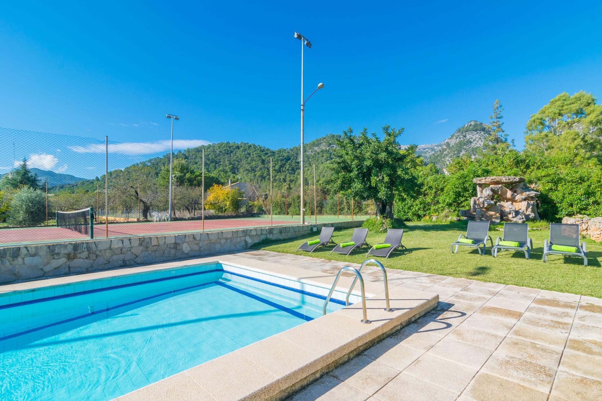 Beliggende ved foden af ??Tramuntana-bjergene tilbyder denne smukke villa en fredelig flugt med fantastiske naturlige omgivelser. Den store klorpool (9x4m, 0,9-2,2m dyb) er perfekt til at køle af på varme dage, med 6 liggestole ideelle til solbadning. Nyd afslappet grillmad under verandaen eller spis udendørs ved græsplænen efter en venskabskamp på din private tennisbane. Den indhegnede ejendom har også en udendørs bruser for ekstra bekvemmelighed. Indenfor emmer det rustikke etplanshus af charme og komfort. Den airconditionerede stue-spisestue med satellit-tv og pejs er perfekt til at slappe af efter en dag udendørs. Det fuldt udstyrede køkken omfatter keramisk kogeplade, ovn, mikroovn og spiseplads. Der er 4 soveværelser: 3 med dobbeltsenge og aircondition, og 1 med to enkeltsenge og ventilator. Den ene dobbeltværelse har adgang til haven og en-suite badeværelse med badekar. To ekstra badeværelser (et med bruser, et med badekar) fuldender opsætningen. En barneseng og høj stol er til rådighed. Villaen ligger kun 400 m fra Caimaris centrum og tilbyder adgang til lokale butikker, restauranter og utrolige vandre- eller cykelruter. Strandene i Puerto de Alcúdia og de skjulte bugter i Sa Calobra er inden for rækkevidde.