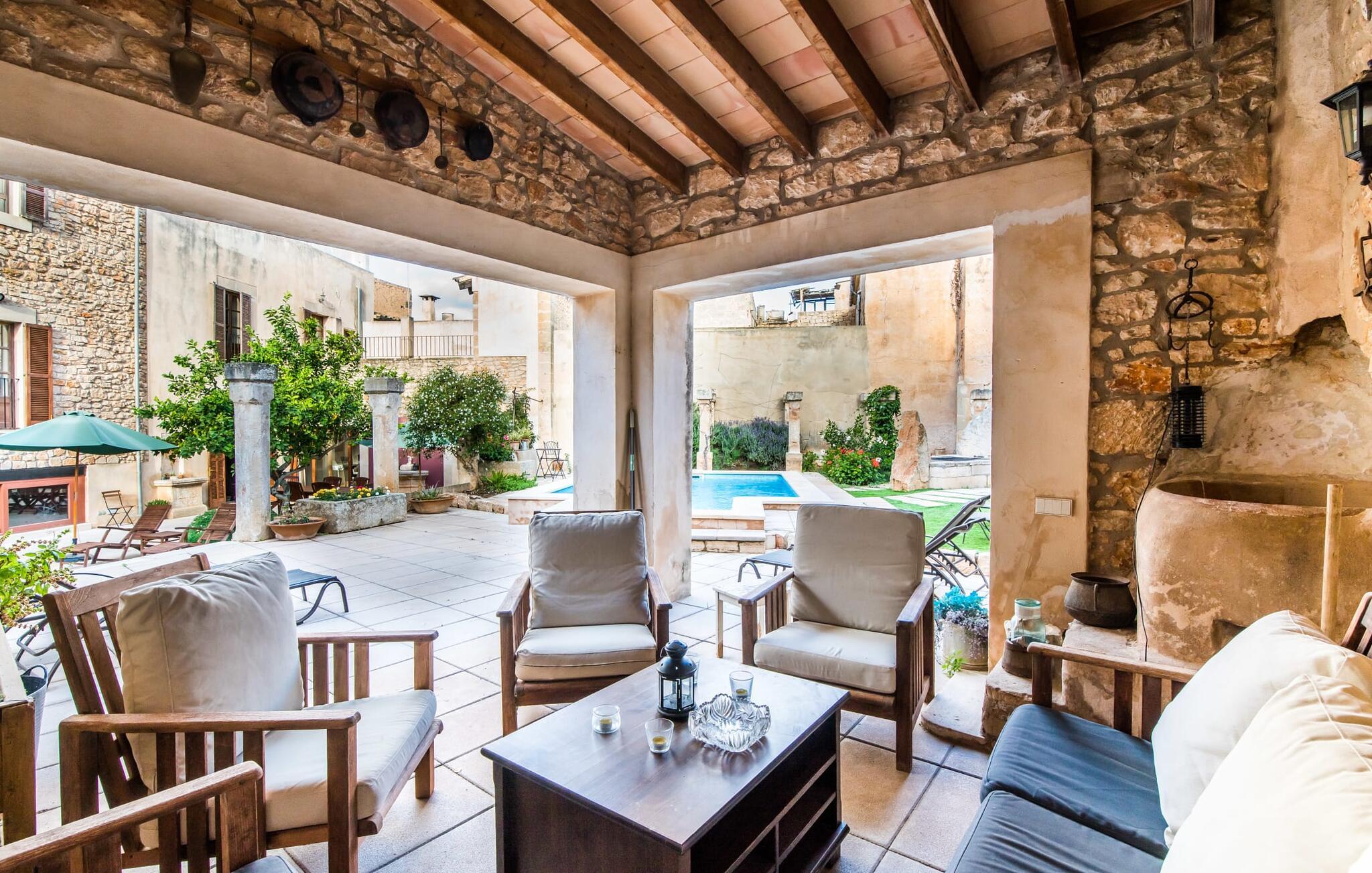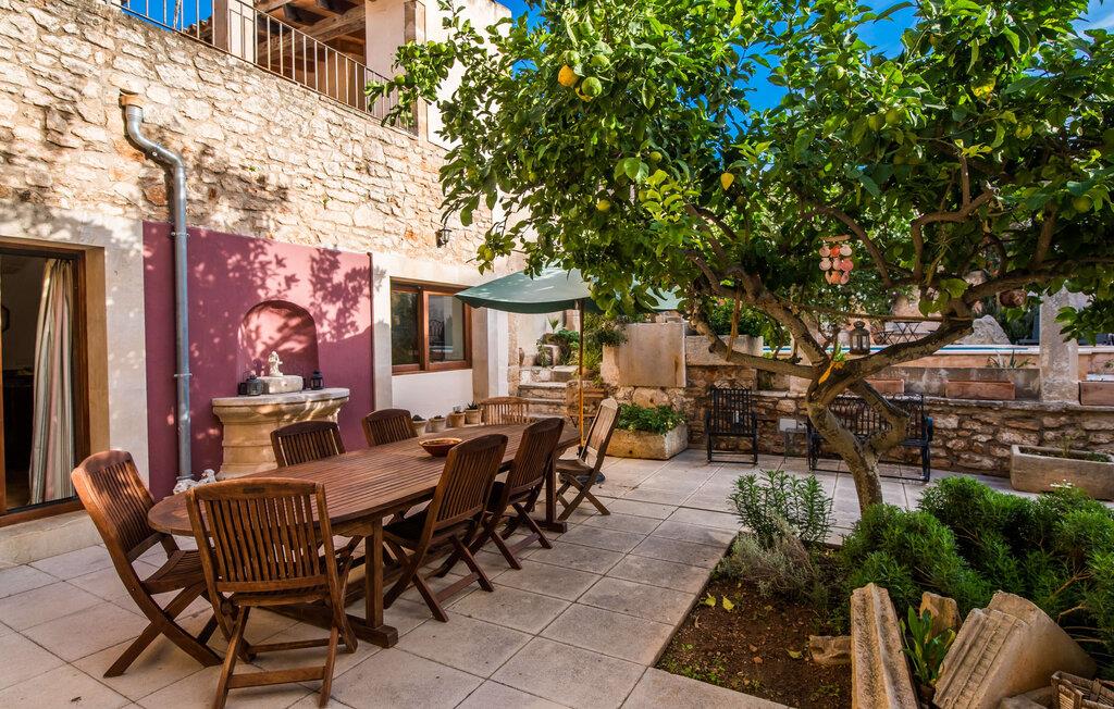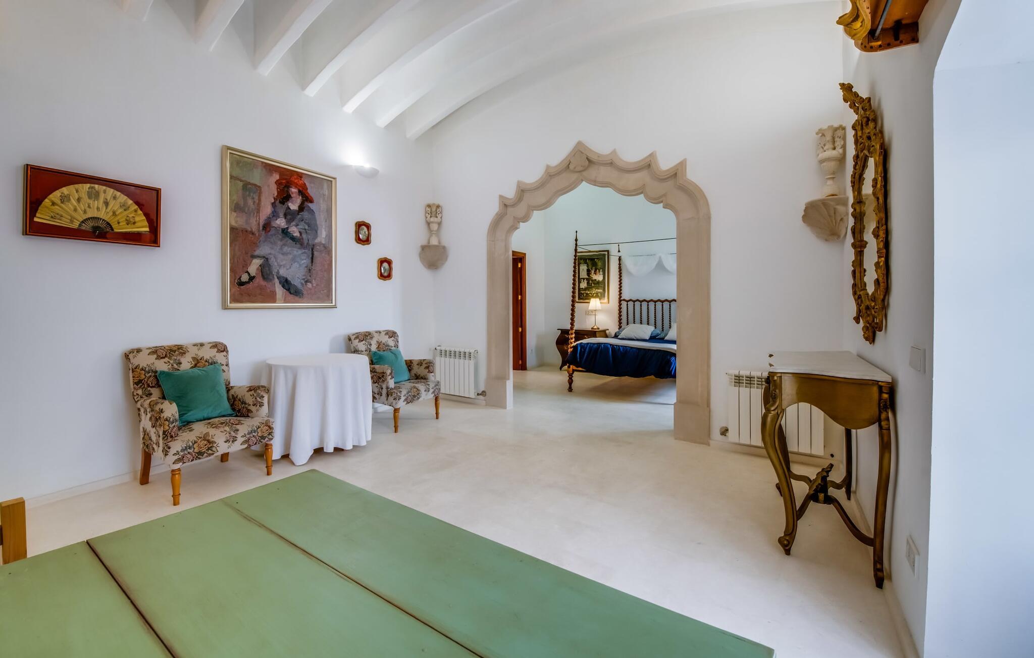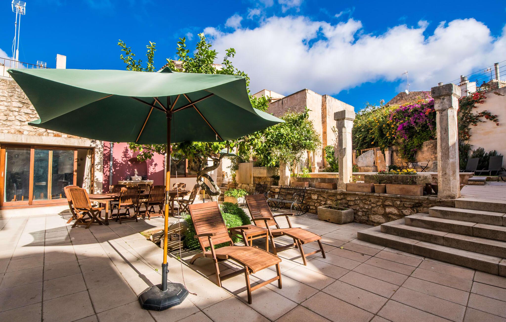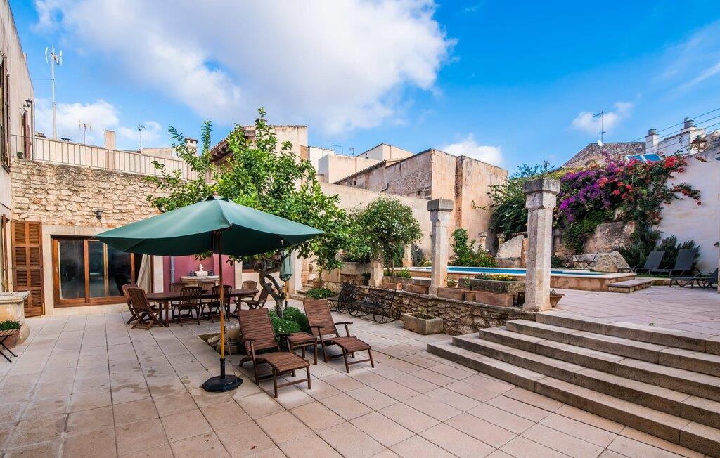 Attributten byhus beskriver næsten utilstrækkeligt den overvældende skønhed ved den traditionelle ejendom "Cal Senyor Damia". Denne statelige ejendom med mere end 600 m² boligareal er et af de gyldne sandstenshuse, som I normalt kun kan beundre udefra på en dagstur til Santanyí. Hvad man ikke kan se udefra, er den indre gårdhave, som er fuldstændig beskyttet mod indsyn, i al sin pragt. Dette tilbyder et privat tilbagetog i en utrolig charmerende atmosfære. I vil lære det "rigtige" Mallorca at kende i dets spændende historie. "Cal Senyor Damia" fortæller os noget om det ikke altid stille liv i byen - hvordan det var i går, og hvordan det stadig er i dag. Frodige blomstrende planter, citrustræer og utallige planter dekorerer den historiske sandsten og tilbyder jer vidunderlig privatliv. Flotte siddepladser langs gamle mure, terrasser, caféborde og en muret grill giver den indre gårdhave sit smukke udseende. Lyset og atmosfæren forstærkes af ældgamle relikvier som søjler, gårdspringvand, landbrugsredskaber og en overdækket lounge. I har valget mellem flere spiseområder for at nyde de solide lækkerier fra murstensgrillen på ethvert tidspunkt af dagen. Selvfølgelig kan I også gøre dette indendørs, i en atmosfære, der ikke er mindre euforisk. Mares buer, stenbrud, hvælvede lofter, forskudte niveauer er grundlaget for dette traditionelle mallorcanske feriehus af absolut højeste klasse. Kombinationen mellem antikke detaljer og moderne komfort, mellem barok og moderne design, er særlig vellykket. I skal blot bukke under for denne charmerende offensiv, der venter jer på tværs af hele lejeområdet på generøse 636 m² fordelt på fire etager. I stueplan er der foyer svarende til bygningens status, lys stue med udsigt til den indre gårdhave, hyggelig pejsestue, fuldt udstyret køkken-alrum med de mest moderne bekvemmeligheder samt gæstetoilet. Sovepladserne er fordelt på de tre øverste etager i etager. Soveværelserne opfylder ikke kun deres oprindelige formål, men er også steder for tilbagetog på grund af deres størrelse. De er også udstyret med tv, nogle med pejse, siddepladser og walk-in closet mv. Tagstudiet byder også på et kæmpe værelse med fitness- og legeredskaber på baggrund af en stor terrasse. Sørg for at tage et kig på badeværelserne – cool design med et konkret look og highlights som brusekabiner og badekarret indlejret i gulvet venter på jer. Dette spektakulære rækkehus med sin gennemtænkte indretning er ideel til flere familier - nyd jeres ferie! Det nænsomt renoverede feriehus "Cal Senyor Damia" giver et indblik i Mallorcas byliv med sin historisk designede, ø-typiske gårdhave. Beliggende midt i den rolige kunstnerlandsby Santanyí i den sydøstlige del af Mallorca, kan I lære dette populære sted at kende til fods. I bør ikke gå glip af det ugentlige marked på lørdag. På grund af den centrale beliggenhed behøver I kun lejebilen for at udforske området eller besøge den turkise badebugt Cala Santanyí, som kun ligger 8 minutter væk.