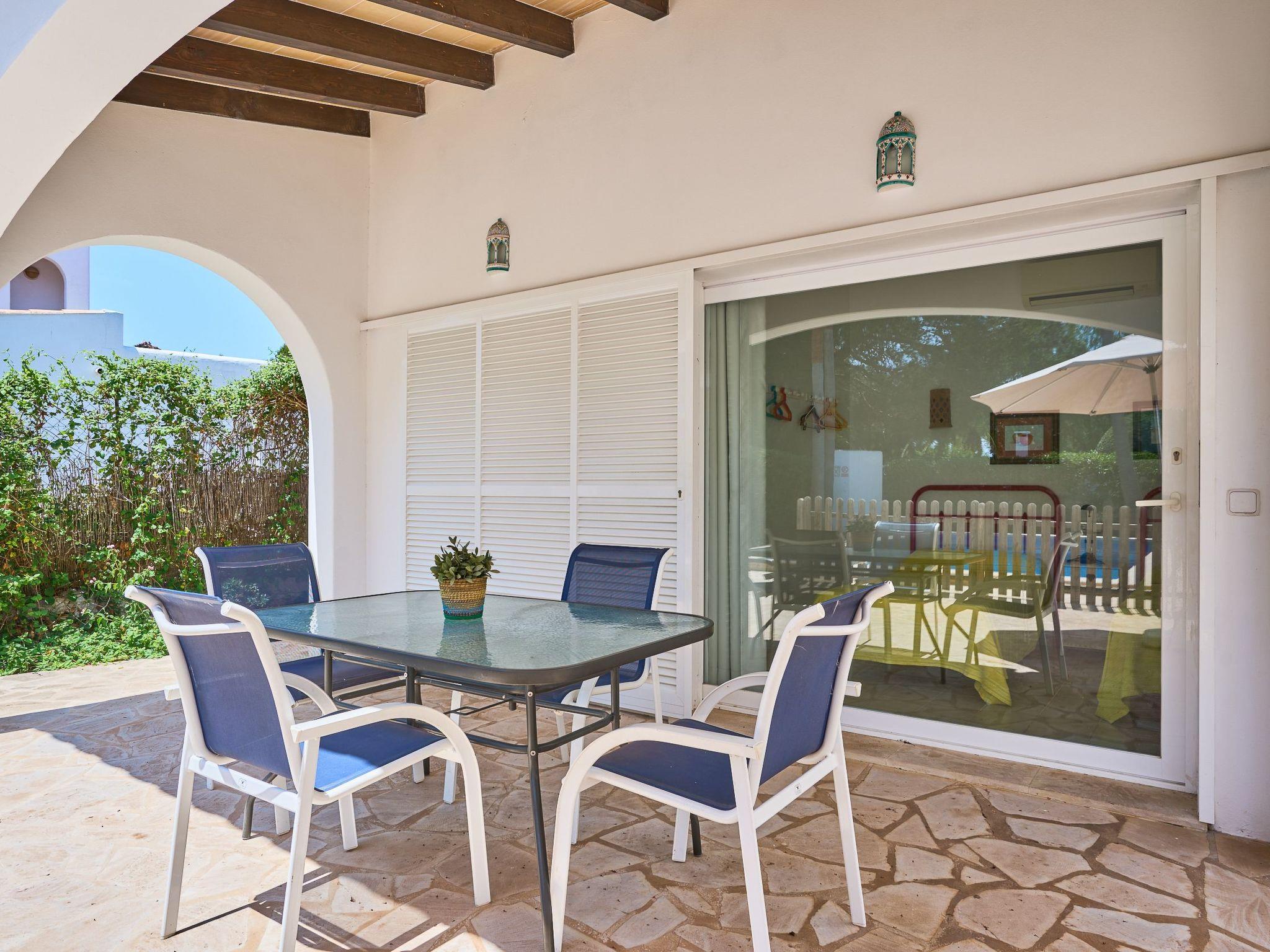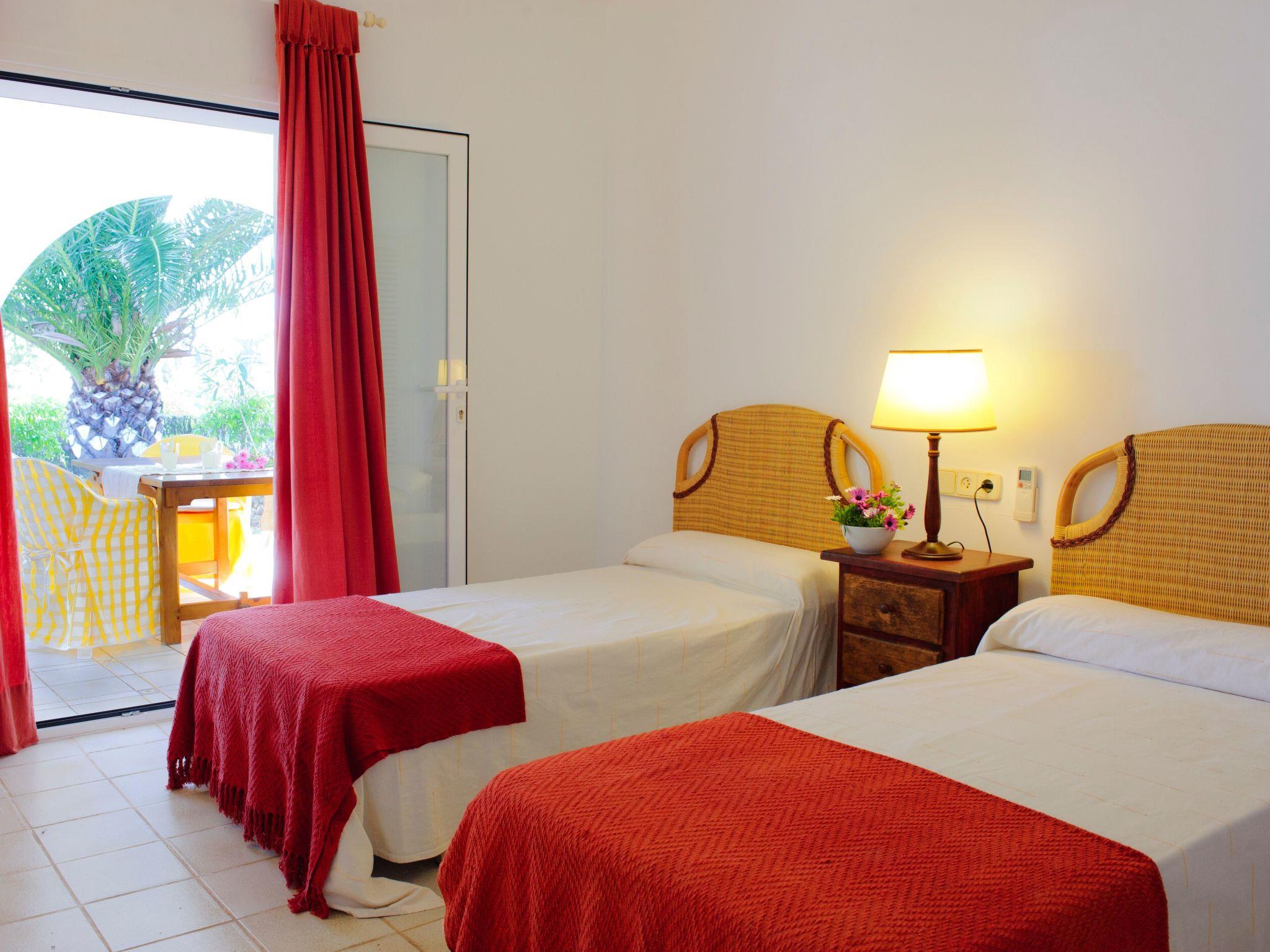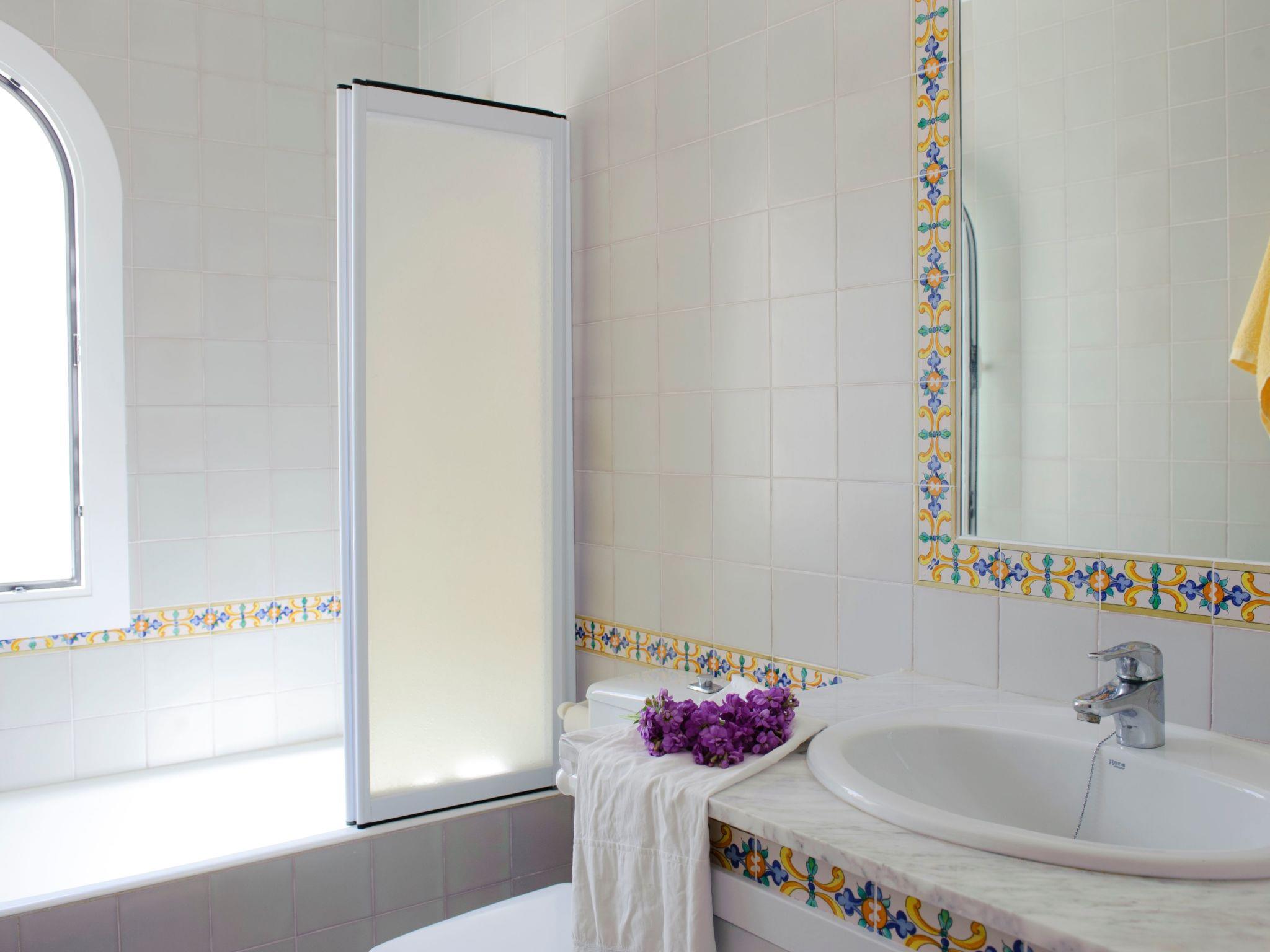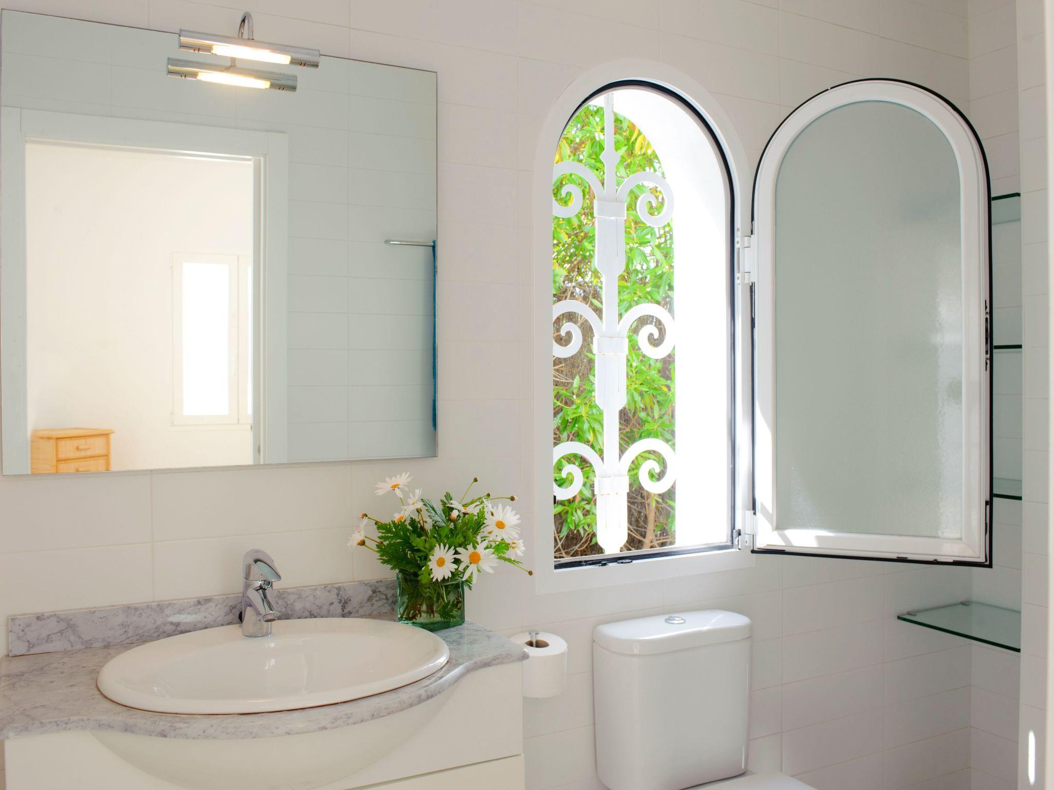 Acebuche is a beautiful Ibizan-style house, airy and with plenty of natural light, covered terraces and a large garden with lawns. The house is divided into two floors, plus a "casita" (small cottage) by the pool with a small bedroom with two single beds, an en-suite shower and a small covered terrace. On the ground floor of the main house is the open-plan living and dining area with cosy sofas and a dining table. The living area leads out onto a large covered terrace and the garden. The well-equipped kitchen also leads to the outside area. The ground floor also has three bedrooms, two of which have two single beds each, both with access to the covered terrace. The two bedrooms share two bathrooms, one with a bathtub and the other with two showers. The third bedroom is equipped with two single beds and an en-suite bathroom and has access to the terrace overlooking the pool. The upper floor houses a large bedroom with double bed, en-suite bathroom and dressing area. There is direct access to the roof terrace from the bedroom. There is further access to the roof terrace via the garden.