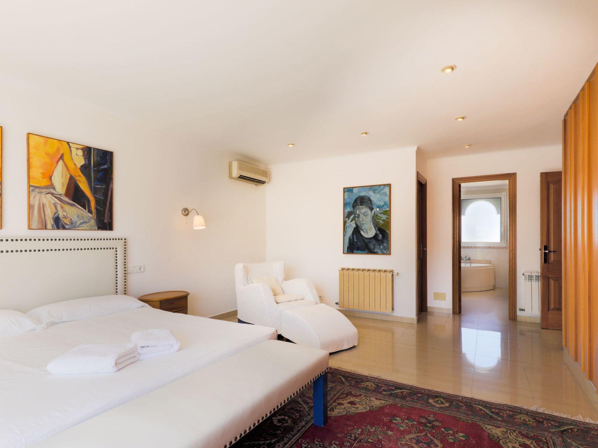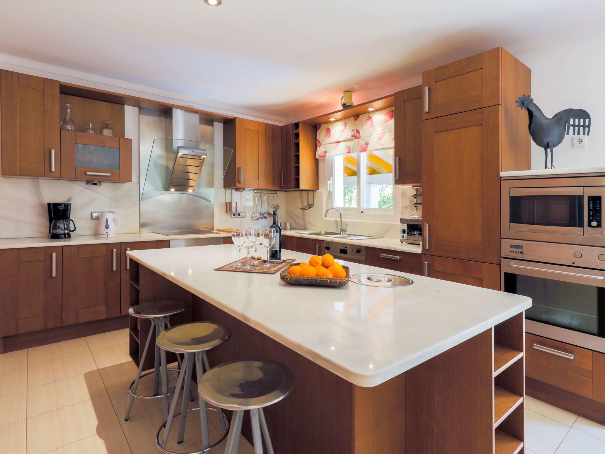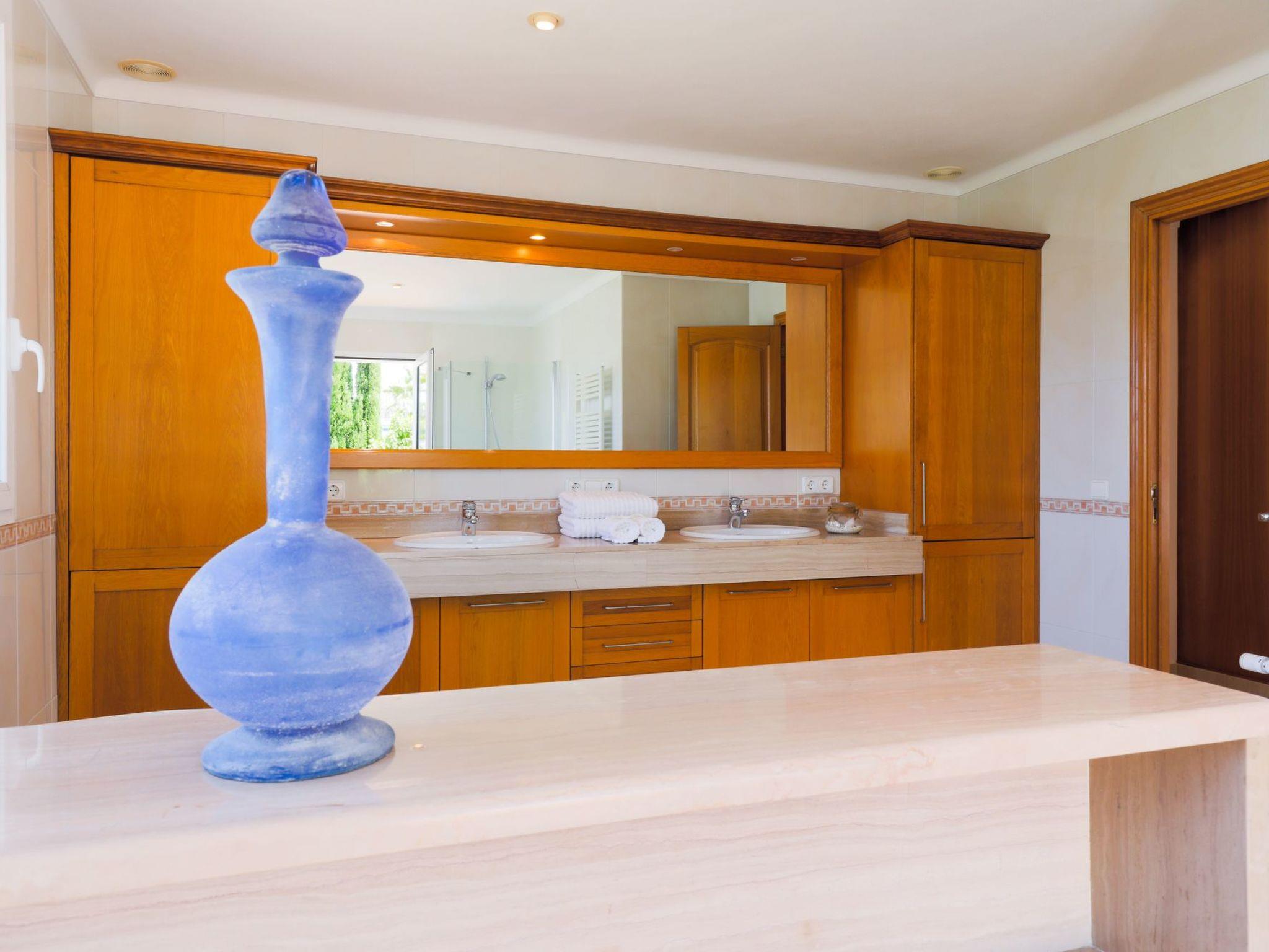 Villa Marques de Comillas 12 is a beautiful, detached villa over 2 floors. Large windows give the rooms plenty of natural light and an airy ambience. The ground floor has high-quality wooden laminate flooring and all rooms have both air conditioning and central heating. The ground floor has a spacious lounge with comfortable seating, TV, DVD and music system. Large sliding glass doors lead out onto the covered terrace, which is furnished with beautiful wooden outdoor furniture. The spacious dining room is very tastefully furnished, with a staircase connecting the ground floor with the upper floor. The modern kitchen with a large cooking island is equipped to a high standard and also offers ample seating. There is also a utility room with washing machine, tumble dryer, iron and ironing board as well as a guest toilet. A bedroom with two single beds as well as a full bathroom (shower and bath) en suite and access to the outside area complete the ground floor. Upstairs is the spacious master bedroom with two single beds joined together as a double bed, a dressing room and a fantastic en suite bathroom with a large Jacuzzi bath and a separate shower. The room has access to an outside terrace overlooking the garden and pool area. Furthermore, this floor offers another double bedroom with 2 single beds and one with a double bed. Both bedrooms have en suite bathrooms with a Jacuzzi bath and a small terrace.