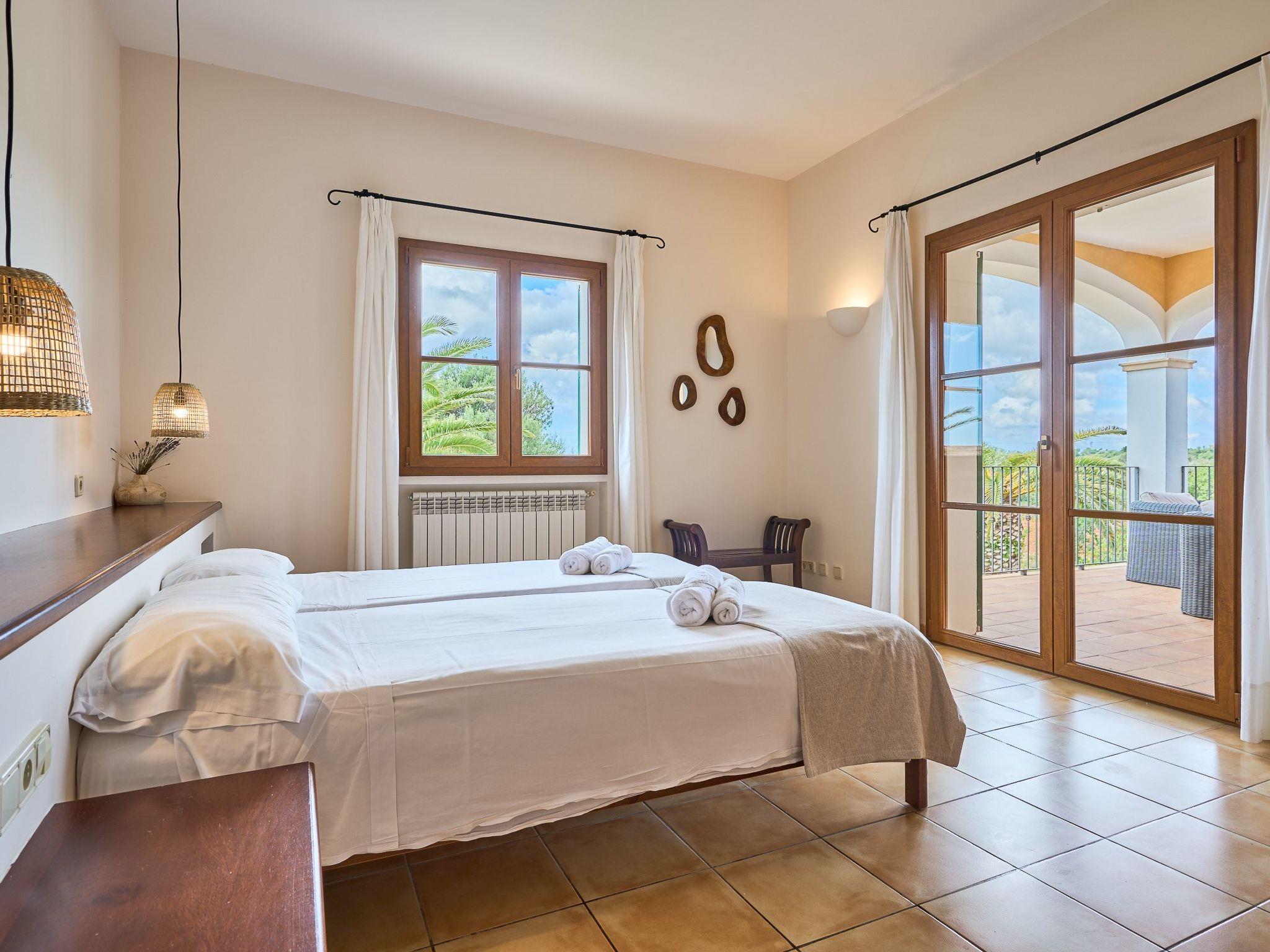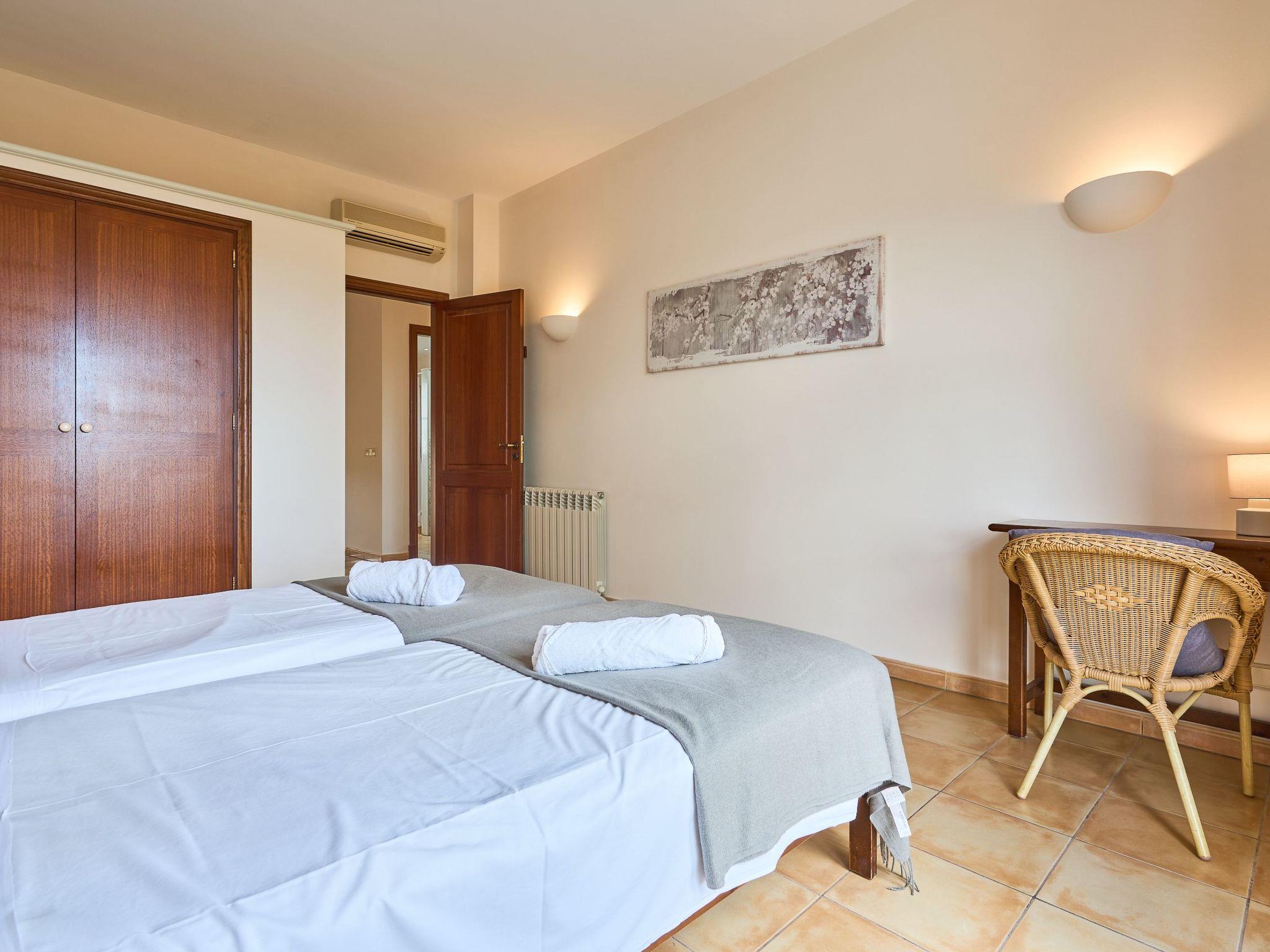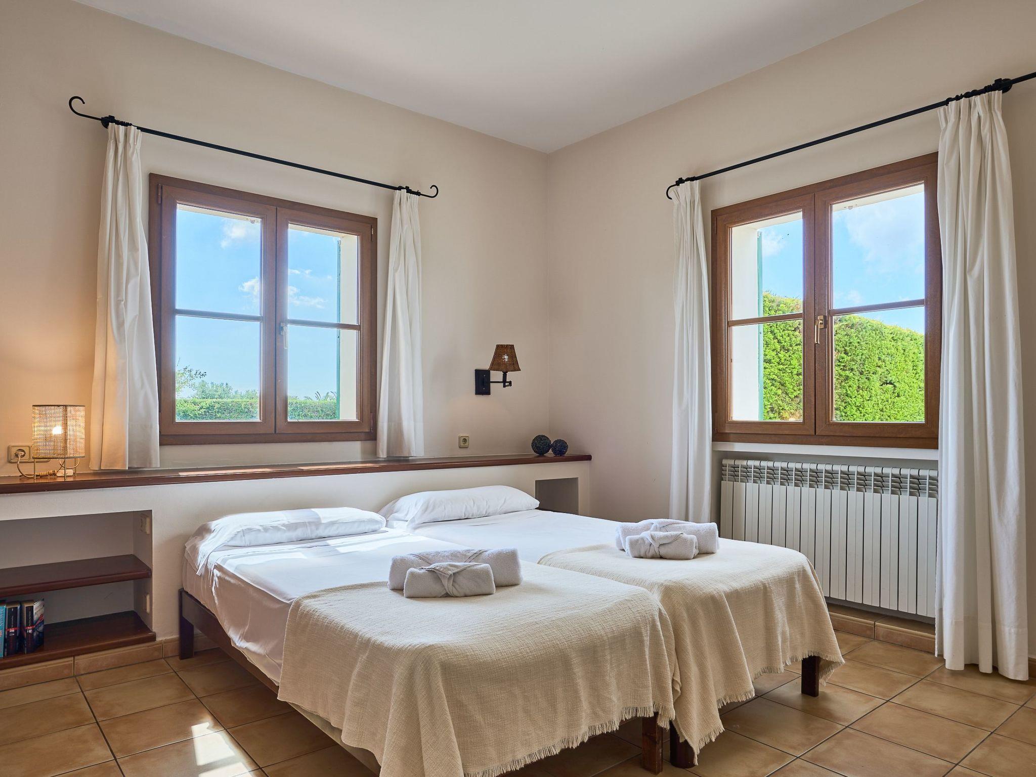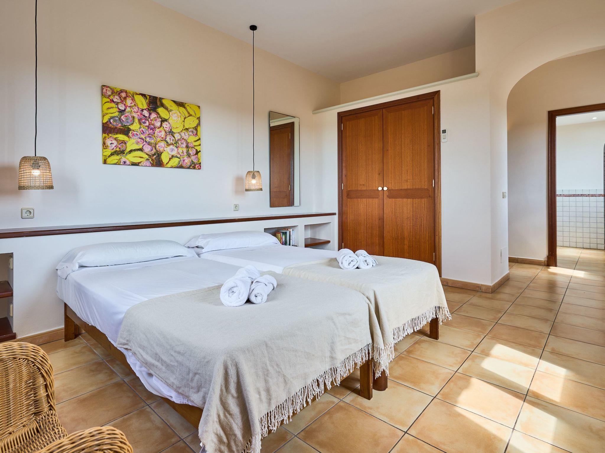 The finca extends generously over two floors. On the ground floor there is a large living/dining room with sofas and an oak dining table. Access to the pool terrace. Fully equipped kitchen, breakfast table and pantry with additional fridge. Exit to the covered terrace with barbecue. Laundry room. On the ground floor there are two bedrooms with two single beds each and a bathroom.