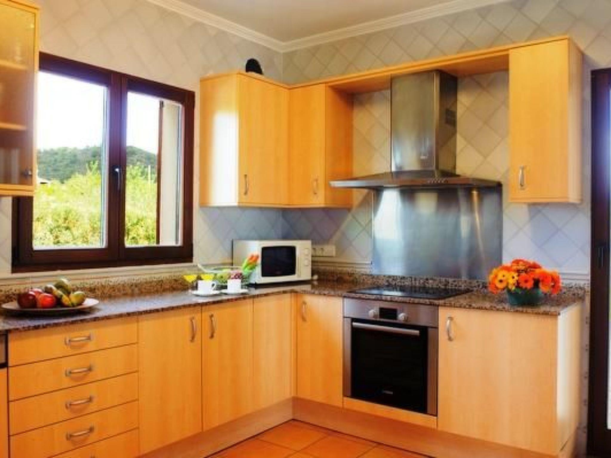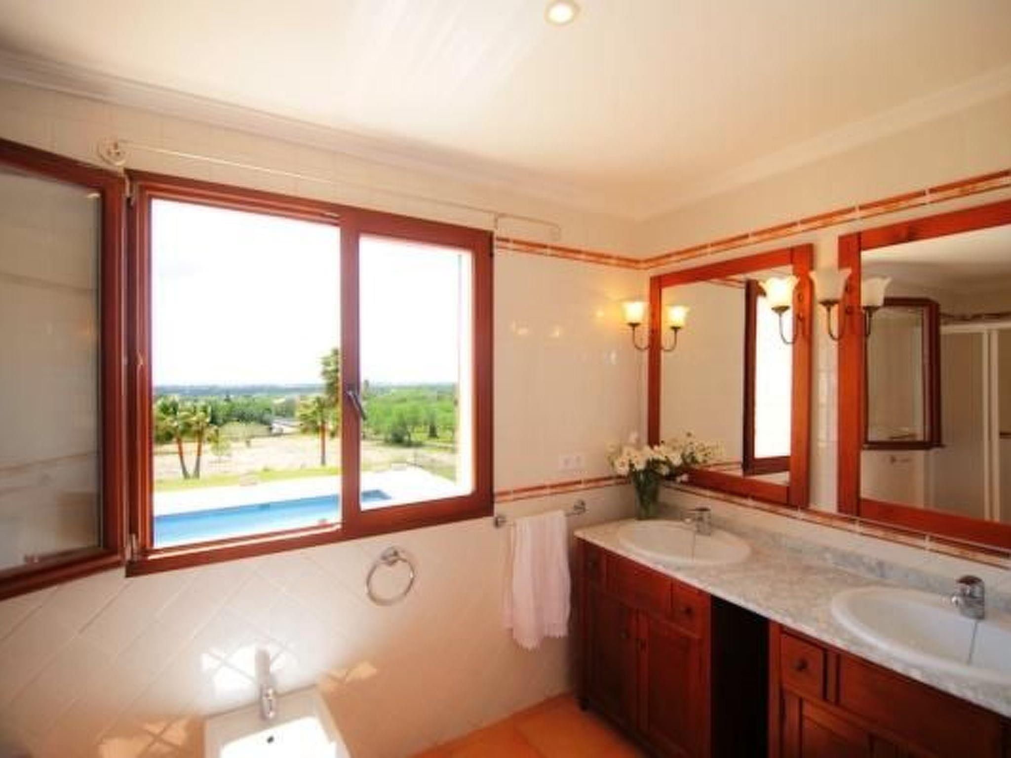Finca From the entrance area, you enter the bright dining area with sliding glass doors to the pool terrace. An open archway leads to the living area with cosy sofas, satellite TV, DVD and fireplace. The modern kitchen is superbly equipped. Next door is a bedroom with two single beds, bathroom and private access to the pool terrace. Upstairs is the master bedroom with two single beds, dressing area, en suite shower room and private sun terrace. The third bedroom, also with two single beds and dressing area, has an en-suite shower room. There is also a service room with washing machine in the basement. The house is very tastefully furnished to a high standard and equipped with ceiling fans and underfloor heating.