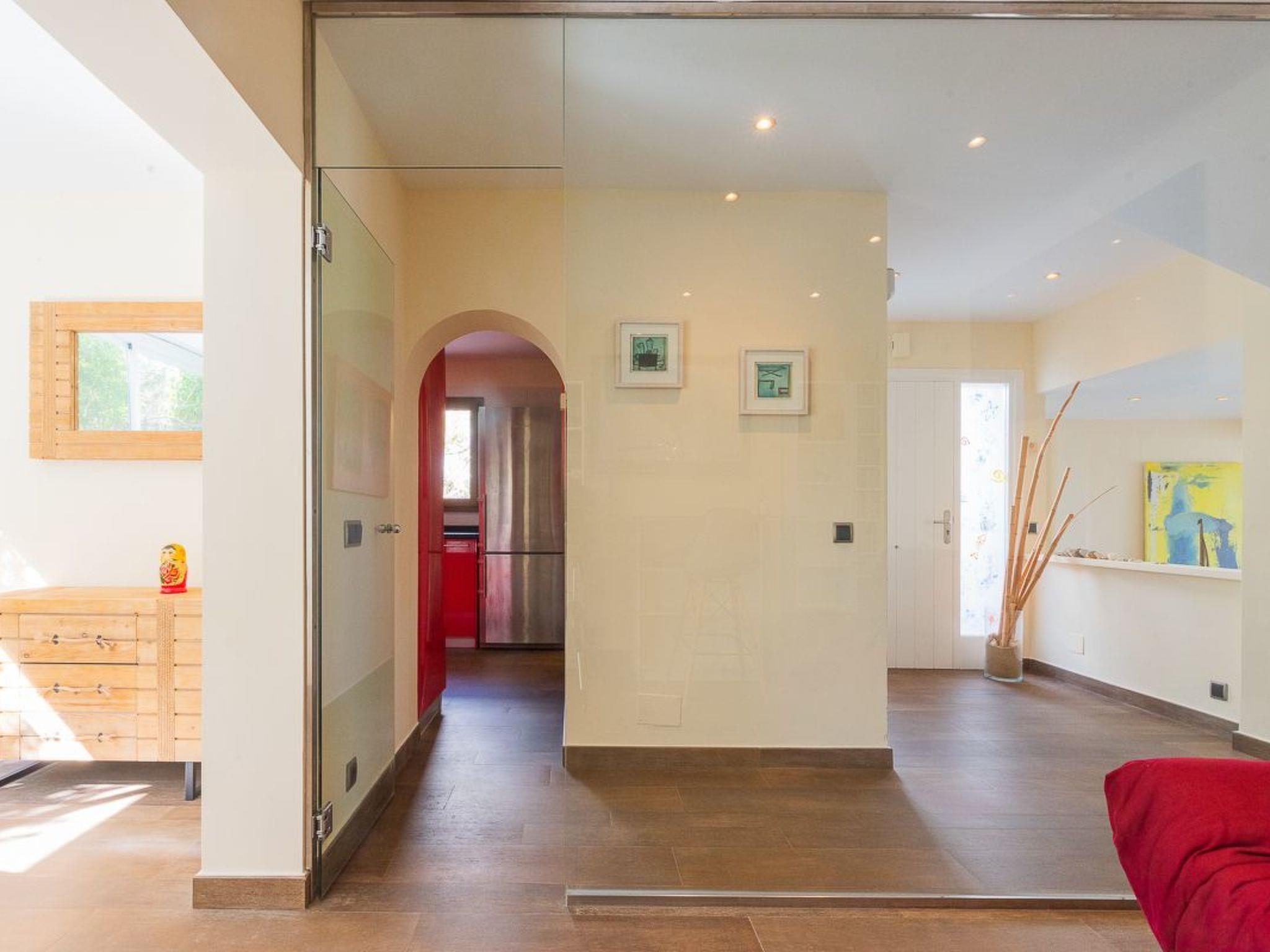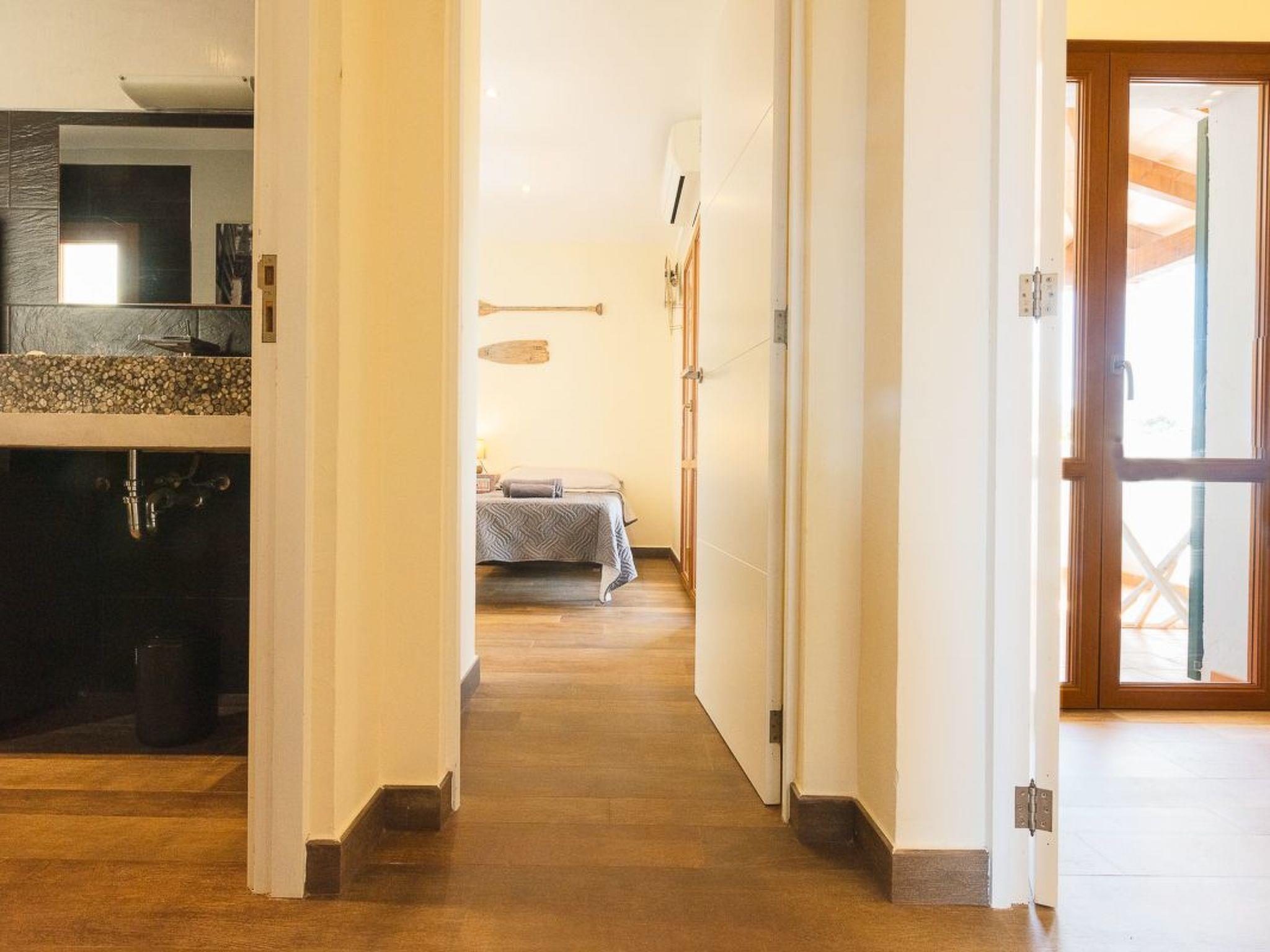House distributed on two floors decorated in beautiful bright colours. The ground floor has a well-equipped kitchen with plenty of storage space and a pantry. An open space connects the living room overlooking the terrace, the dining area and a small reading corner overlooking the pool and the porch where there is a table for al fresco dining, behind which extends the beautiful pool. A second area offers a sofa, a dining table and access to the garden. There is also a utility room and a guest toilet on the ground floor. There are three bedrooms on the first floor. One with a double bed - view of the sea from the bed -, an en-suite bathroom with shower and access to a private terrace with stunning views of the sea. The other two bedrooms, one with a double bed and the other with two single beds, share a separate bathroom with bathtub and access to a small terrace overlooking the garden.