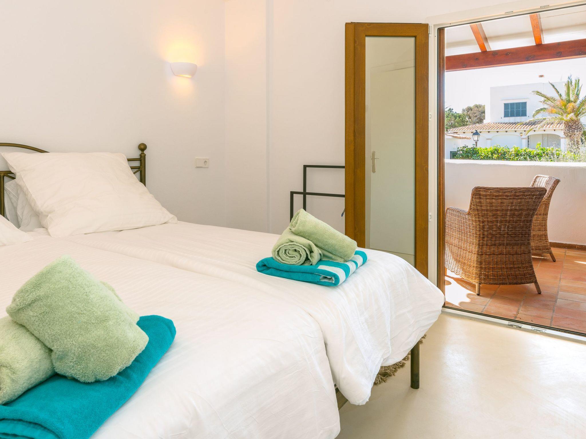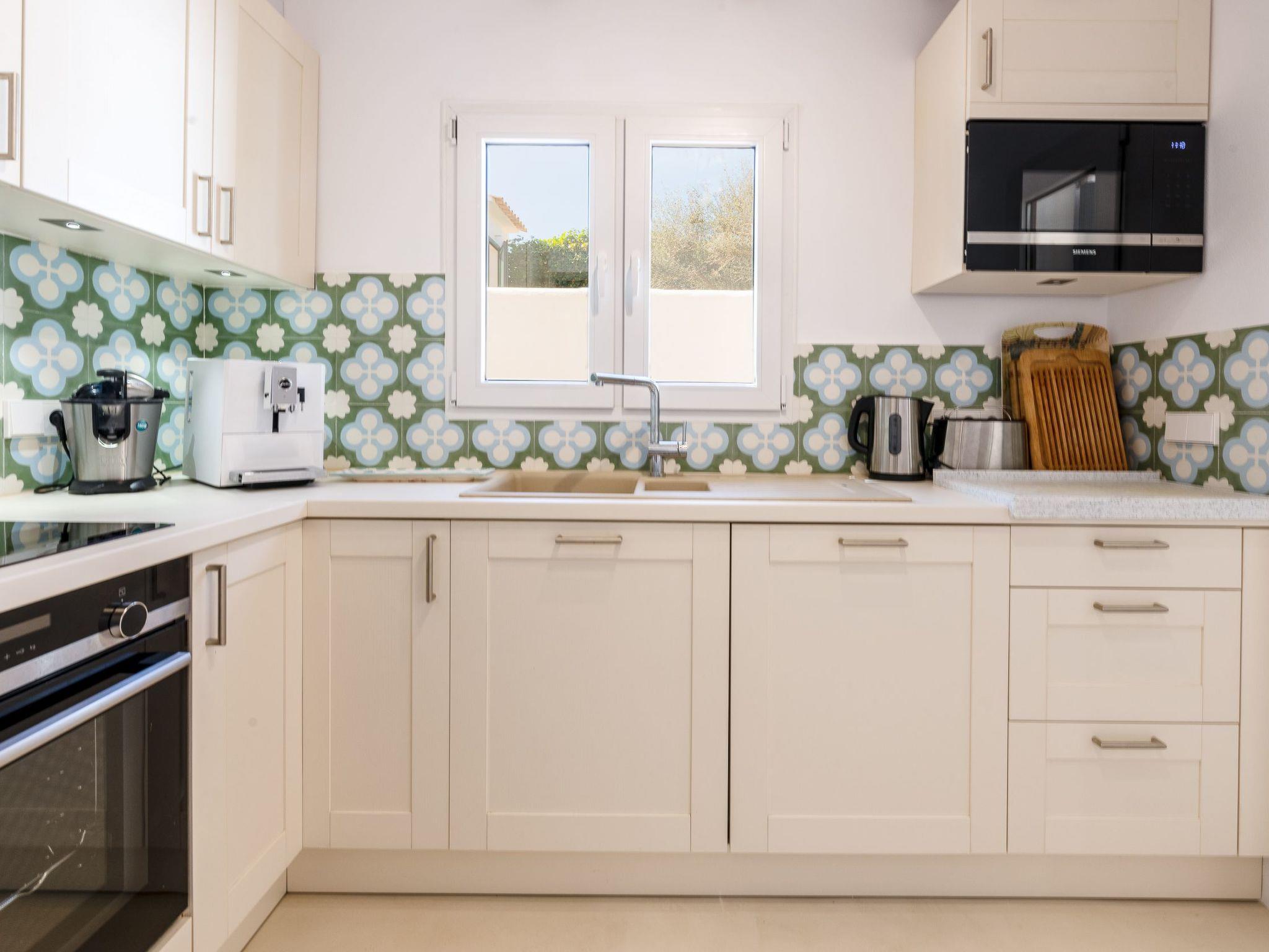 The house is spread over two floors, the furniture in neutral colours with accentuated splashes of colour gives the interior of the house a cosy, relaxing atmosphere. The bathrooms and kitchen have a vintage style and the ground floor has a kitchen with pantry, where the washing machine and tumble dryer are located. The dining room offers access to a terrace overlooking the garden. The living area is very cosy and has a reading corner, both offer access to the main covered terrace with views of the pool and the sea. A guest toilet completes the ground floor. There are three double bedrooms on the first floor. One of them offers an en suite shower room and a private balcony with incredible sea views. The other two bedrooms share a separate bathroom with bathtub and access to a balcony overlooking the garden.