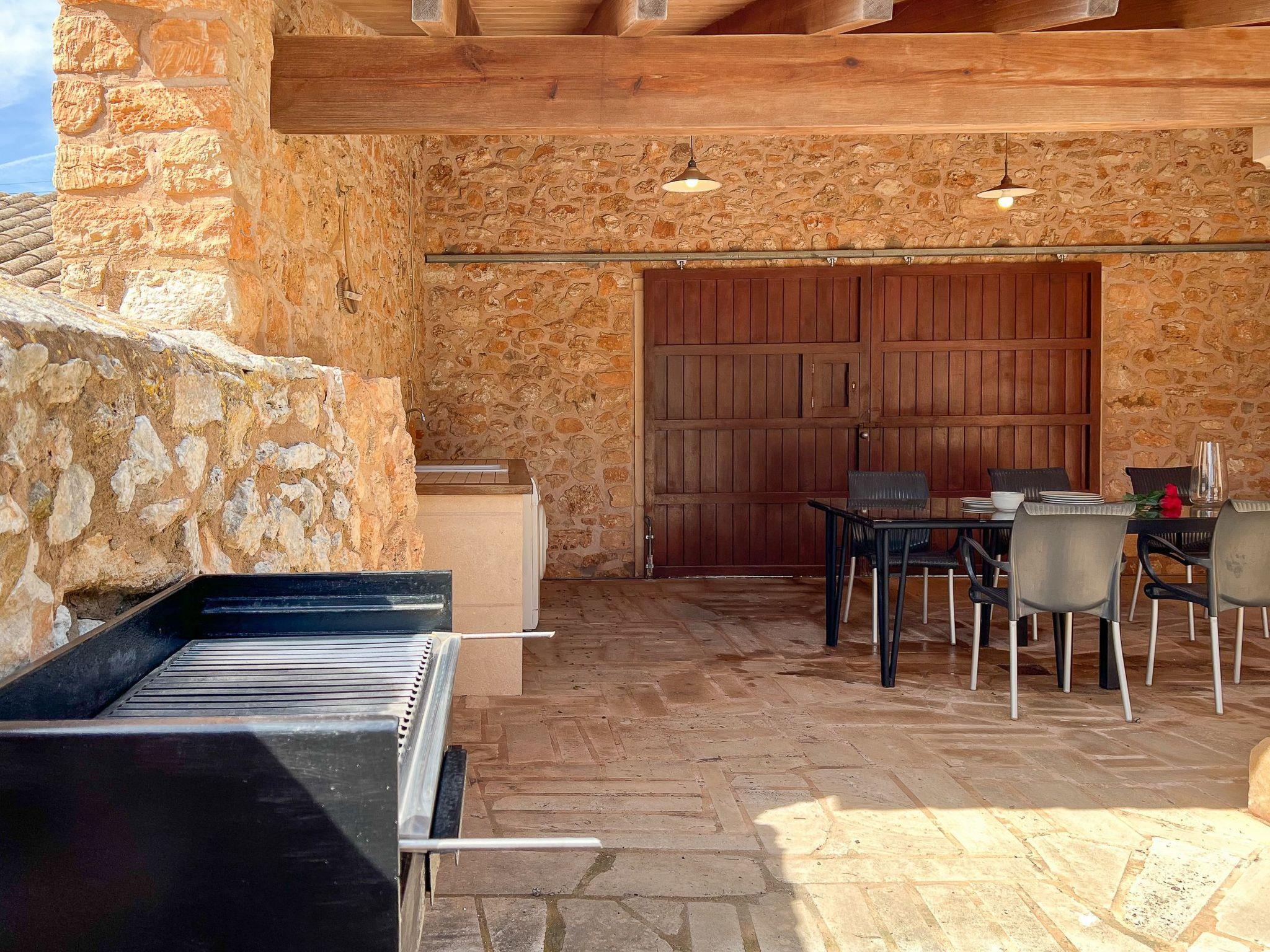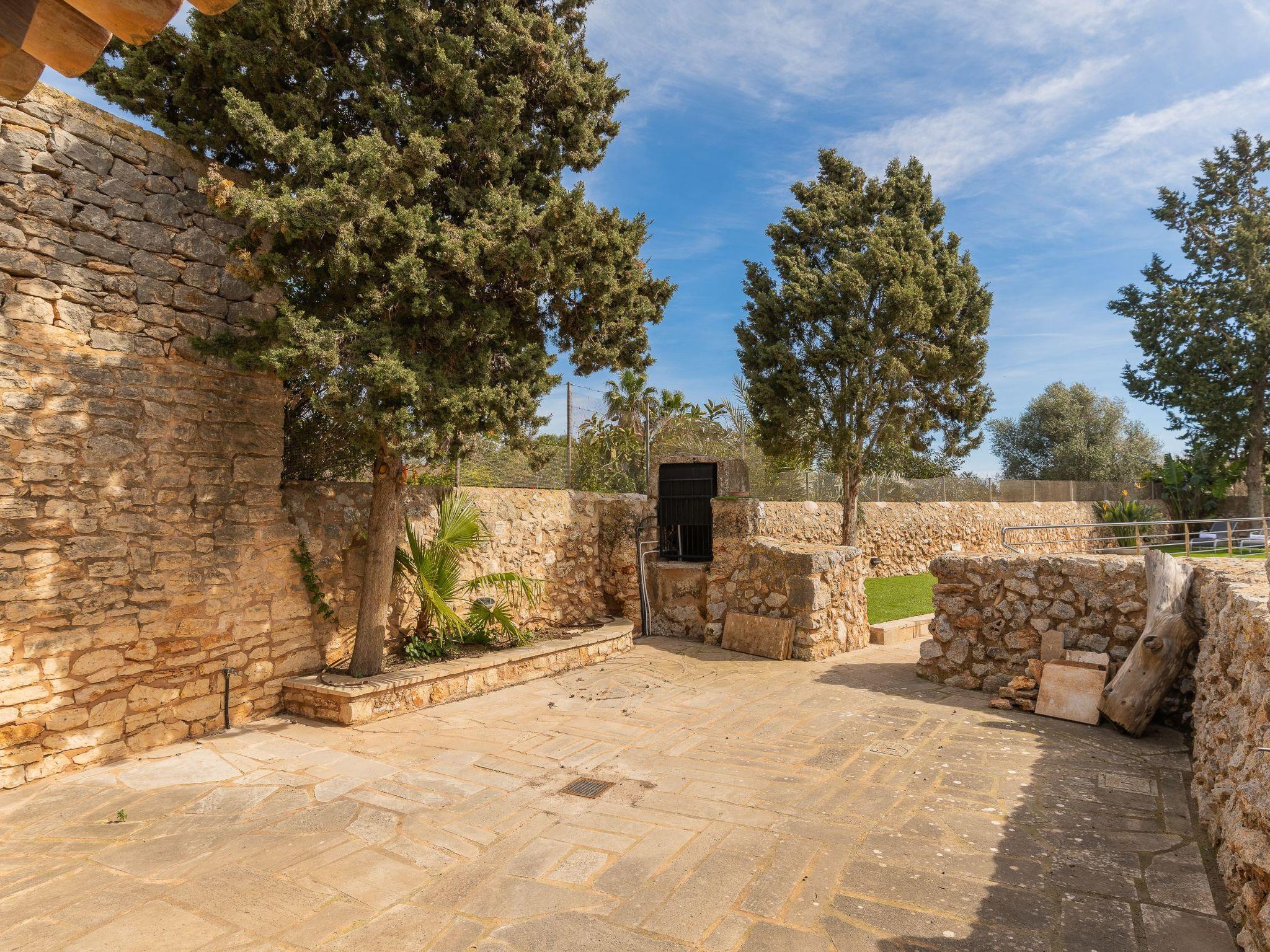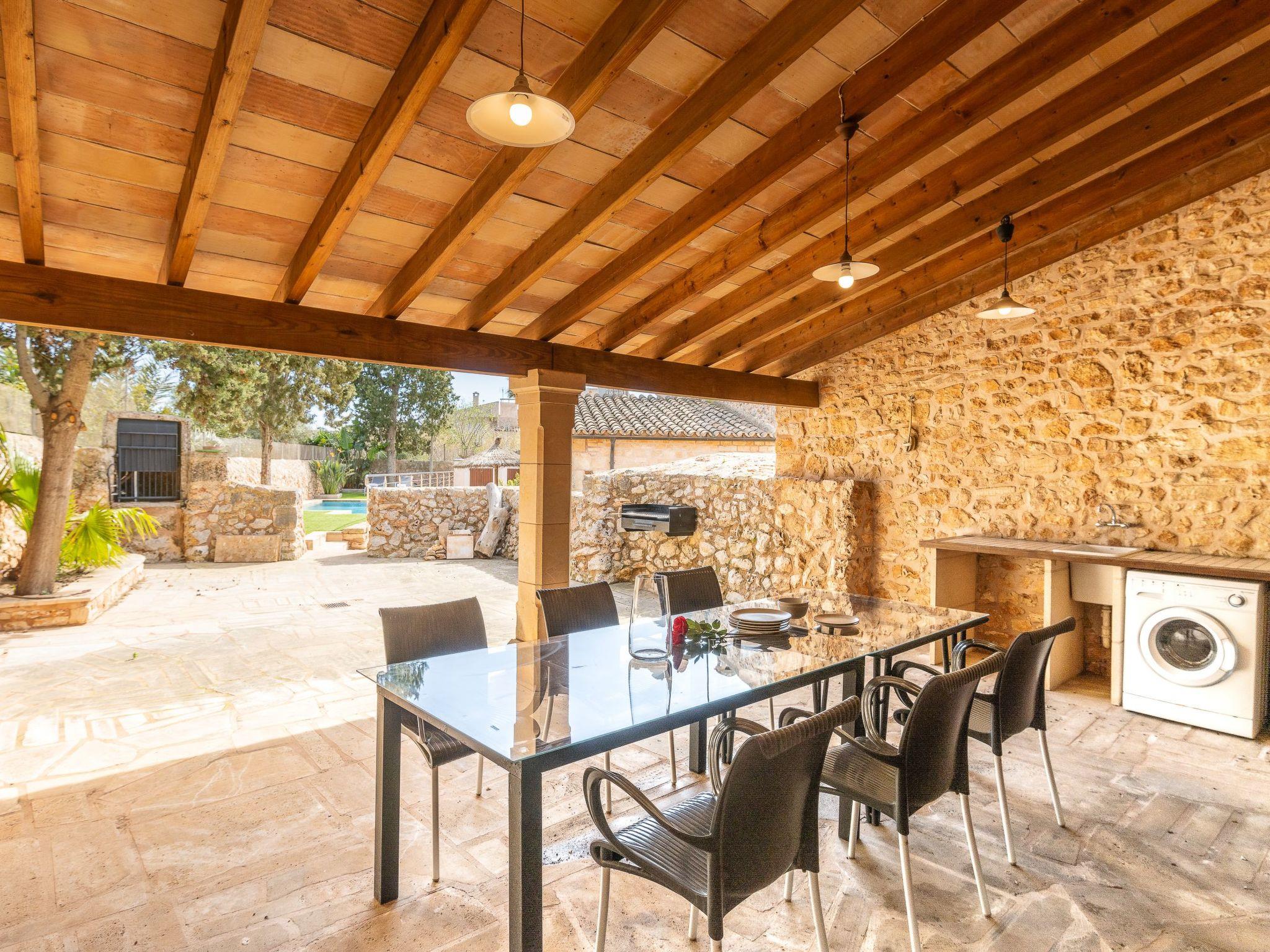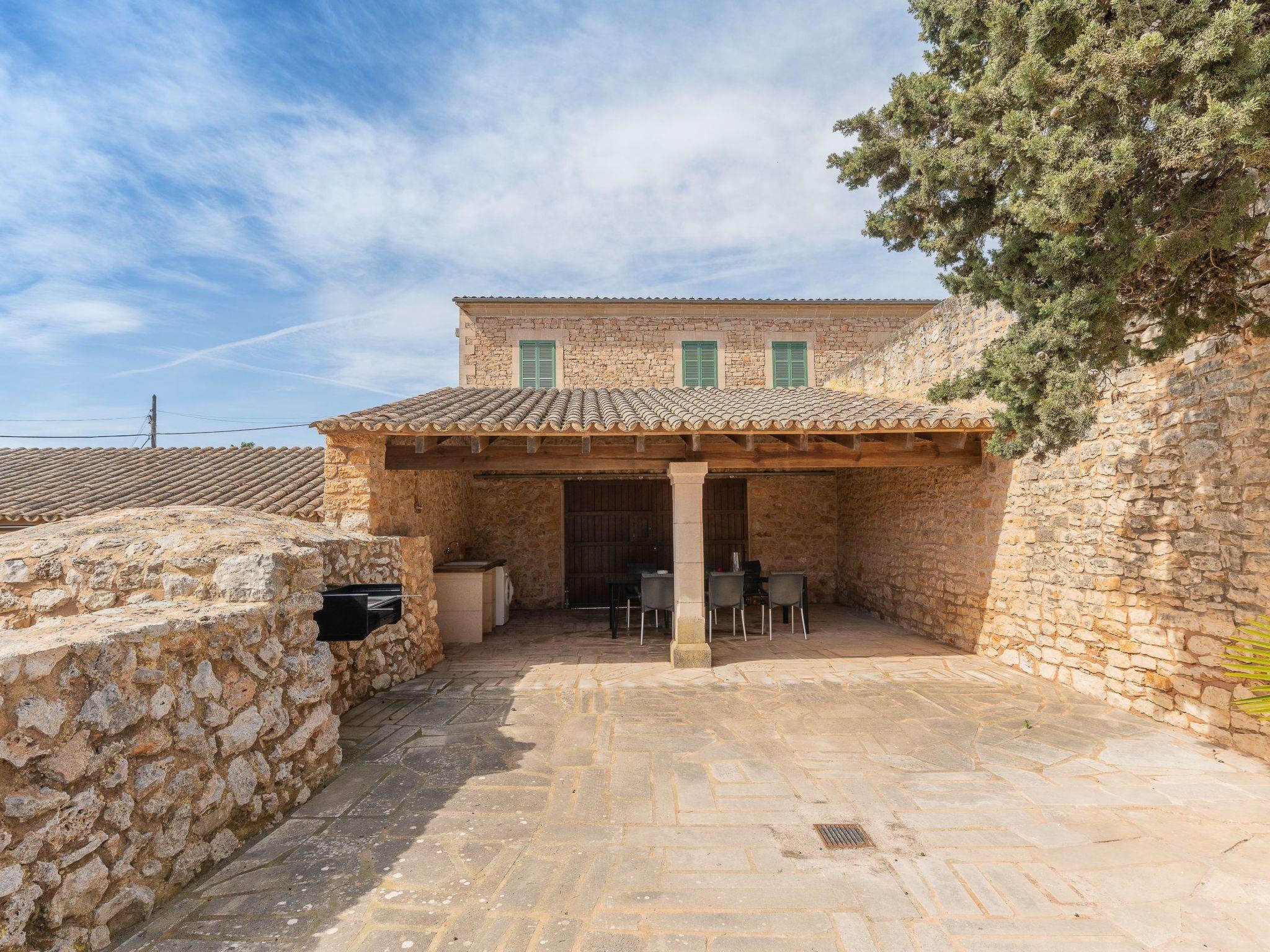 From the dining room and the kitchen you have access to the courtyard with the slightly higher pool area. The beautiful patio, partly covered, the Mallorcan porch is equipped with a barbecue and the dining area with furniture invites you to enjoy culinary delights and barbecues. There is a large courtyard in front of the house, which is ideal for playing.
