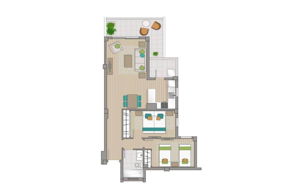 På 2. etage: (entre, Stue(enkeltsovesofa, Fjernsyn, DVD-afspiller, radio, CD-afspiller, klimaanlæg), Køkken(kakkelovn, kogeplade, elkedel, brødrister, mikrobølgeovn, opvaskemaskine , køleskab, fryser, klimaanlæg), soveværelse(dobbeltseng, klimaanlæg), soveværelse(dobbeltseng, klimaanlæg), badeværelse(bruser, håndvask, toilet, Håndklæder inkl.), pulterkammer(vaskemaskine, strygebræt, strygejern)) vaskemaskine, balkon, havemøbler, strygebræt, strygejern