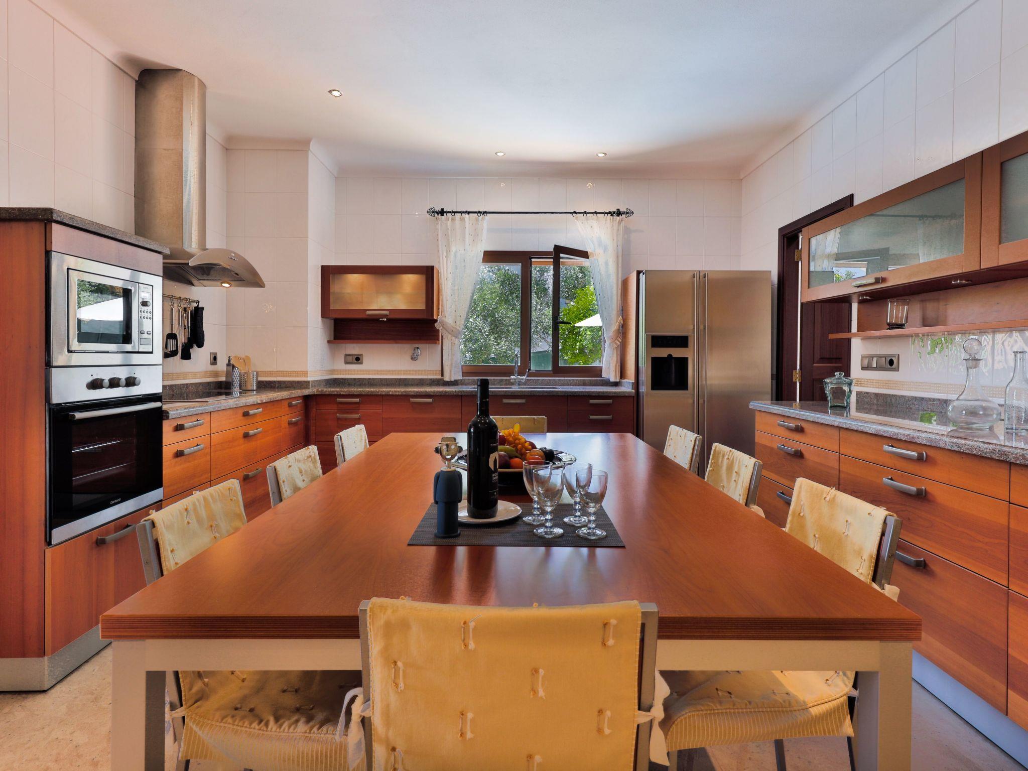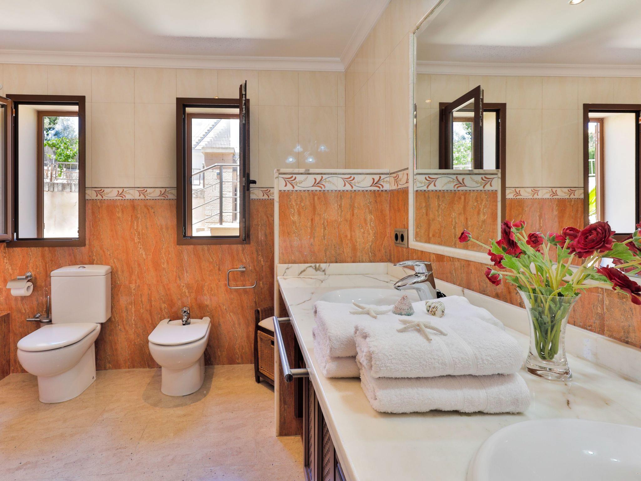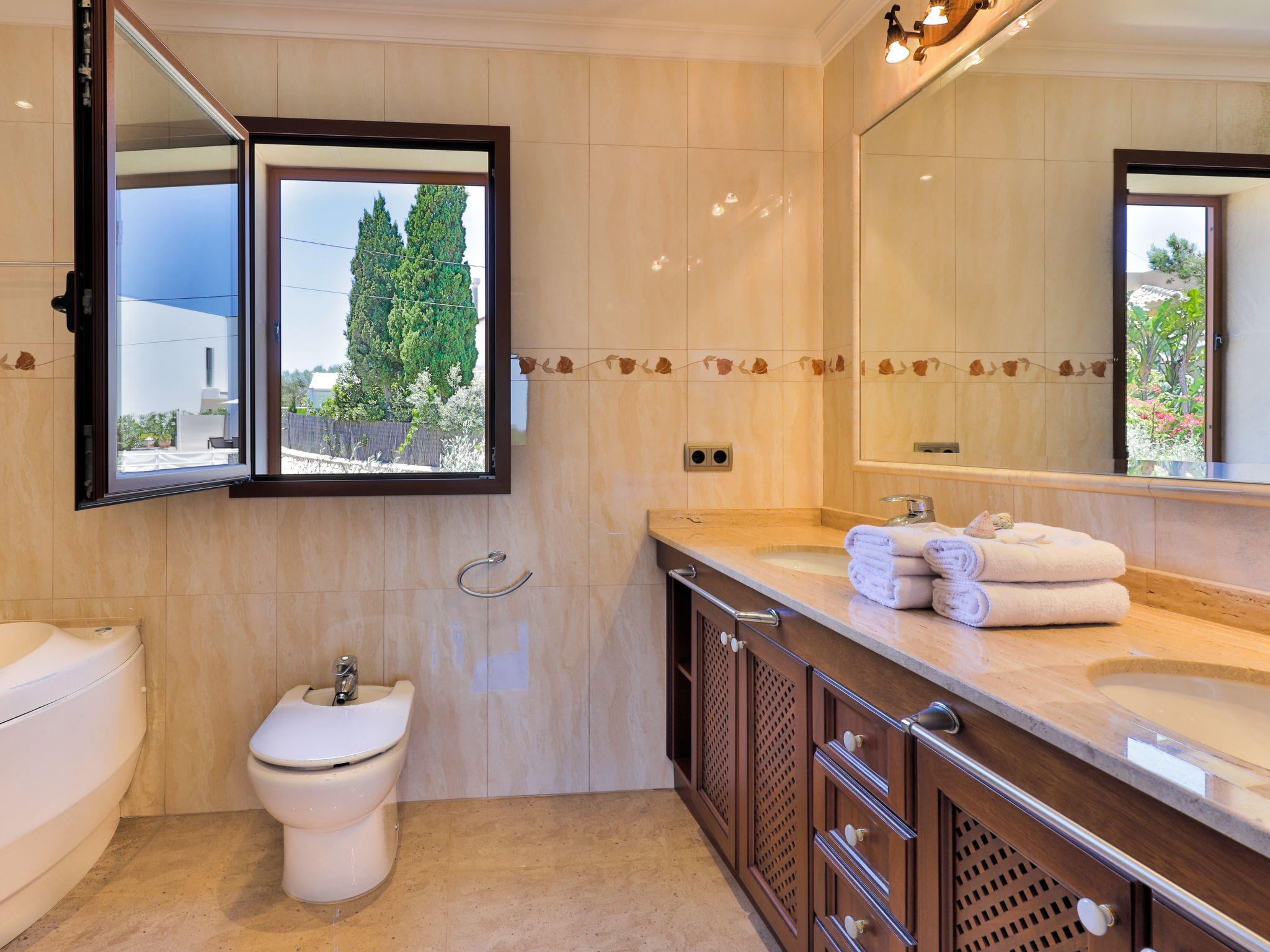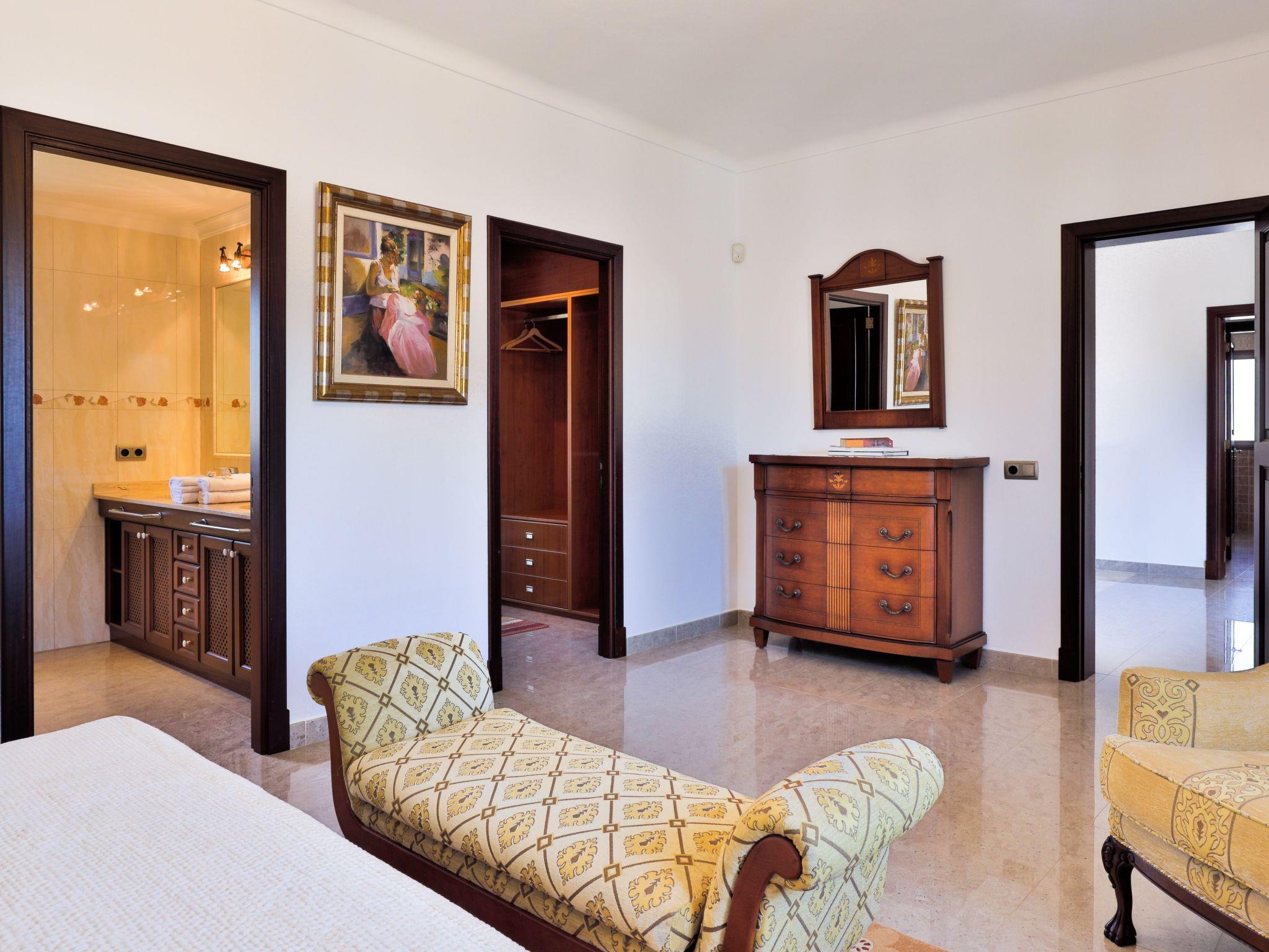 House on two levels. On the ground floor is the living room with access to the veranda and the pool. The large kitchen is also a dining room with a large table and has access to the pool area. A pantry is located next to the kitchen and the laundry room. There is also a bedroom with double bed and en suite bathroom with bathtub on the ground floor. Guest toilet. There are two further bedrooms on the first floor. The master bedroom with double bed, dressing room and bathroom en suite with corner bath - jacuzzi not available. A second bedroom with double bed. This bedroom has its own small terrace and a separate bathroom with shower.