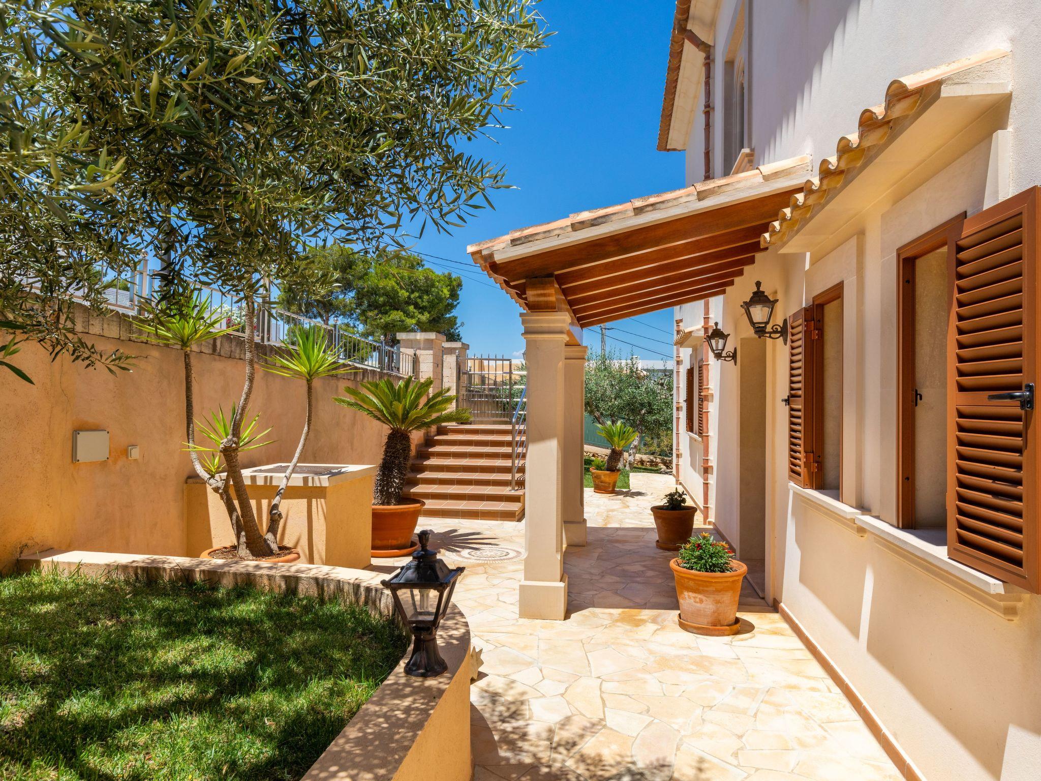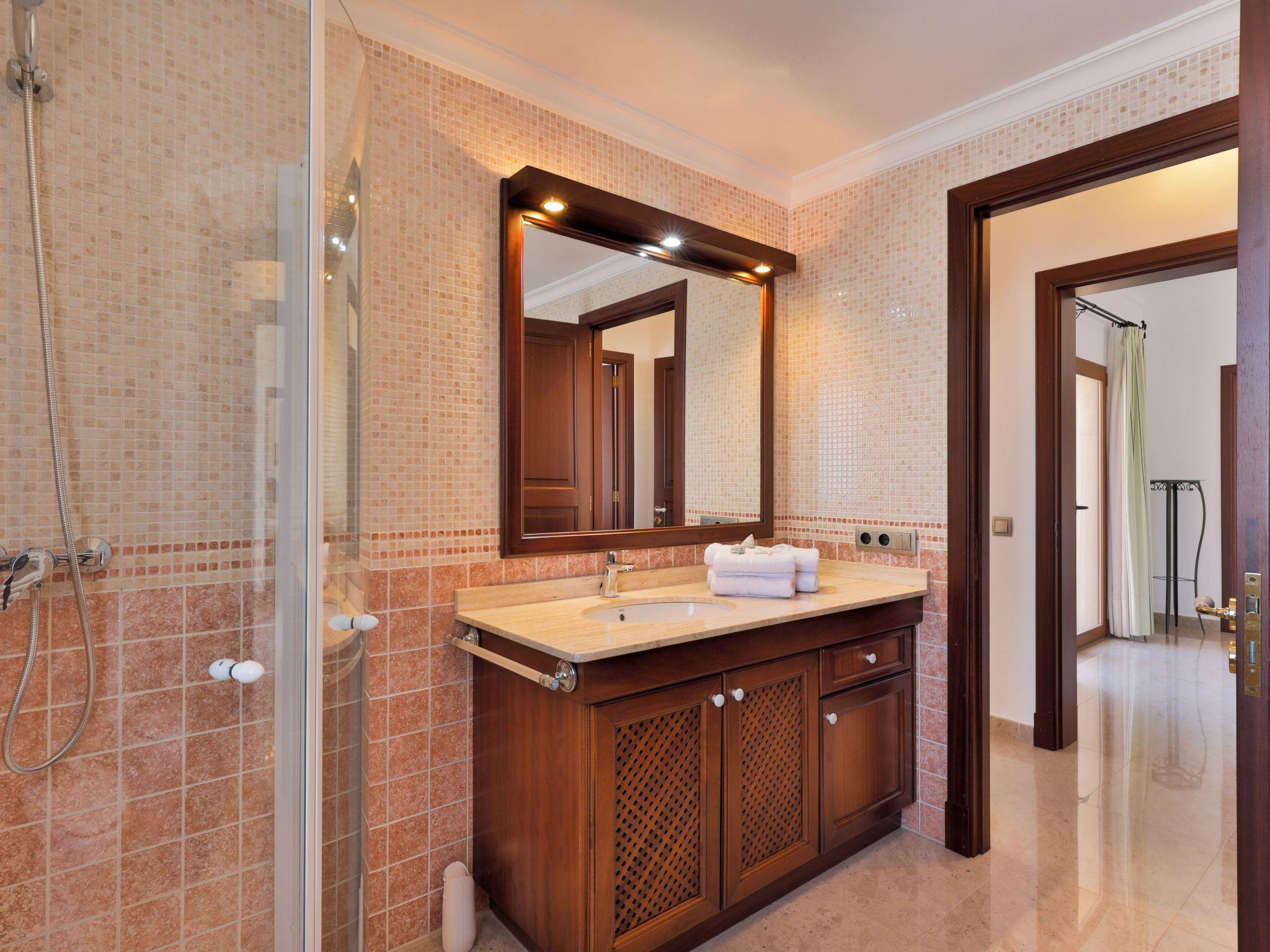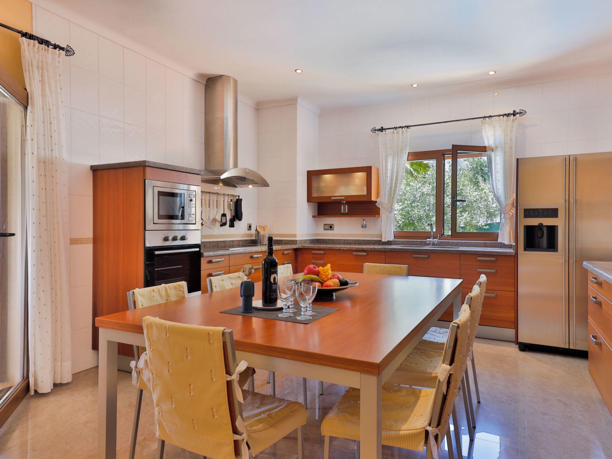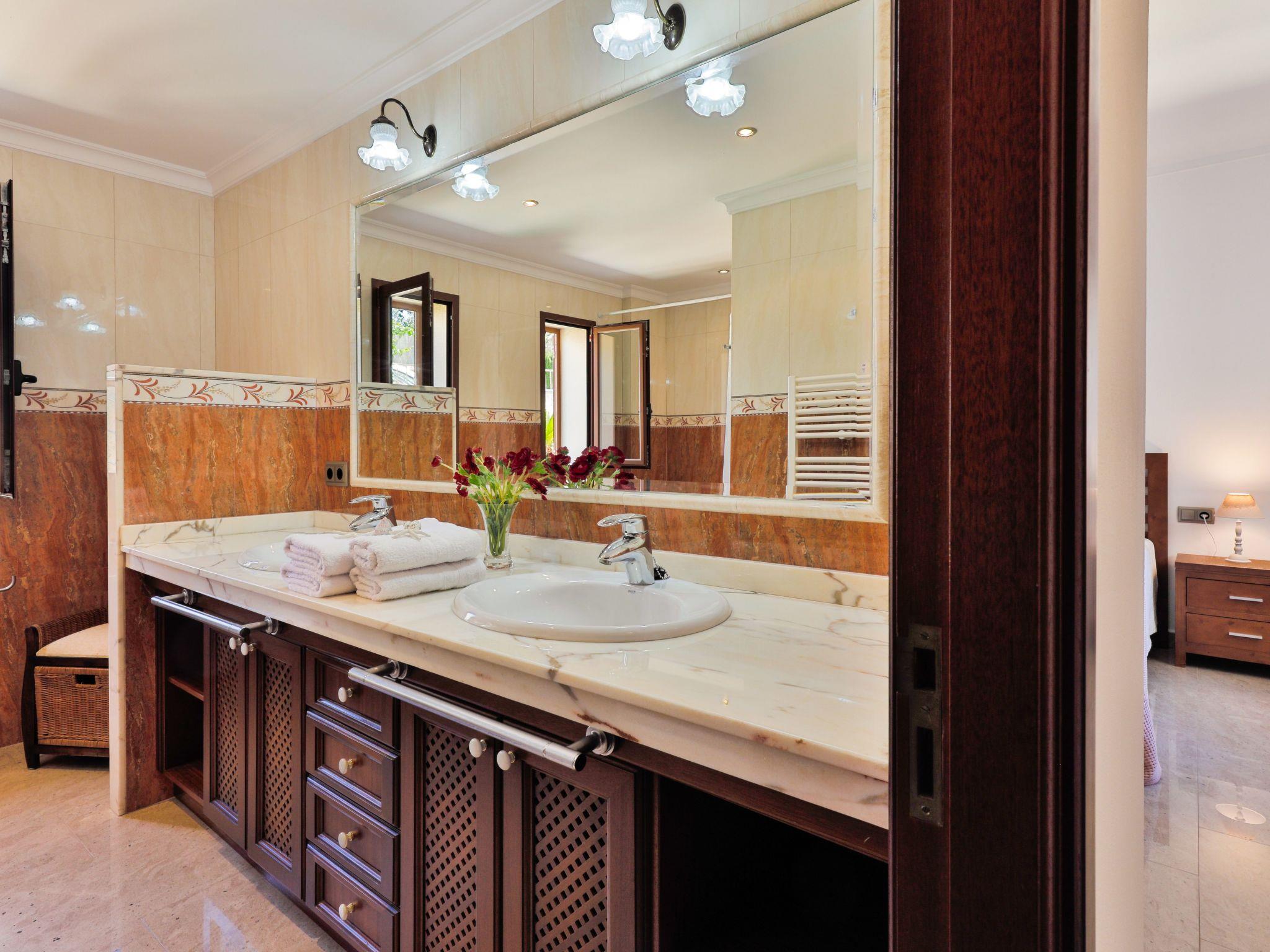 House on two levels. On the ground floor is the living room with access to the veranda and the pool. The large kitchen is also a dining room with a large table and has access to the pool area. A pantry is located next to the kitchen and the laundry room. There is also a bedroom with double bed and en suite bathroom with bathtub on the ground floor. Guest toilet. There are two further bedrooms on the first floor. The master bedroom with double bed, dressing room and bathroom en suite with corner bath - jacuzzi not available. A second bedroom with double bed. This bedroom has its own small terrace and a separate bathroom with shower.