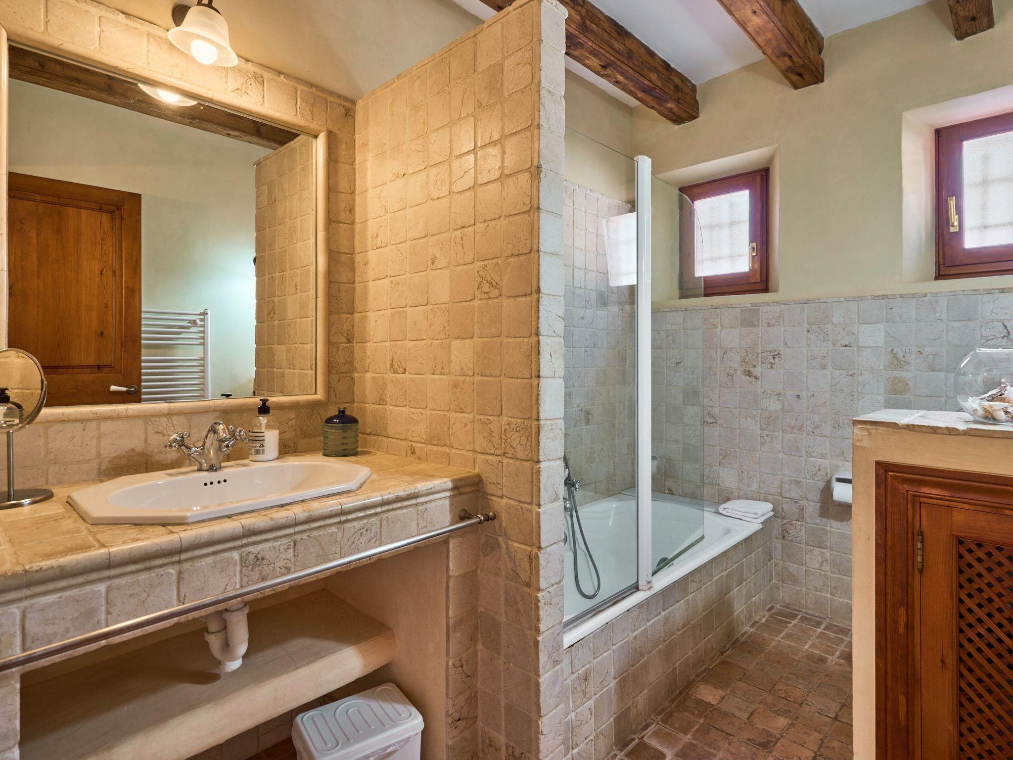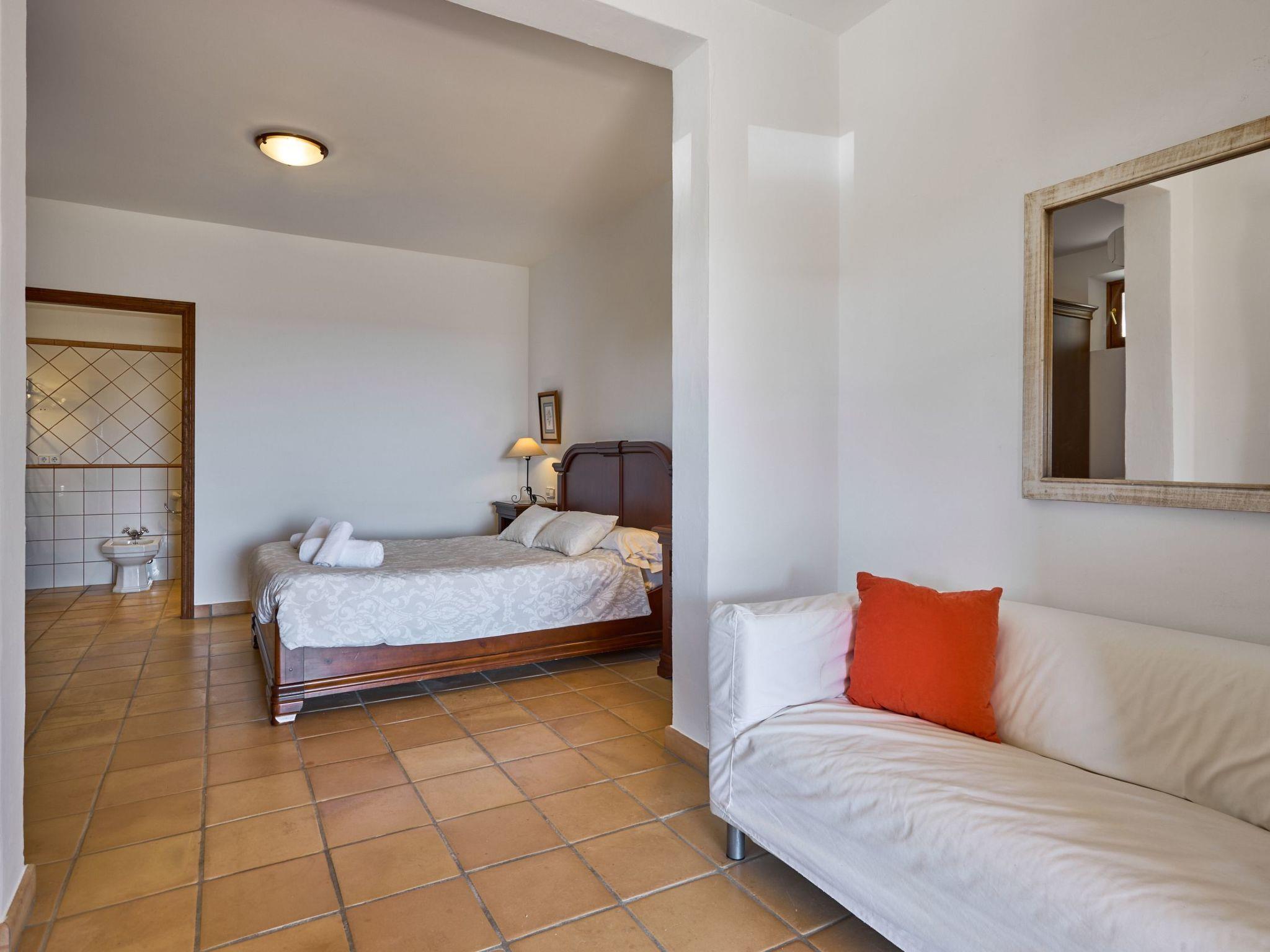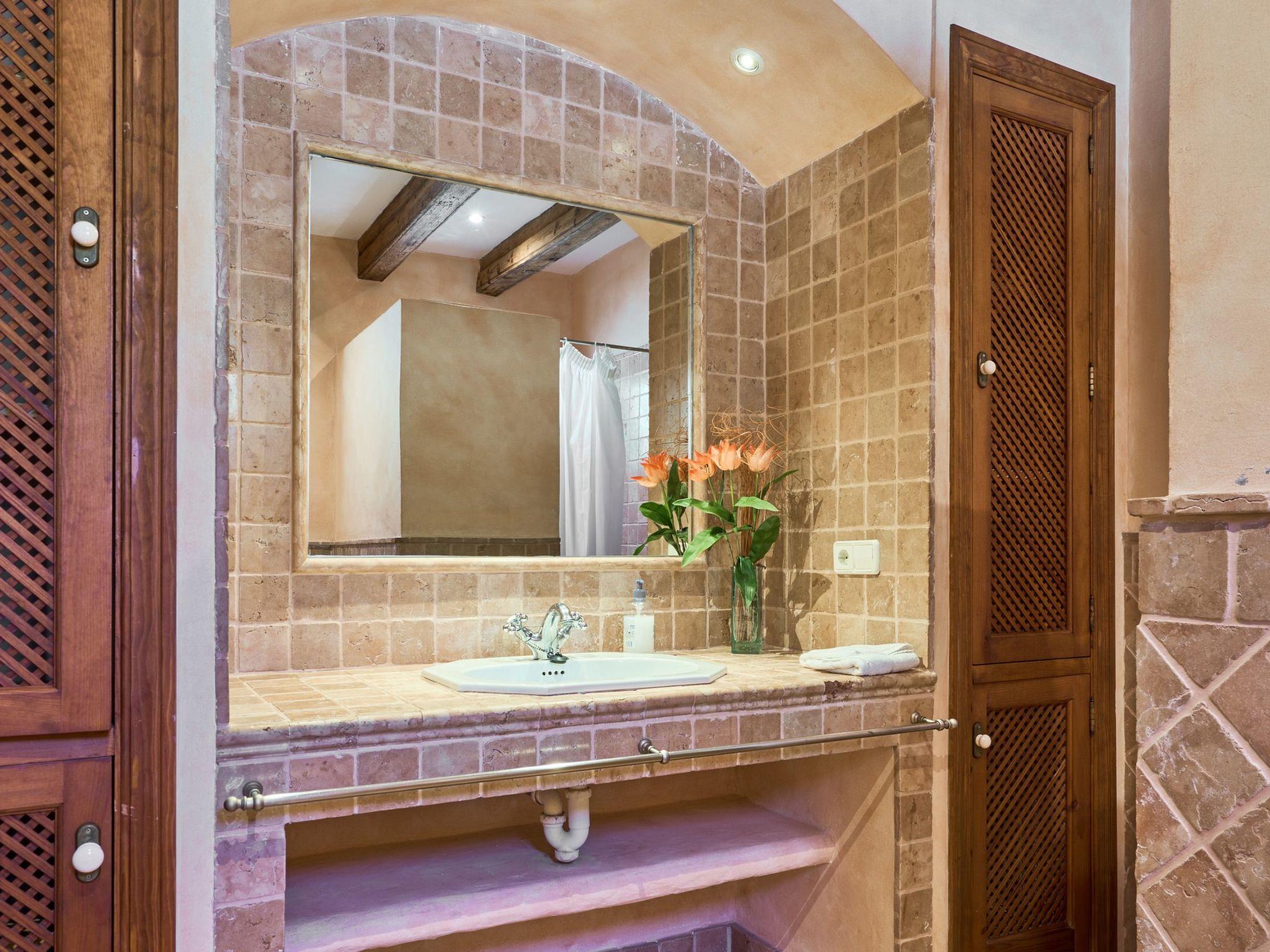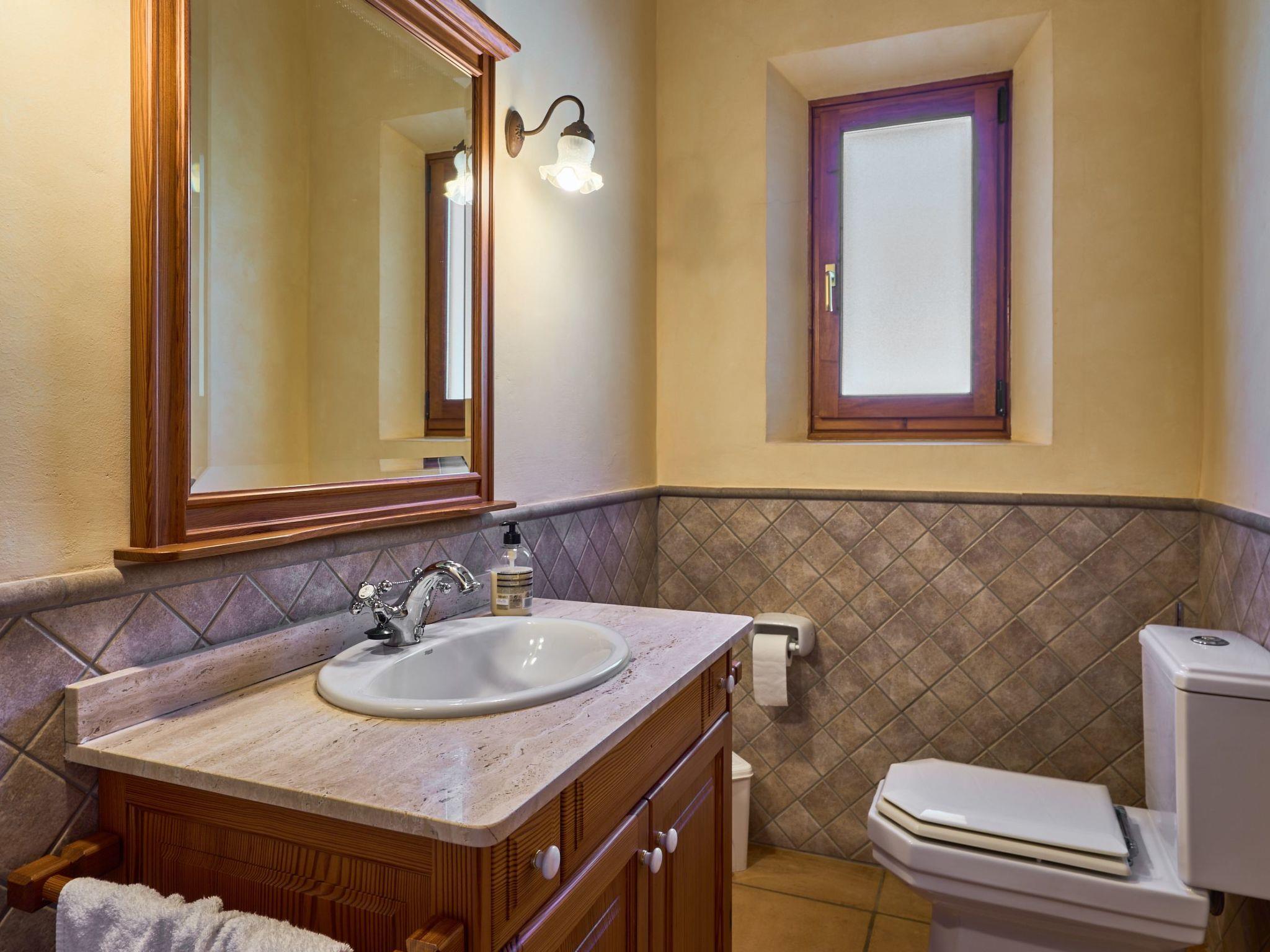 Sa Penya Rodona is a luxurious accommodation. The main entrance is at the rear of the house and leads through to the spacious, perfectly equipped kitchen. Adjacent is the beautiful dining room, with patio doors leading to the front upper terrace. The large living room is tastefully decorated with elegant furniture, Smart TV and Playstation Type 2. Large patio doors also lead out onto the beautiful upper outdoor terrace with fantastic views and the partial canopy provides both sun and shade. A few steps lead down half a level to the master bedroom, equipped with a double bed, dressing room, full en suite bathroom and access to the upper sun terrace. From here there are further impressive views over the property and the beautiful lower pool area. Also on this level are two further bedrooms, each with two single beds, which share a fully equipped bathroom. On the ground floor, from the covered terrace at the front of the house, there is access to a separate double bedroom. This beautiful, spacious room has a double bed, dressing room and en suite bathroom with walk-in shower (wheelchair accessible).