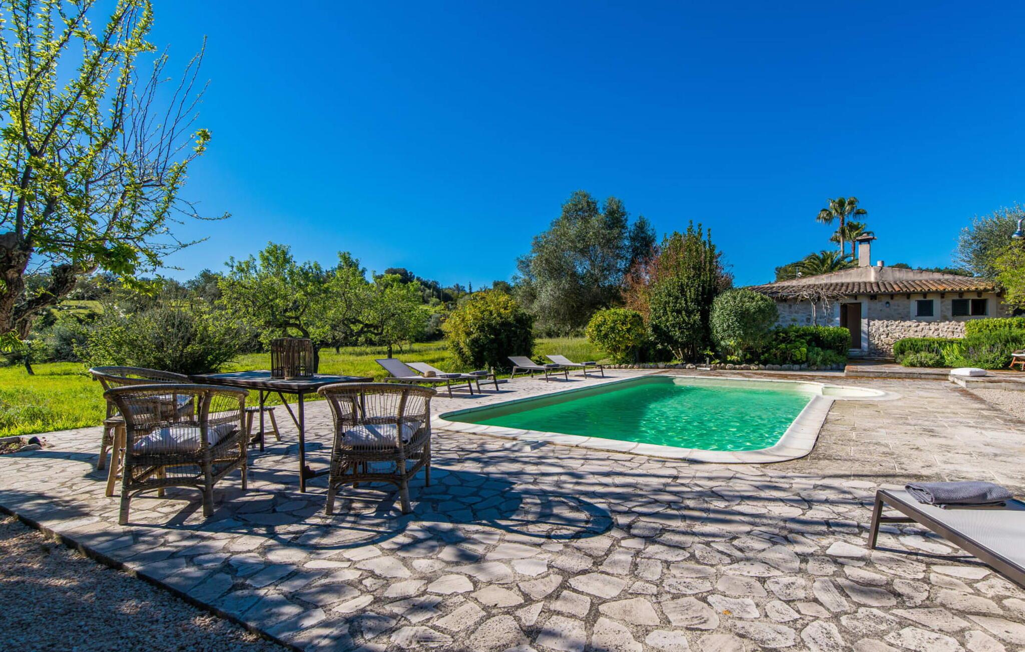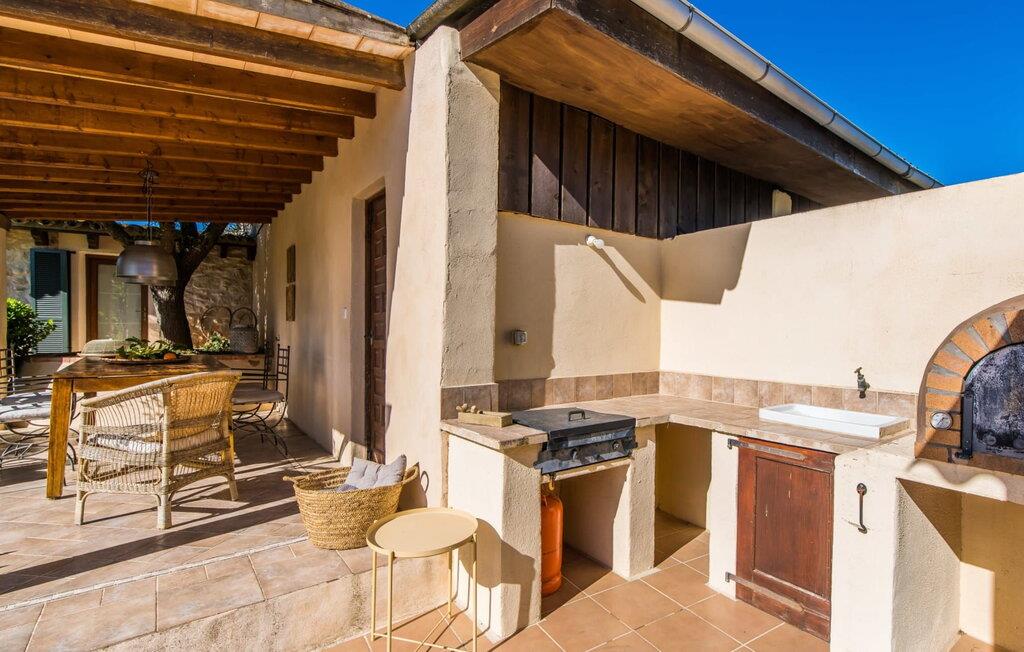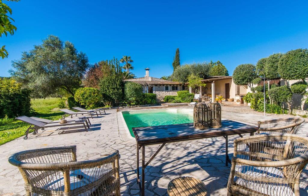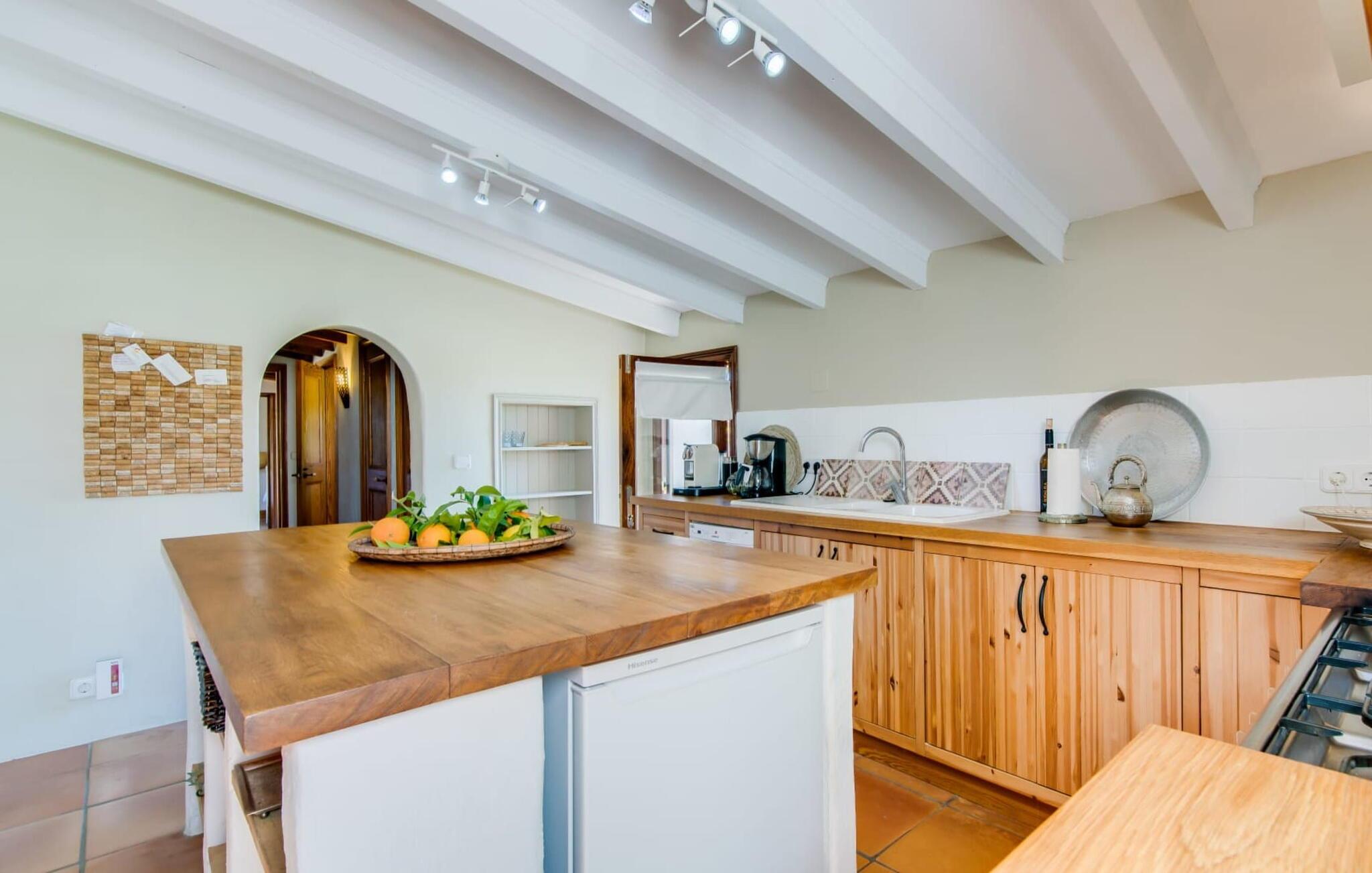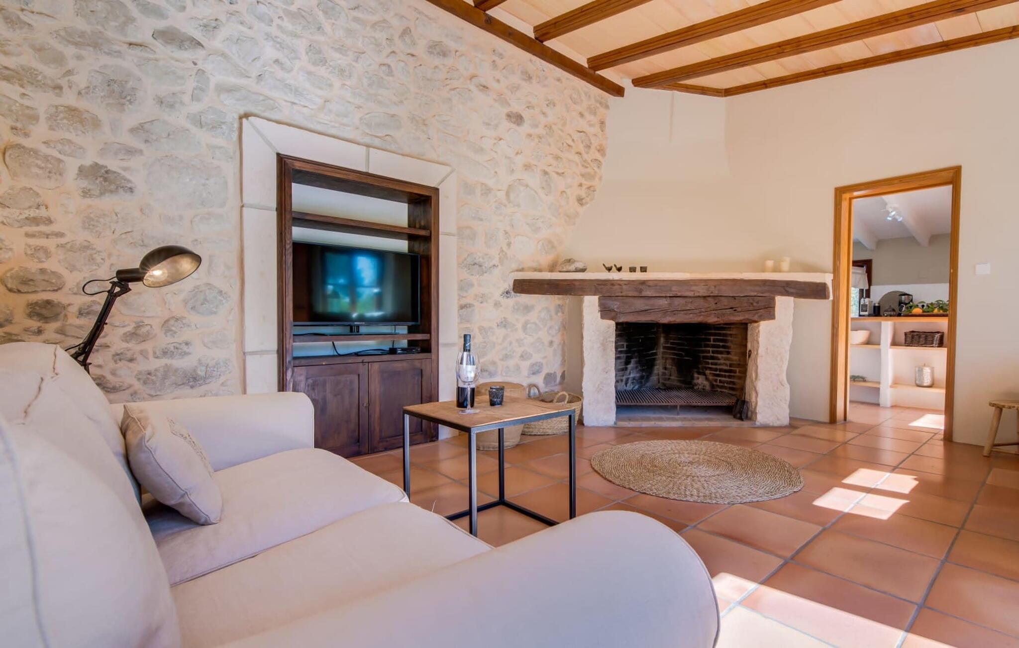 en rolig, ugeneret beliggenhed og midt i frodige grønne områder og uberørt natur finder I jeres skønne sommerhus, der straks vil forelske jer i. Leder I efter en autentisk mallorcansk atmosfære, er I kommet til det rette sted, da ejendommen er en bygning fra 1850, der er blevet nænsomt renoveret. Dette moderne feriehus blev oprindeligt brugt til landbrug og har en charmerende og rummelig have. Kun én ting venter jer her: ren afslapning. Gå en tur gennem haven og nyd duften af citroner i luften, prøv en af de saftige oliven eller figner, der hænger fra træerne, og tag en dyb indånding: det er feriesæson! Når middagsvarmen kommer, kan I tage en dukkert i den private pool, som lover at køle jer ned. Så skal I bare slappe af med en god læsning på en af de komfortable liggestole under parasollen. Om aftenen inviterer grillen til at tilbringe dagen helt udendørs. Når I kommer ind i huset fra en af terrasserne, vil I straks føle jer hjemme takket være den charme og autenticitet, der gennemsyrer alle rum. Varme terracottagulve, gyldenbrunt iroko-træ, synligt murværk lavet af stenbrud: dette hus har stil. Under renoveringen blev der sørget for kun at bruge udsøgte møbler og inventar i huset. Den har et minimalistisk design, som passer perfekt til kombinationen af hvide og cremefarvede toner og det honningfarvede træ, der er at finde i hele huset. I vil med det samme stryge bordpladen på det store spisebord af smukt træ for at mærke det. I den hyggelige opholdsstue er der en kæmpe åben pejs til hyggelige aftener i køligere temperaturer. Der er også et tv med tysk satellitmodtagelse. Køkkenet er meget hyggeligt takket være det let skrå loft. Den har en opvaskemaskine, en elkedel og forskellige kaffemaskiner og alt hvad et selvforplejningshjerte begærer. Soveværelserne er også indrettet i bløde pastelfarver og har hver deres badeværelse. Fincaen ligger i centrum af øen, kun 30 km fra hovedstaden Palma. Så centralt og alligevel med en fantastisk ugenert beliggenhed byder det på en lang række muligheder for fritidsaktiviteter uden for den smukke ejendom. Især vandrefans kan glæde sig, for det lille ferieparadis ligger under det markante Puig de Randa-bjerg, der rejser sig over det mallorcanske lavland og minder en del om Sydafrikas Taffelbjerg. Under stigningen har I mulighed for at besøge tre klostre, der ligger i forskellig højde. Når I når toppen, vil I blive belønnet med en spektakulær udsigt over Tramuntana-bjergene. Strande som Caló de Sant Antoni eller Es Trenc kan nemt nås med lejebil, mindre end 30 km væk. Den paradisiske villa "Calmita" ligger midt i et spektakulært landskab nær det markante Puig de Randa-bjerg. Den lille by Montuiri, cirka 4 miles væk, har alt hvad I behøver med bagerier, supermarkeder og et vidunderligt marked, der tilbyder en bred vifte af friske, lokale råvarer. De populære strande Platja de Palma og Platja de Sa Rapita ligger omkring 19 km væk, men flere andre smukke bugter som Es Trenc kan også nemt nås med lejebil.