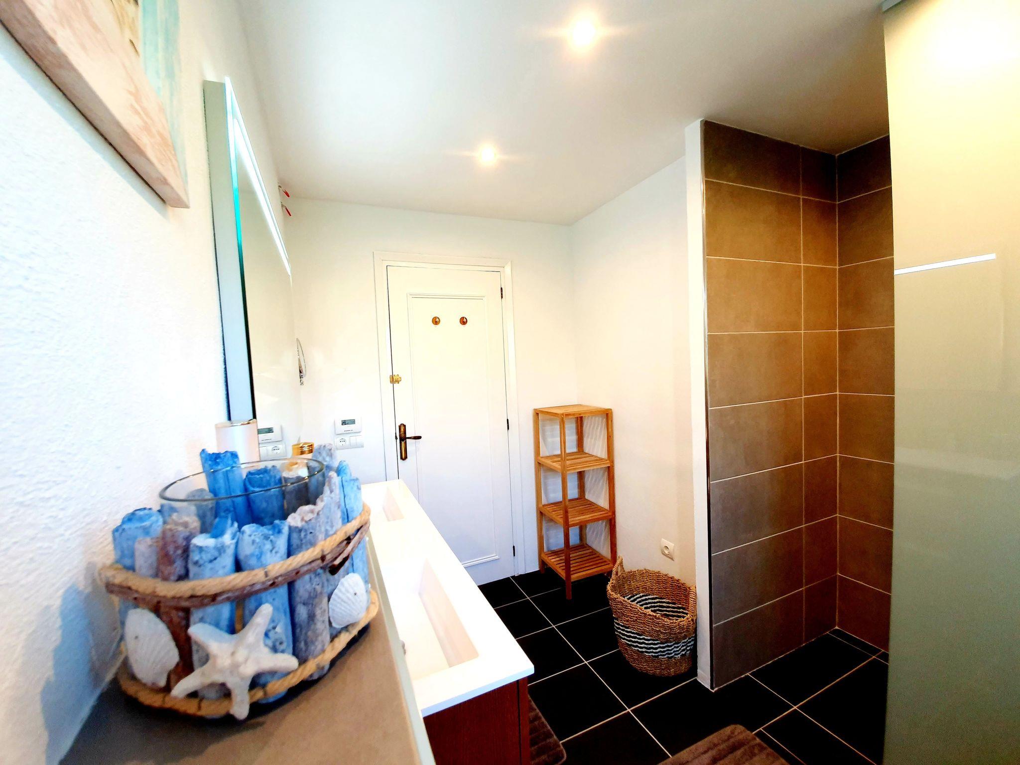 The house was completely modernised at the beginning of 2020 and newly furnished with great attention to detail. The holiday home has 3 bedrooms, 2 bathrooms with shower (with underfloor heating), 1 large living room with fireplace and 1 large eat-in kitchen, spread over one floor. All bedrooms and the living room are equipped with state-of-the-art air conditioning units, which ensure pleasant temperatures and a good night's sleep even when the outside temperature is high in summer. At the centre of the house is the spacious, light-flooded living area with an open fireplace and access to the covered outdoor terrace. The new kitchen and the modern dining area are also located on this level. The new kitchen has the highest level of comfort, a comprehensive range of electrical appliances and practical kitchen utensils.