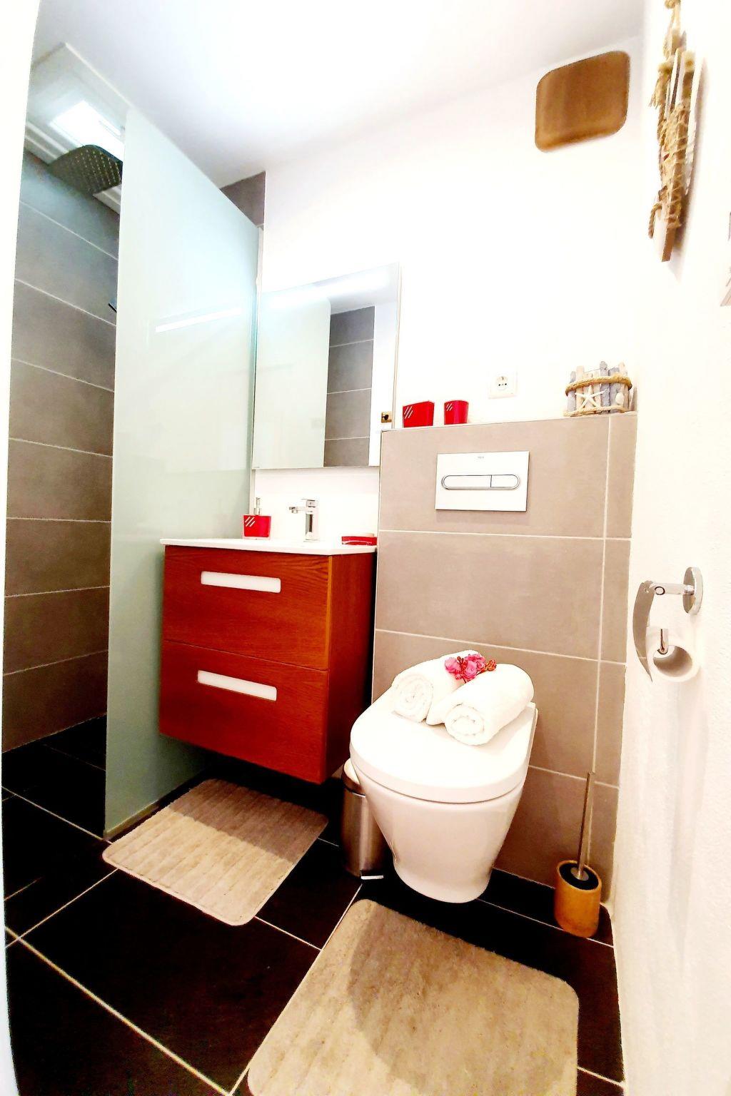 Living room - Living room with air conditioning and satellite TV - Open fireplace in the living room (wood available) - Exit to the large balcony - Dining area with 6 chairs Bedrooms - 1 bedroom with king-size double bed, air conditioning - 1 bedroom with 2 single beds, air conditioning, TV - 1 bedroom with 2 single beds, air conditioning - Generous built-in wardrobes in all bedrooms Bathrooms - 2 completely modernised new modern bathrooms with underfloor heating - 1 bathroom with 2 single washbasins, shower, toilet, hairdryer - 1 bathroom with single washbasin, shower, toilet, hairdryer Kitchen - modern and new kitchen with induction hob and oven - dining area with 6 chairs and exit to the terrace - microwave - fridge-freezer - coffee machine, kettle and toaster, espresso machine - dishwasher - spices / olive oil - sufficient crockery, glasses and cutlery available - smoothie blender General - ultra-modern and quiet air conditioning in all bedrooms and living room available. The control can be operated individually by the guest via remote control. Iron and ironing board - Washing station with washing machine and drying room in the basement - Storage room with hoover - Internet with WLAN - House management with 24-hour emergency call service Entertainment - Satellite TV - Compact hi-fi system (radio with CD player) - Flat screen TV in the living room and in one bedroom - Board game collection and various card games for children and adults