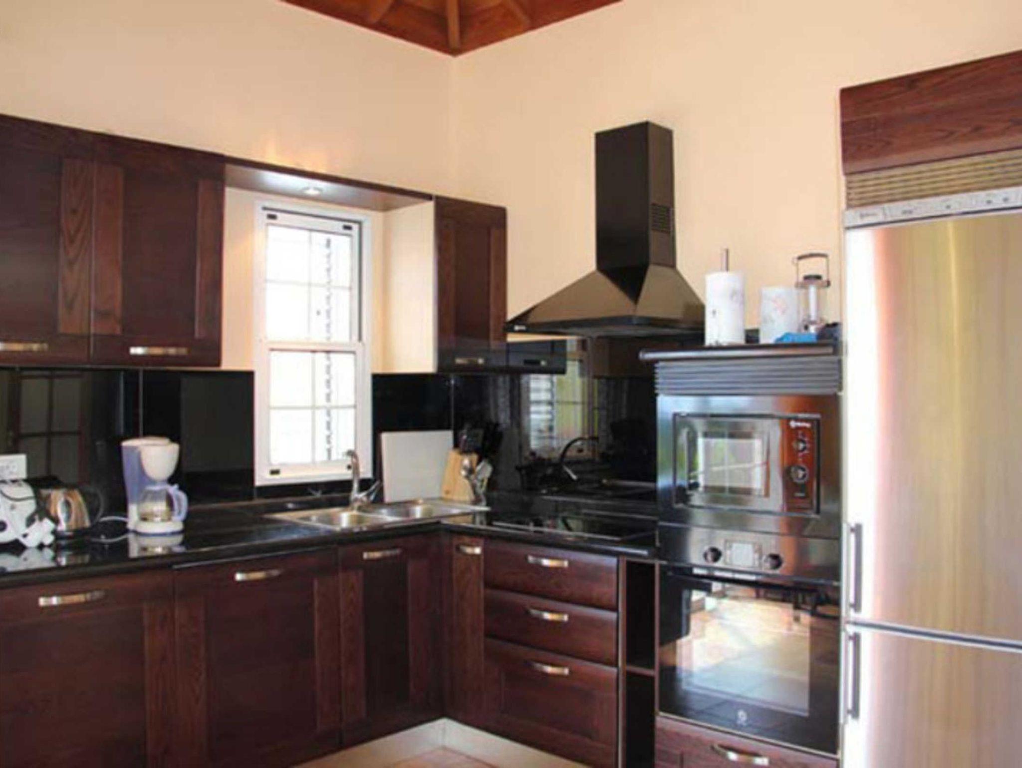 Betritt man die Villa durch den Haupteingang, gelangt man in die separate, moderne Küche mit Essbereich für 6 Personen. Die Fronten der Küche sind in einem dunklen, edlen Nussbaumton gehalten, die Arbeitsflächen sind aus schwarzen Marmor.