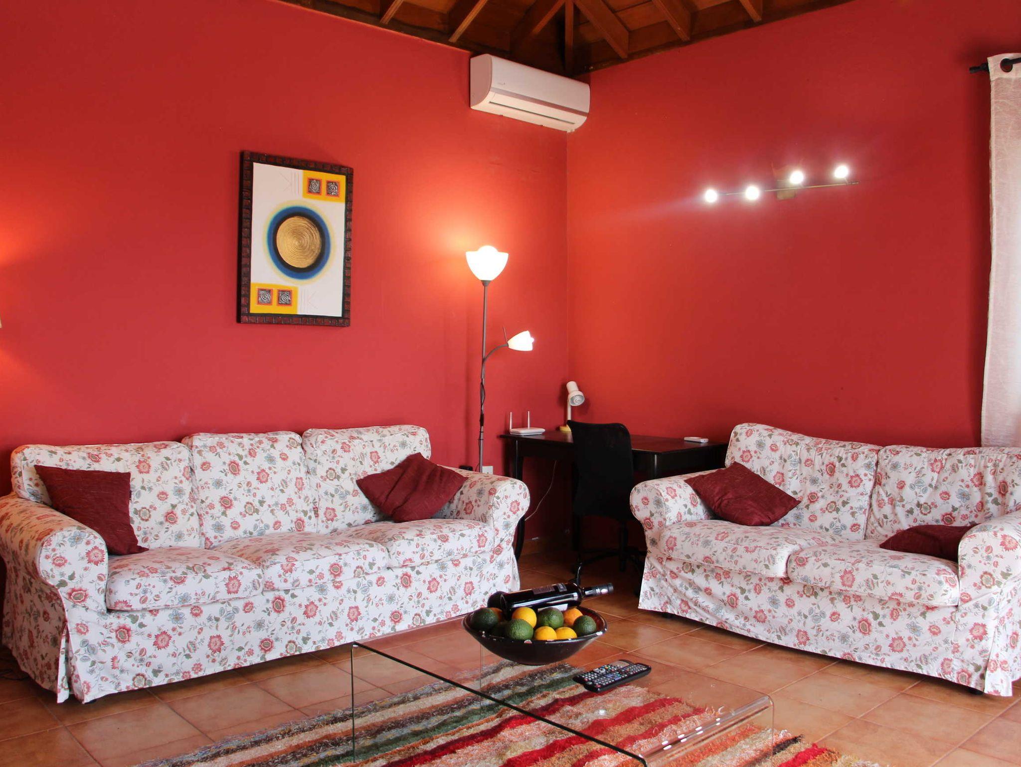 Das Wohnzimmer ist in einem warmen Rot-Ton gehalten und hat ebenfalls ein palmerisches, von innen sichtbares Holzgiebeldach. Eine Sitzecke mit bequemen Sofas lädt zu gemütlichen Lese- oder TV-Abenden ein oder Sie schauen einfach den Flammen im offenen Kamin zu, der an kühlen Abenden wohlige Wärme spendet.