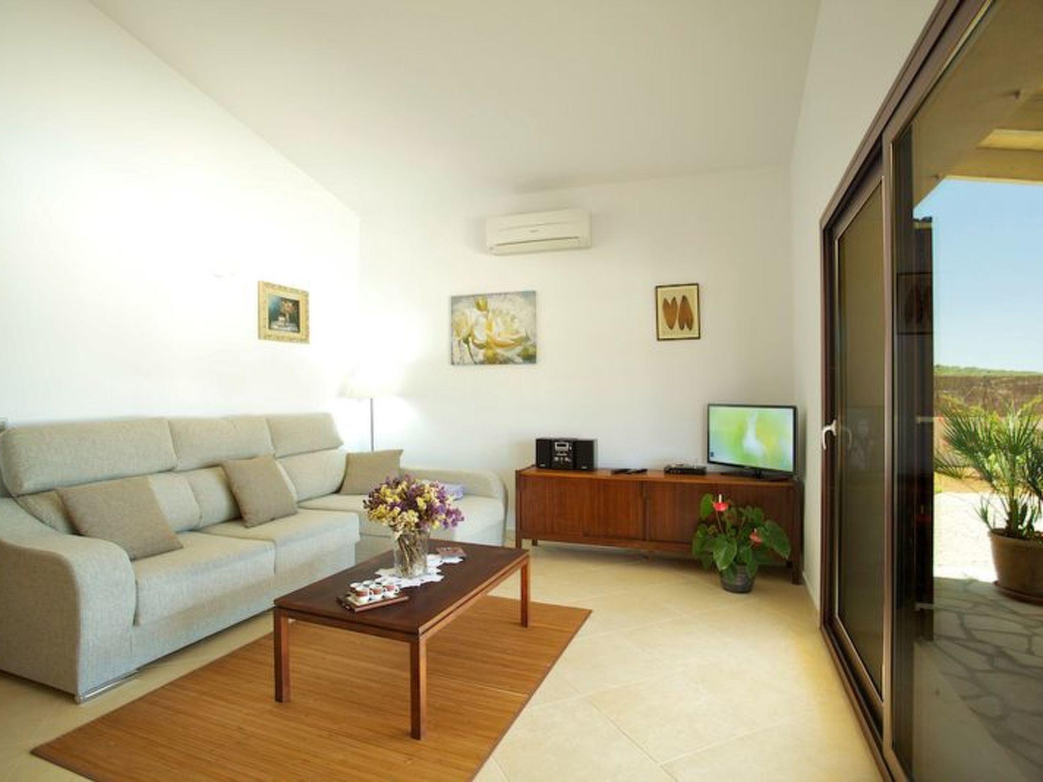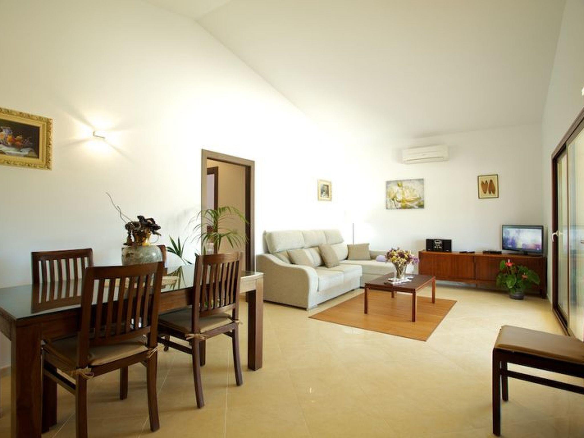The bright living/dining room is equipped with a dining table, a sofa and a television with satellite TV. A washing machine, two children's beds and two high chairs are also available free of charge. The bedrooms and the living/dining room have their own air conditioning.
