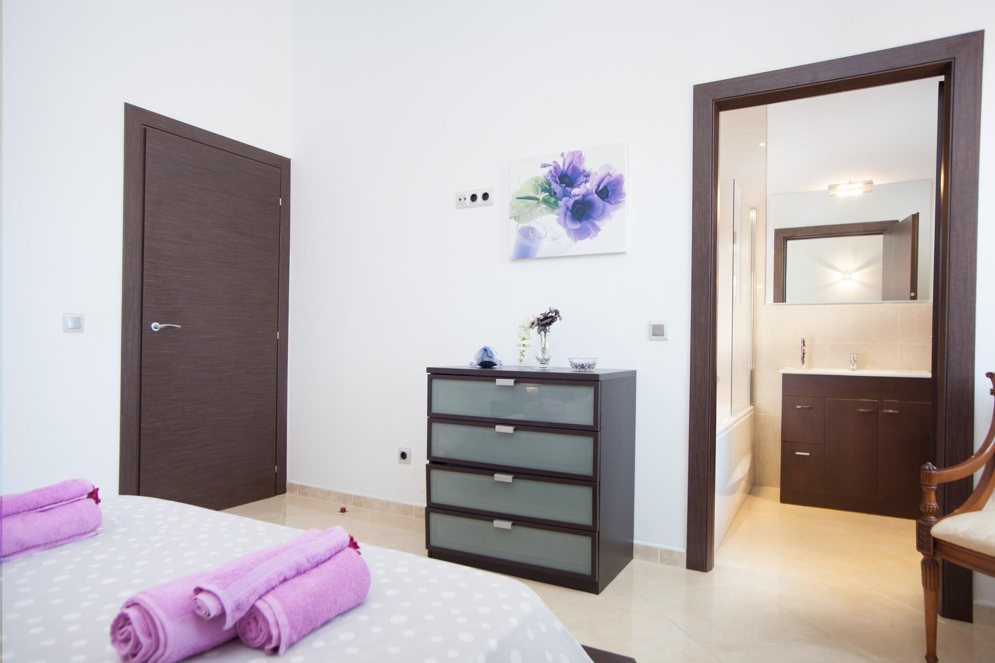 Forfriskende udendørs flugt Træd ind i det indbydende ydre af denne moderne villa, hvor en privat klorpool venter for at forfriske dig under den mallorcanske sol. Seks liggestole er det perfekte sted at slappe af, mens den rummelige veranda og grillområdet sørger for afslappet morgenmad eller aftensmad. Den omkringliggende grushave og forskellige beplantninger tilføjer et moderne touch, og den fuldt indhegnede grund sikrer privatlivets fred uden direkte naboer i nærheden. Komfortabelt indendørs ophold Indvendigt er villaen elegant designet til afslapning og bekvemmelighed. Stuen, der er udstyret med en sofa, satellit-tv og direkte adgang til verandaen, flyder problemfrit ind i spisekøkkenet med en vitro-komfur, elektrisk ovn og opvaskemaskine. Et vaskerum omfatter vaskemaskine, strygejern og strygebræt. De tre soveværelser - et dobbeltværelse og to med hver to enkeltsenge - suppleres af aircondition overalt. Badeværelserne har et hydromassagebadekar og en bruser. Praktisk beliggenhed og spisning Den charmerende landsby Sa Pobla ligger kun 2,5 km væk, og den byder på supermarkeder, butikker og restauranter. Søndag er der et travlt marked med frisk frugt og grøntsager. Villaen ligger en kort køretur til Alcúdia-bugten, hvor fine sandstrande som Playa de Muro og Port d’Alcúdia venter. Friluftsentusiaster kan nyde vandre- eller cykelture i Campanet, Pollença og den nærliggende Sanctuari of Lluc. Lokale spisemuligheder, herunder Celler Can Cotà, fremviser traditionelle mallorcanske retter, hvilket sikrer en komplet ø-oplevelse.