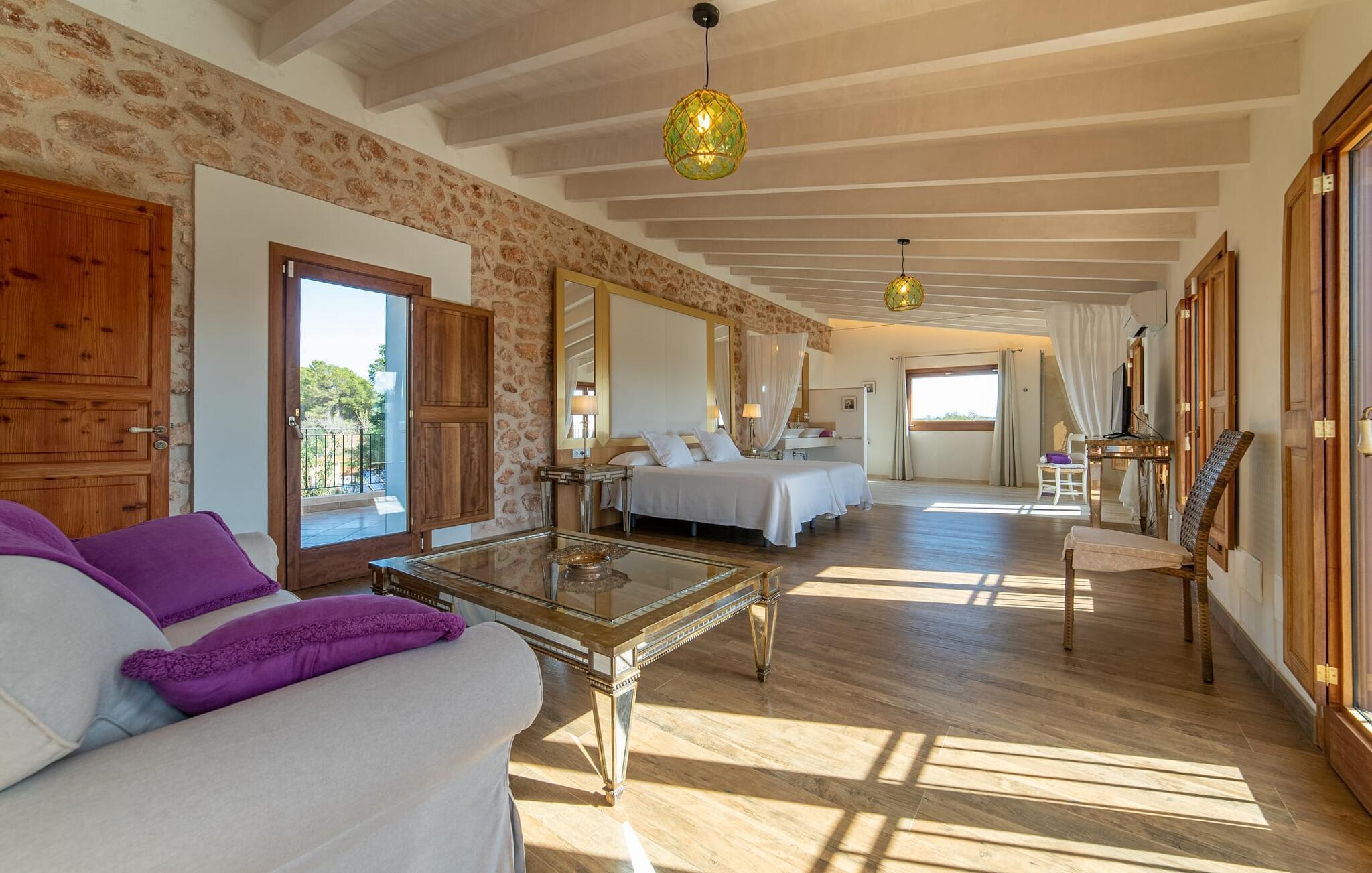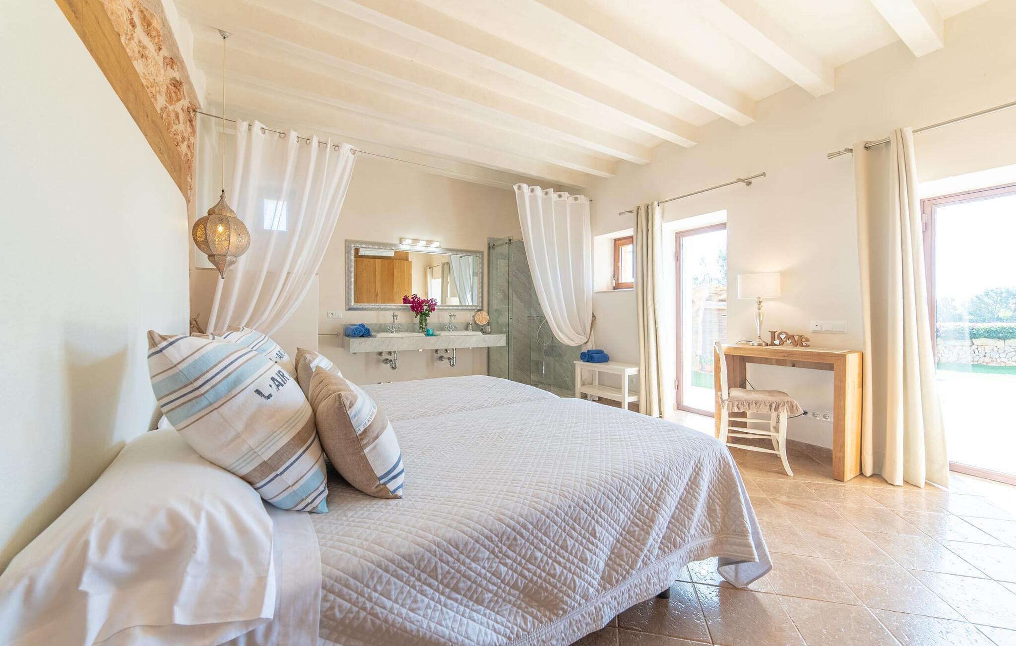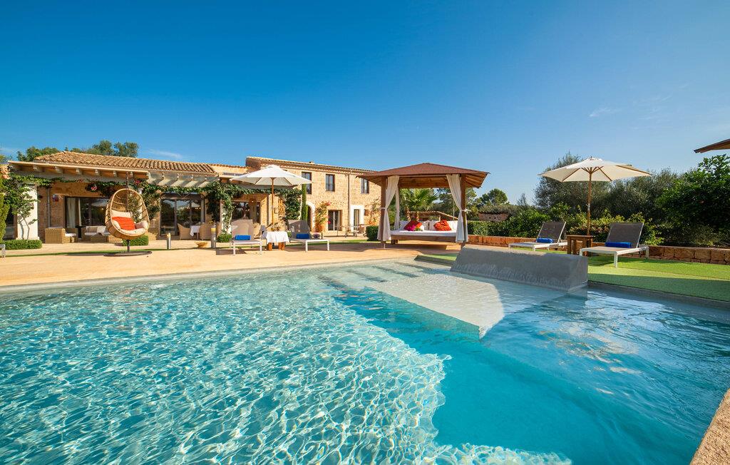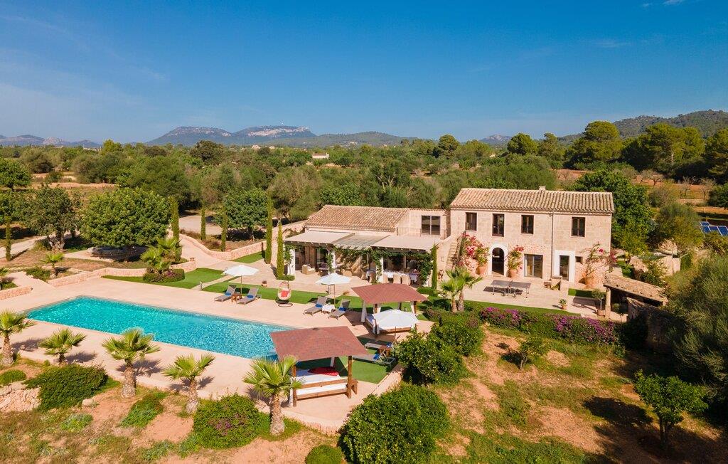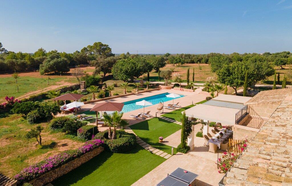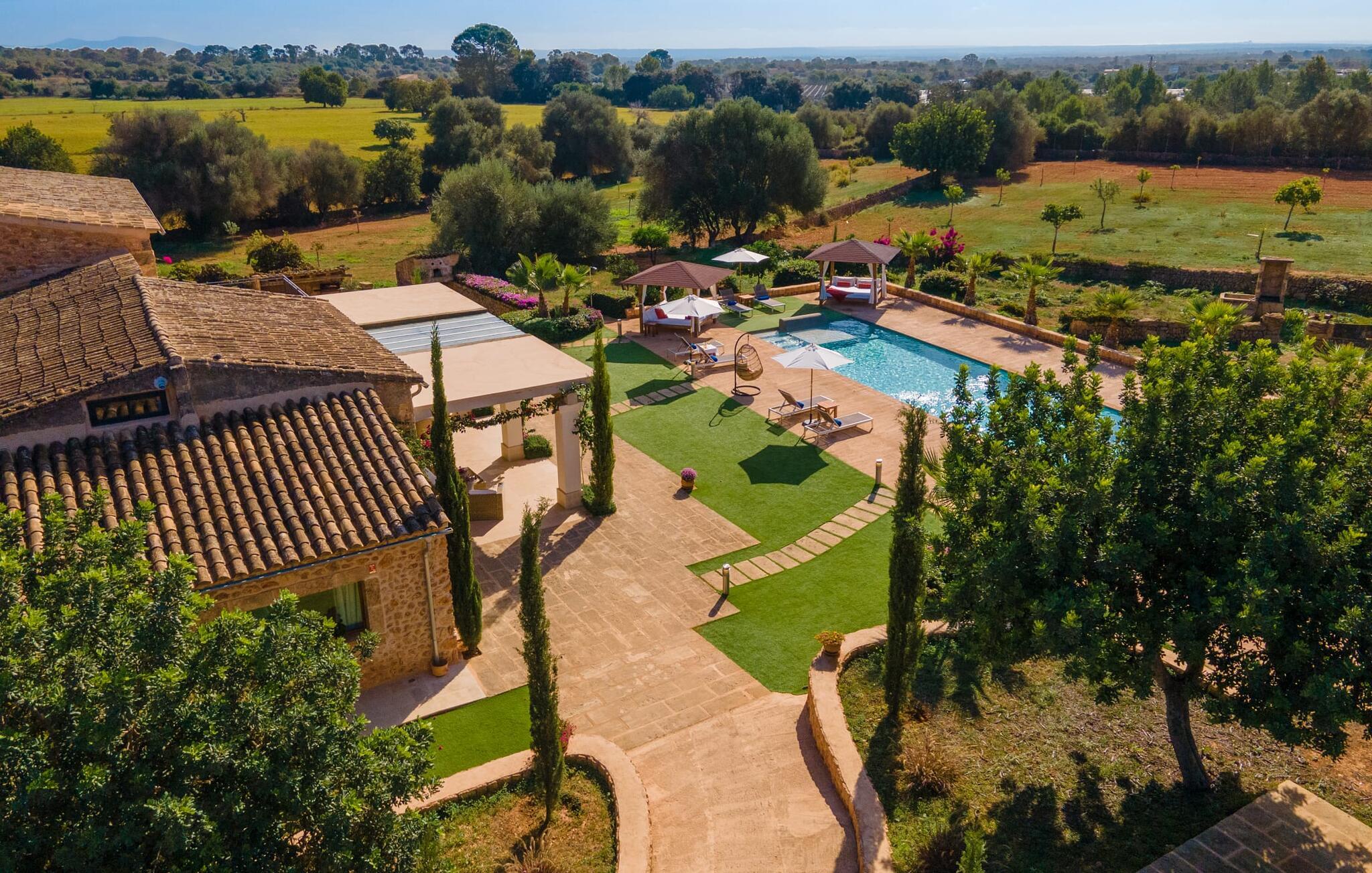 Den smukke bondegård "Can Boleno" ligger i det sydlige Mallorca. Det er omgivet af en 35.000 m² stor grund. Fra den rummelige, overdækkede terrasse på huset har I en god udsigt til det kærligt designede poolområde. Ud over det sensationelle hovedbassin på 20 x 5 m er der en anden, mindre pool. Omkring hovedpoolen er der adskillige komfortable sidde- og liggemuligheder som dagsenge, komfortable hængende stole og stilfulde loungemøbler til at slappe af i solen eller i skyggen. Der er også en mobil grill, en udendørs bruser og et bordtennisbord. Den lejlighedsvis hørbare vej mellem Llucmajor og Campos er cirka 400 m væk og tilbyder en bekvem måde at nå de smukke sandstrande Es Trenc og Sa Rápita på kort tid. Interiøret i dette skønne feriehus i to etager er smagfuldt og kvalitativt indrettet. Store glasskydedøre giver nem udgang fra stue og køkken til den overdækkede terrasse. I er velkommen til at nyde jeres måltider i den hyggelige, åbne spisestue eller i det rummelige køkken i landlig stil. Der er også fire soveværelser med dobbeltsenge i stueetagen. De har hver deres badeværelse og deres egen adgang til det fri. Et af soveværelserne har direkte adgang til den mindre pool. Den øverste etage er helt dedikeret til et stort soveværelse med en-suite badeværelse og udgang til en smuk morgenmadsterrasse med udsigt over det idylliske landskab. Hele landstedet er udstyret med aircondition og varme og byder på ideelle forhold for komfortabelt arbejde hjemmefra. Feriehuset har en afsondret landlig beliggenhed, cirka 10 minutters kørsel fra Llucmajor og Campos. Begge steder byder på gode indkøbsmuligheder og restauranter. De smukke sandstrande Es Trenc og Sa Rápita ligger knap 20 minutter væk i bil. Son Antem Golfbane ligger 13 km derfra.