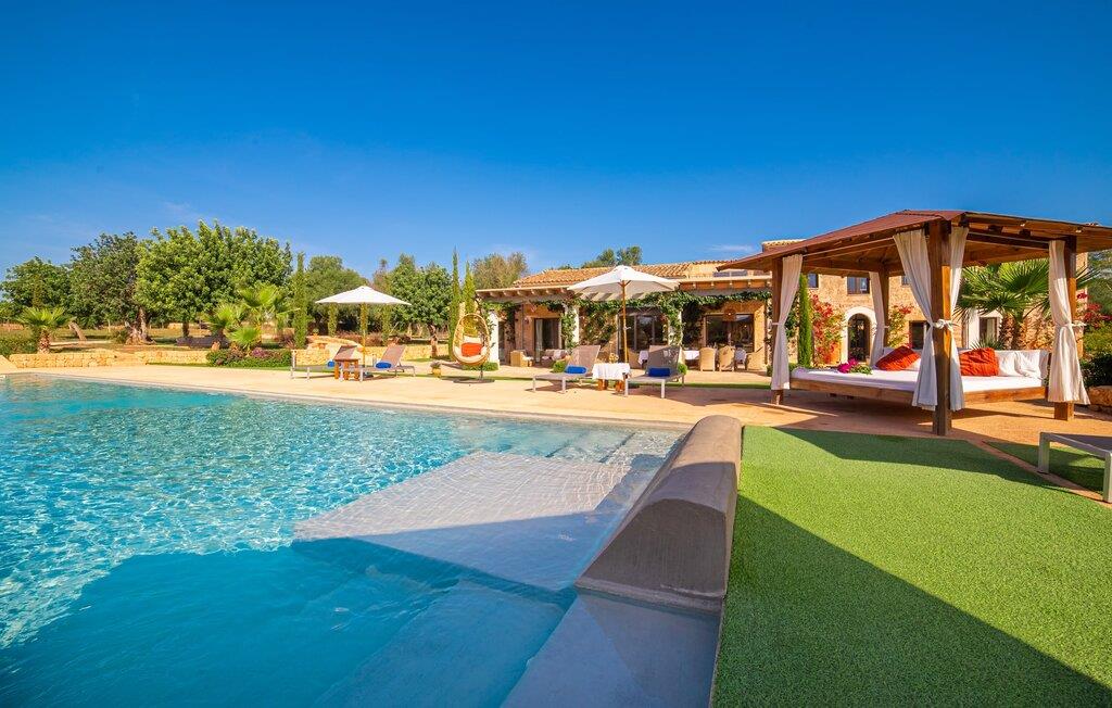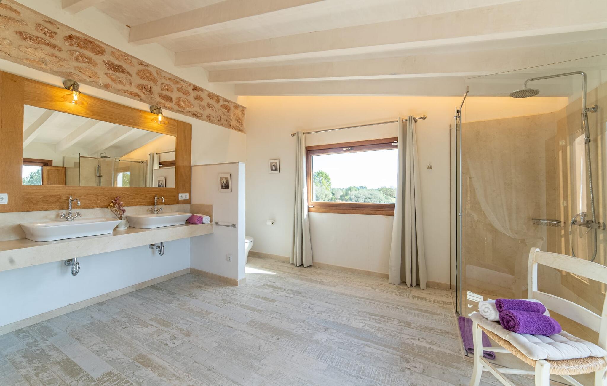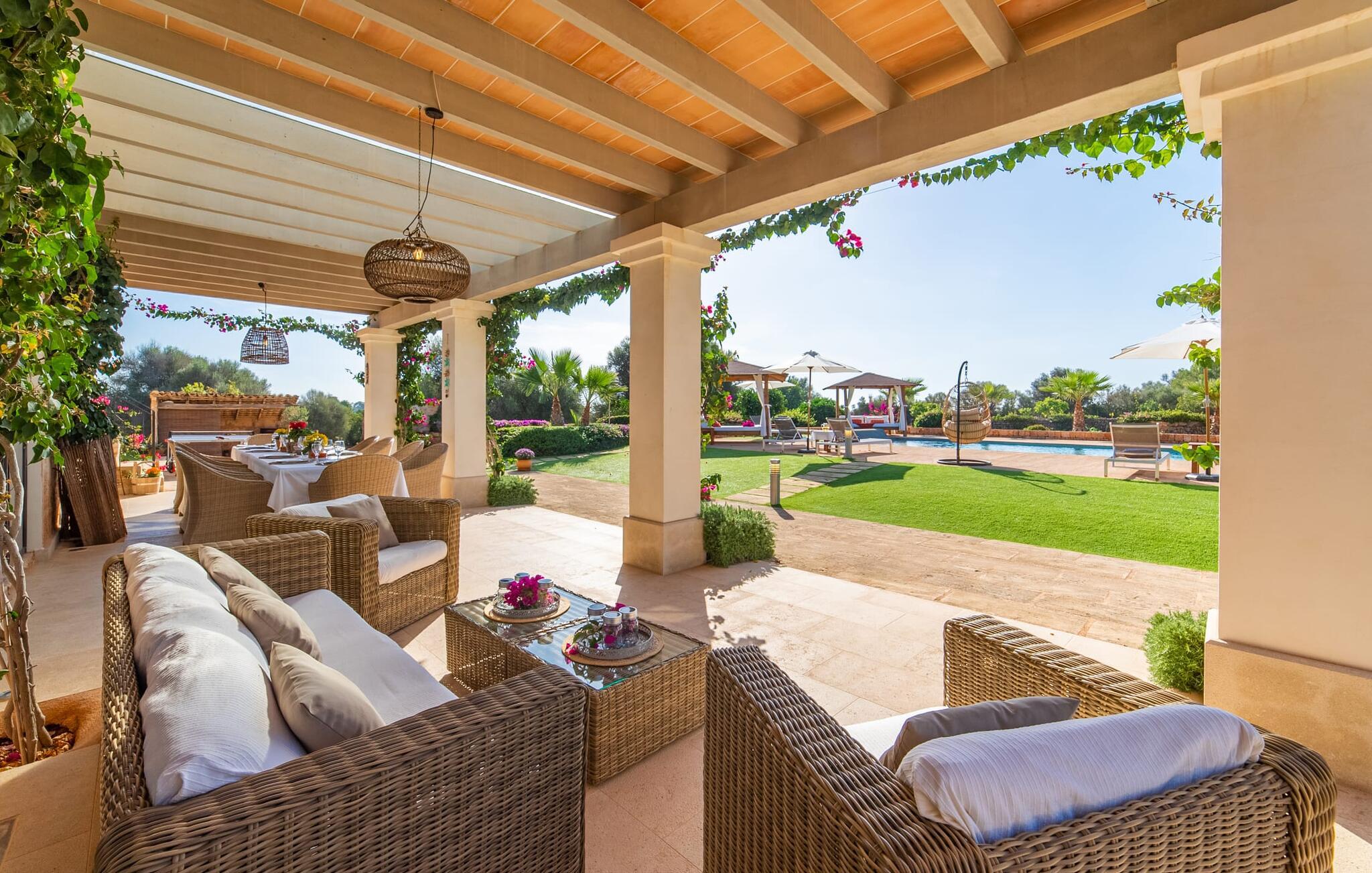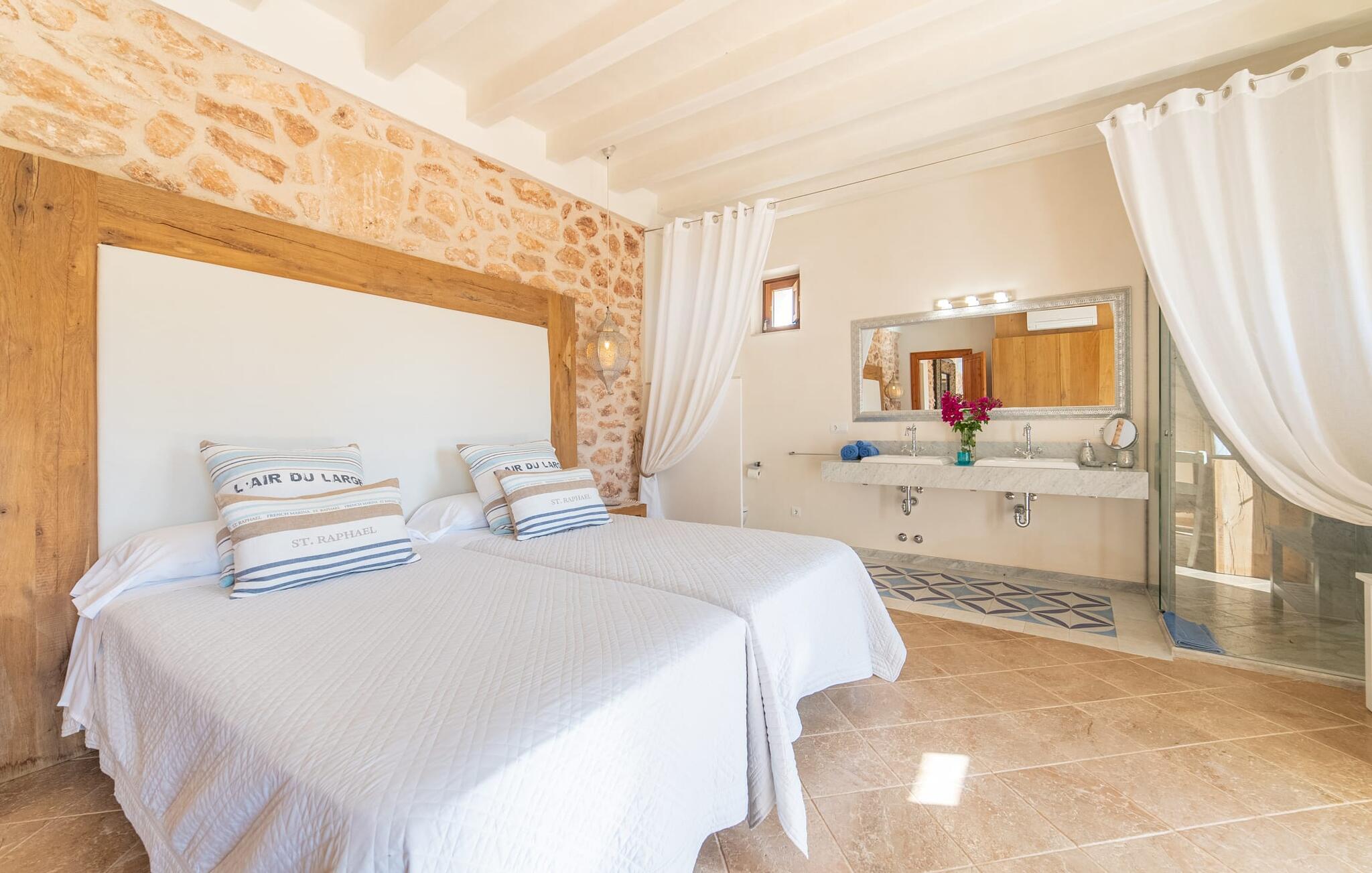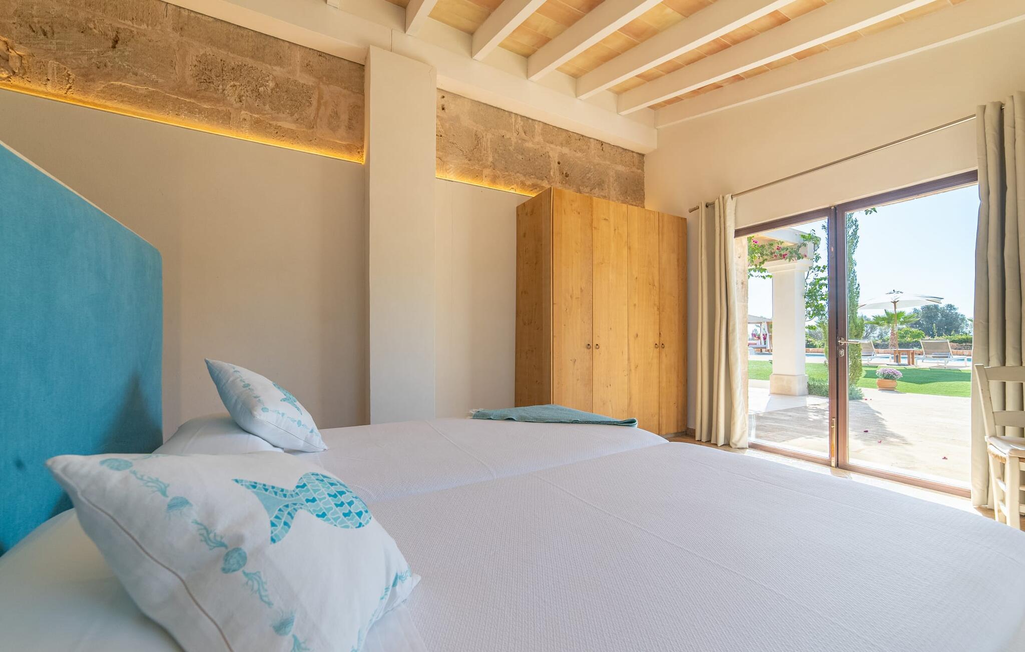Den smukke bondegård "Can Boleno" ligger i det sydlige Mallorca. Det er omgivet af en 35.000 m² stor grund. Fra den rummelige, overdækkede terrasse på huset har I en god udsigt til det kærligt designede poolområde. Ud over det sensationelle hovedbassin på 20 x 5 m er der en anden, mindre pool. Omkring hovedpoolen er der adskillige komfortable sidde- og liggemuligheder som dagsenge, komfortable hængende stole og stilfulde loungemøbler til at slappe af i solen eller i skyggen. Der er også en mobil grill, en udendørs bruser og et bordtennisbord. Den lejlighedsvis hørbare vej mellem Llucmajor og Campos er cirka 400 m væk og tilbyder en bekvem måde at nå de smukke sandstrande Es Trenc og Sa Rápita på kort tid. Interiøret i dette skønne feriehus i to etager er smagfuldt og kvalitativt indrettet. Store glasskydedøre giver nem udgang fra stue og køkken til den overdækkede terrasse. I er velkommen til at nyde jeres måltider i den hyggelige, åbne spisestue eller i det rummelige køkken i landlig stil. Der er også fire soveværelser med dobbeltsenge i stueetagen. De har hver deres badeværelse og deres egen adgang til det fri. Et af soveværelserne har direkte adgang til den mindre pool. Den øverste etage er helt dedikeret til et stort soveværelse med en-suite badeværelse og udgang til en smuk morgenmadsterrasse med udsigt over det idylliske landskab. Hele landstedet er udstyret med aircondition og varme og byder på ideelle forhold for komfortabelt arbejde hjemmefra. Feriehuset har en afsondret landlig beliggenhed, cirka 10 minutters kørsel fra Llucmajor og Campos. Begge steder byder på gode indkøbsmuligheder og restauranter. De smukke sandstrande Es Trenc og Sa Rápita ligger knap 20 minutter væk i bil. Son Antem Golfbane ligger 13 km derfra.