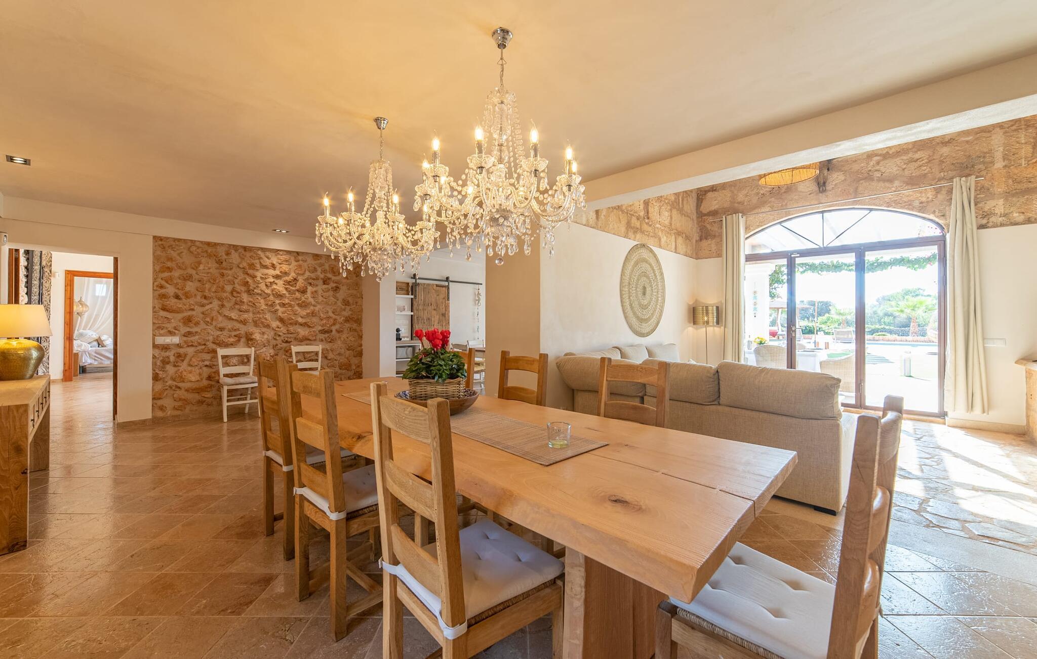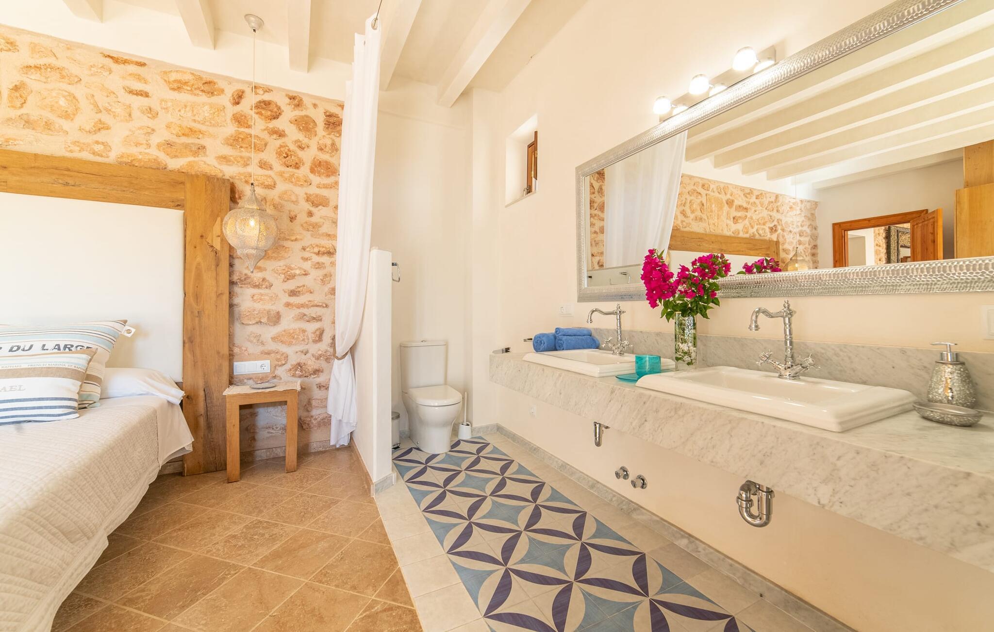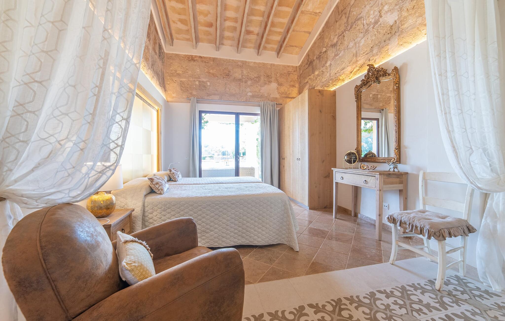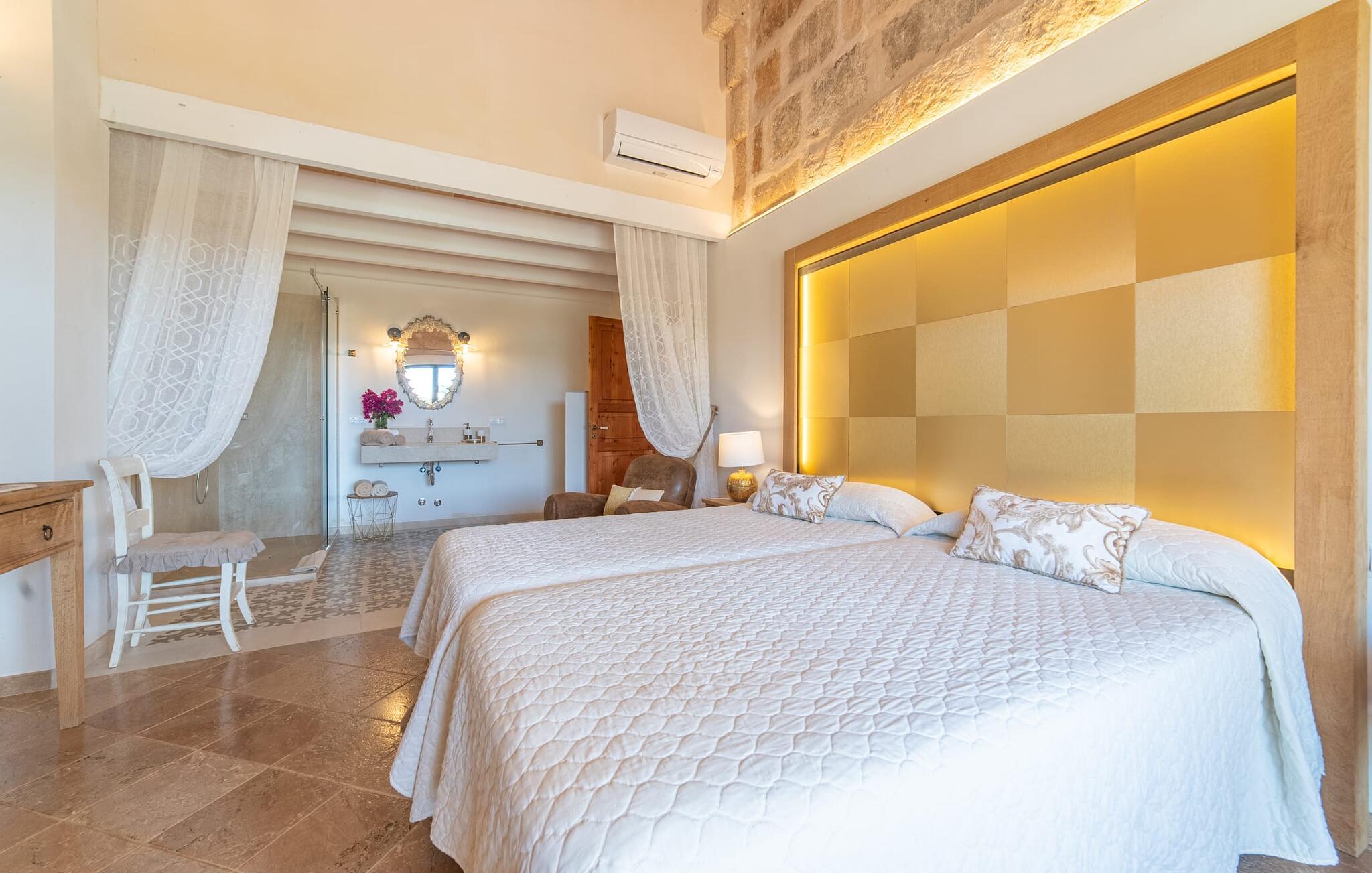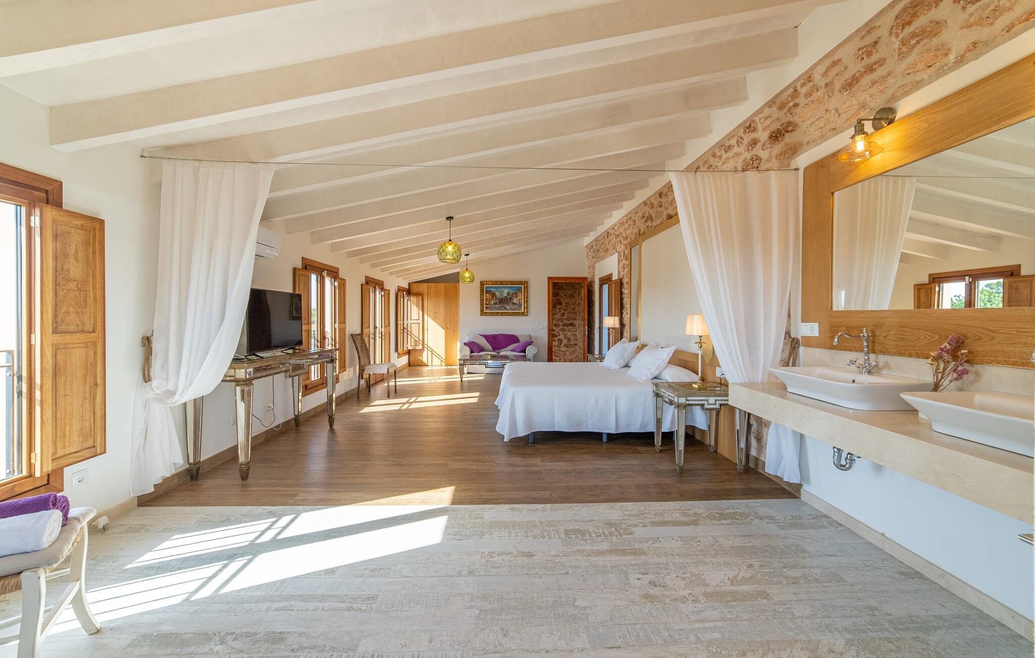 Den smukke bondegård "Can Boleno" ligger i det sydlige Mallorca. Det er omgivet af en 35.000 m² stor grund. Fra den rummelige, overdækkede terrasse på huset har I en god udsigt til det kærligt designede poolområde. Ud over det sensationelle hovedbassin på 20 x 5 m er der en anden, mindre pool. Omkring hovedpoolen er der adskillige komfortable sidde- og liggemuligheder som dagsenge, komfortable hængende stole og stilfulde loungemøbler til at slappe af i solen eller i skyggen. Der er også en mobil grill, en udendørs bruser og et bordtennisbord. Den lejlighedsvis hørbare vej mellem Llucmajor og Campos er cirka 400 m væk og tilbyder en bekvem måde at nå de smukke sandstrande Es Trenc og Sa Rápita på kort tid. Interiøret i dette skønne feriehus i to etager er smagfuldt og kvalitativt indrettet. Store glasskydedøre giver nem udgang fra stue og køkken til den overdækkede terrasse. I er velkommen til at nyde jeres måltider i den hyggelige, åbne spisestue eller i det rummelige køkken i landlig stil. Der er også fire soveværelser med dobbeltsenge i stueetagen. De har hver deres badeværelse og deres egen adgang til det fri. Et af soveværelserne har direkte adgang til den mindre pool. Den øverste etage er helt dedikeret til et stort soveværelse med en-suite badeværelse og udgang til en smuk morgenmadsterrasse med udsigt over det idylliske landskab. Hele landstedet er udstyret med aircondition og varme og byder på ideelle forhold for komfortabelt arbejde hjemmefra. Feriehuset har en afsondret landlig beliggenhed, cirka 10 minutters kørsel fra Llucmajor og Campos. Begge steder byder på gode indkøbsmuligheder og restauranter. De smukke sandstrande Es Trenc og Sa Rápita ligger knap 20 minutter væk i bil. Son Antem Golfbane ligger 13 km derfra.