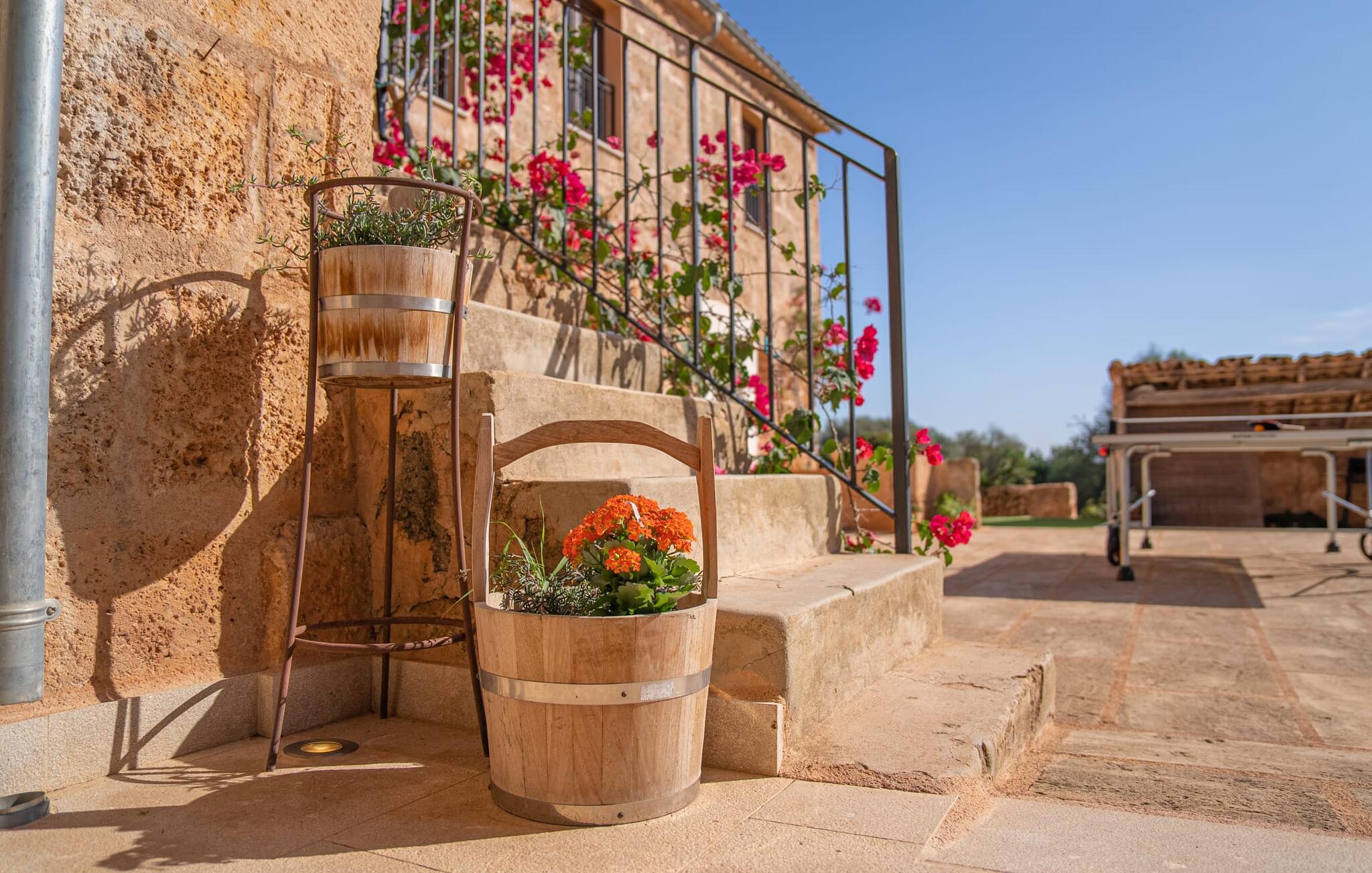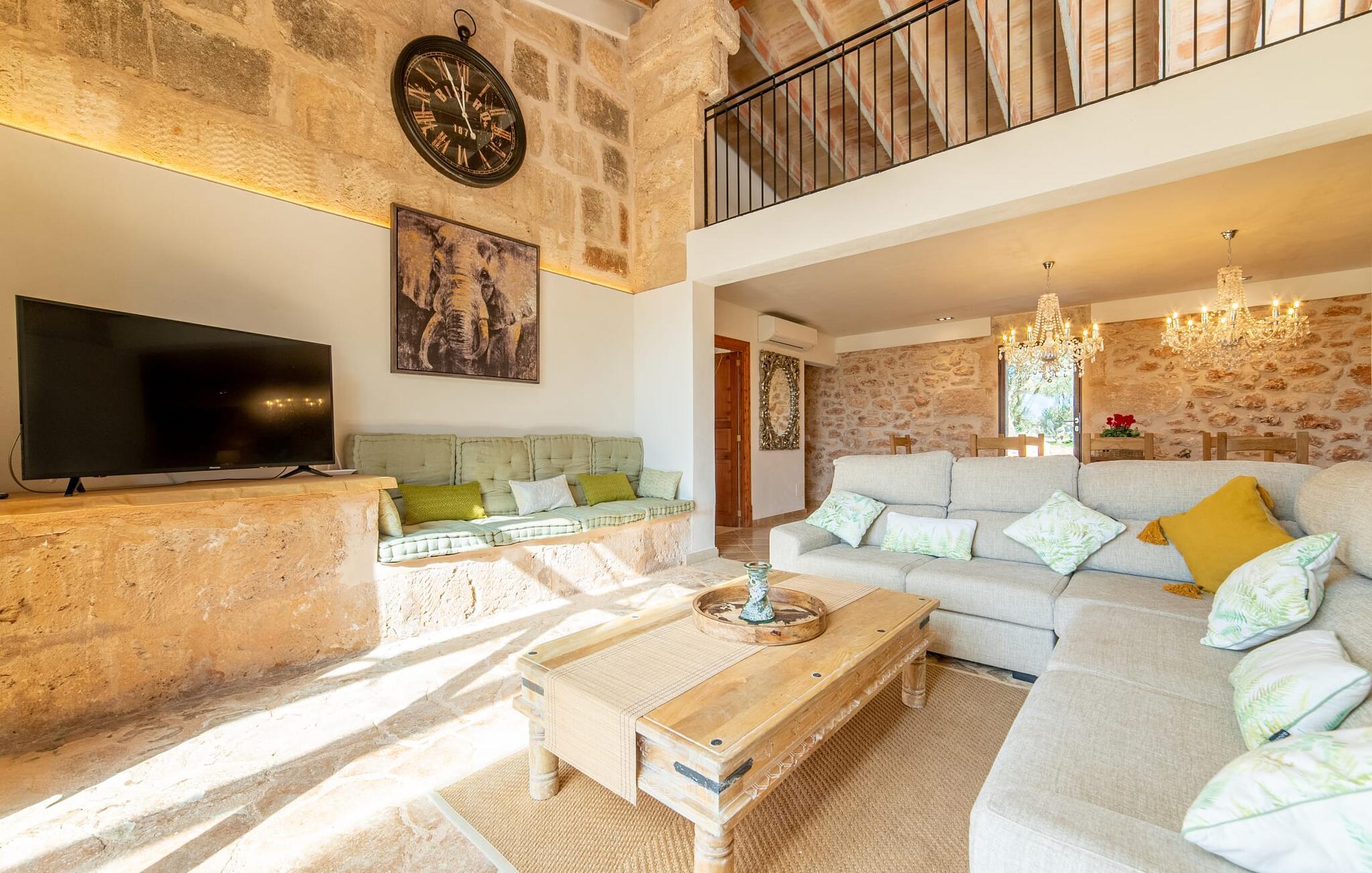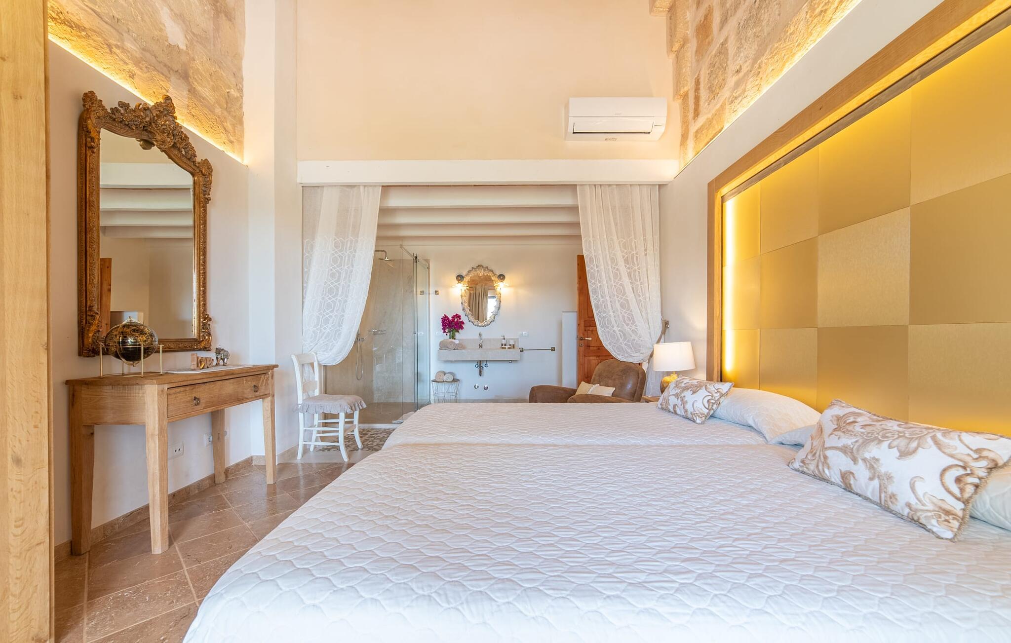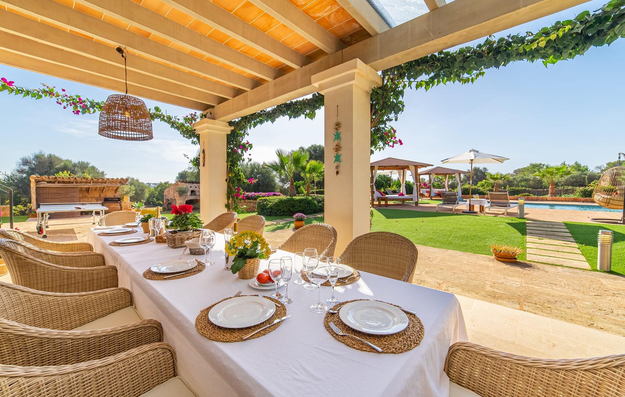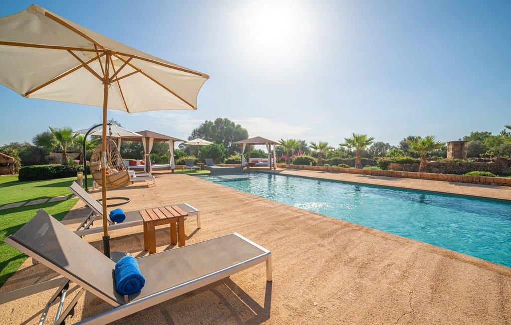 Den smukke bondegård "Can Boleno" ligger i det sydlige Mallorca. Det er omgivet af en 35.000 m² stor grund. Fra den rummelige, overdækkede terrasse på huset har I en god udsigt til det kærligt designede poolområde. Ud over det sensationelle hovedbassin på 20 x 5 m er der en anden, mindre pool. Omkring hovedpoolen er der adskillige komfortable sidde- og liggemuligheder som dagsenge, komfortable hængende stole og stilfulde loungemøbler til at slappe af i solen eller i skyggen. Der er også en mobil grill, en udendørs bruser og et bordtennisbord. Den lejlighedsvis hørbare vej mellem Llucmajor og Campos er cirka 400 m væk og tilbyder en bekvem måde at nå de smukke sandstrande Es Trenc og Sa Rápita på kort tid. Interiøret i dette skønne feriehus i to etager er smagfuldt og kvalitativt indrettet. Store glasskydedøre giver nem udgang fra stue og køkken til den overdækkede terrasse. I er velkommen til at nyde jeres måltider i den hyggelige, åbne spisestue eller i det rummelige køkken i landlig stil. Der er også fire soveværelser med dobbeltsenge i stueetagen. De har hver deres badeværelse og deres egen adgang til det fri. Et af soveværelserne har direkte adgang til den mindre pool. Den øverste etage er helt dedikeret til et stort soveværelse med en-suite badeværelse og udgang til en smuk morgenmadsterrasse med udsigt over det idylliske landskab. Hele landstedet er udstyret med aircondition og varme og byder på ideelle forhold for komfortabelt arbejde hjemmefra. Feriehuset har en afsondret landlig beliggenhed, cirka 10 minutters kørsel fra Llucmajor og Campos. Begge steder byder på gode indkøbsmuligheder og restauranter. De smukke sandstrande Es Trenc og Sa Rápita ligger knap 20 minutter væk i bil. Son Antem Golfbane ligger 13 km derfra.