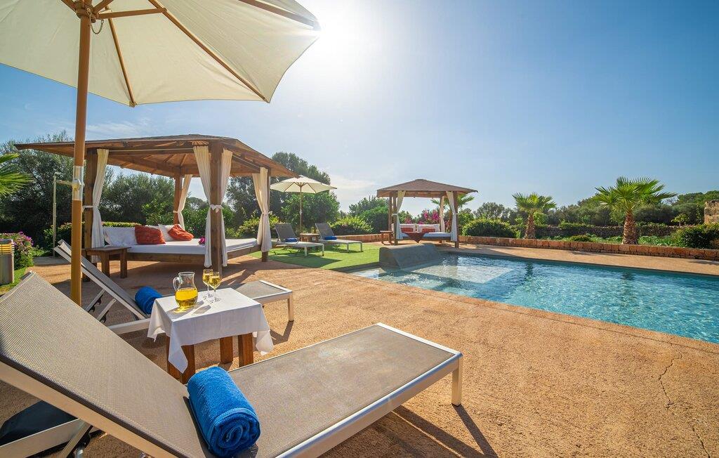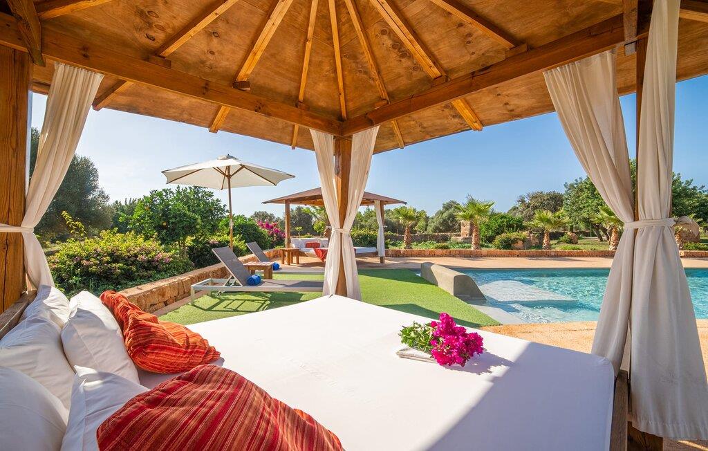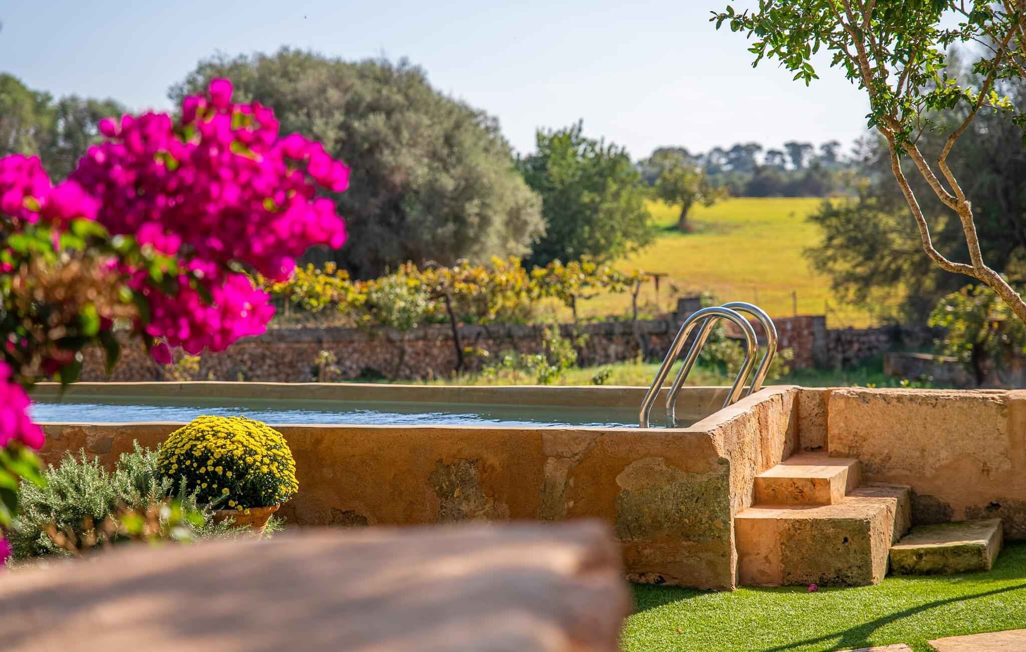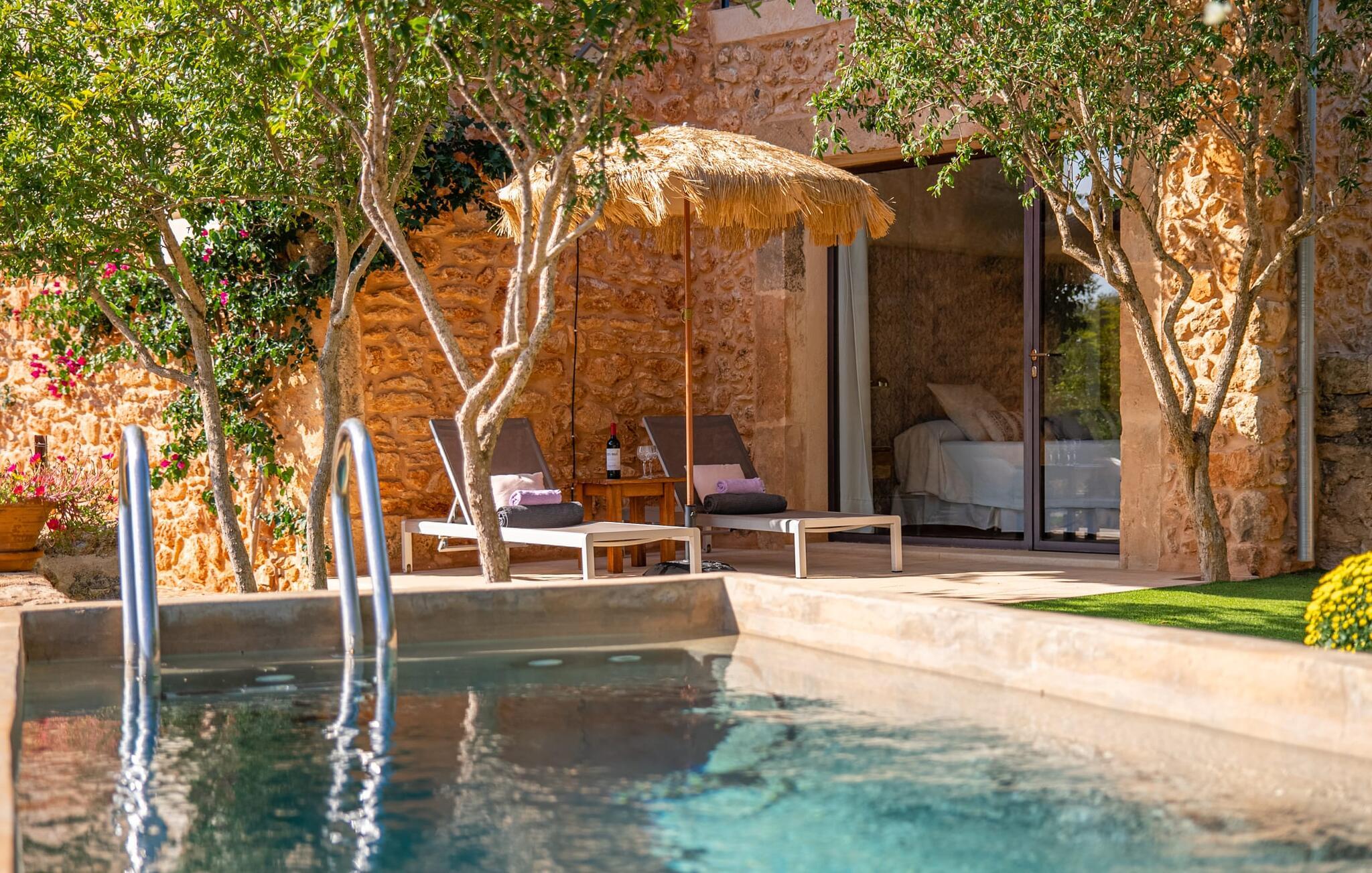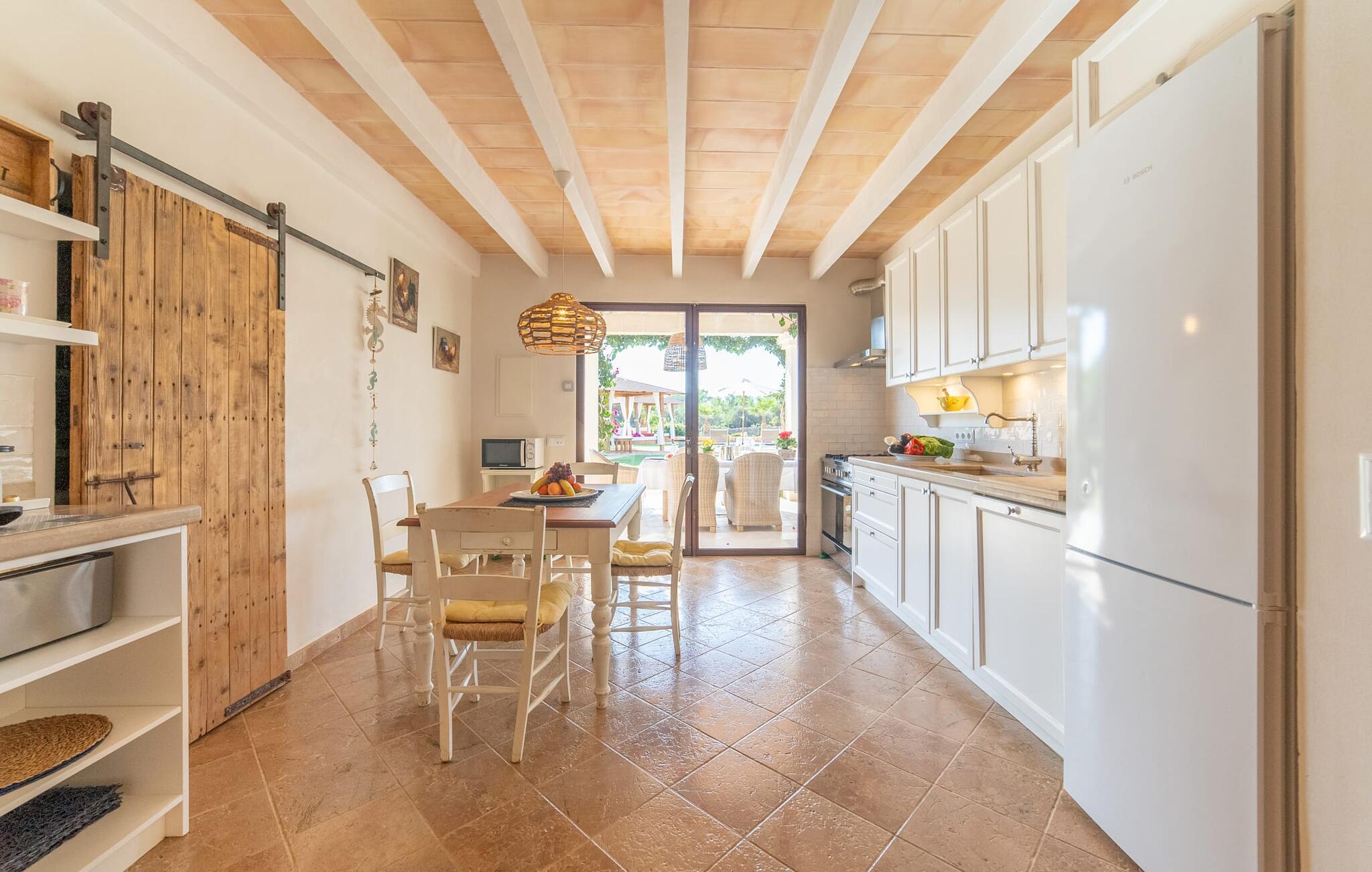 Den smukke bondegård "Can Boleno" ligger i det sydlige Mallorca. Det er omgivet af en 35.000 m² stor grund. Fra den rummelige, overdækkede terrasse på huset har I en god udsigt til det kærligt designede poolområde. Ud over det sensationelle hovedbassin på 20 x 5 m er der en anden, mindre pool. Omkring hovedpoolen er der adskillige komfortable sidde- og liggemuligheder som dagsenge, komfortable hængende stole og stilfulde loungemøbler til at slappe af i solen eller i skyggen. Der er også en mobil grill, en udendørs bruser og et bordtennisbord. Den lejlighedsvis hørbare vej mellem Llucmajor og Campos er cirka 400 m væk og tilbyder en bekvem måde at nå de smukke sandstrande Es Trenc og Sa Rápita på kort tid. Interiøret i dette skønne feriehus i to etager er smagfuldt og kvalitativt indrettet. Store glasskydedøre giver nem udgang fra stue og køkken til den overdækkede terrasse. I er velkommen til at nyde jeres måltider i den hyggelige, åbne spisestue eller i det rummelige køkken i landlig stil. Der er også fire soveværelser med dobbeltsenge i stueetagen. De har hver deres badeværelse og deres egen adgang til det fri. Et af soveværelserne har direkte adgang til den mindre pool. Den øverste etage er helt dedikeret til et stort soveværelse med en-suite badeværelse og udgang til en smuk morgenmadsterrasse med udsigt over det idylliske landskab. Hele landstedet er udstyret med aircondition og varme og byder på ideelle forhold for komfortabelt arbejde hjemmefra. Feriehuset har en afsondret landlig beliggenhed, cirka 10 minutters kørsel fra Llucmajor og Campos. Begge steder byder på gode indkøbsmuligheder og restauranter. De smukke sandstrande Es Trenc og Sa Rápita ligger knap 20 minutter væk i bil. Son Antem Golfbane ligger 13 km derfra.