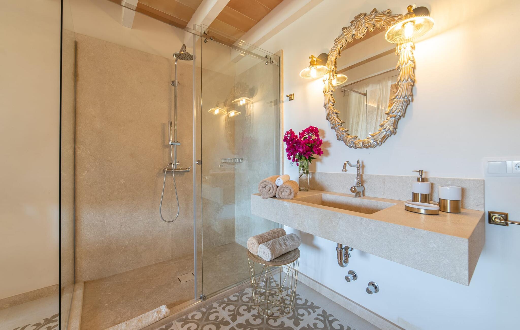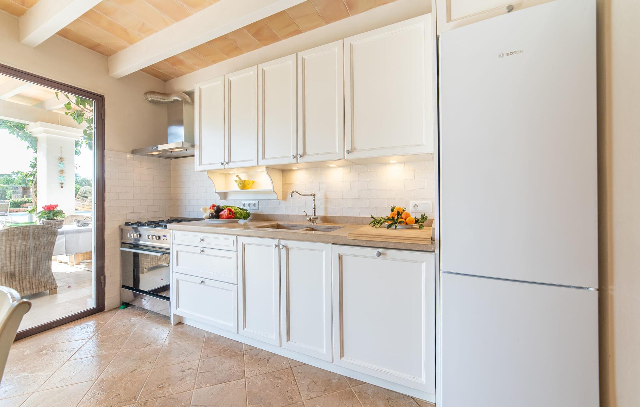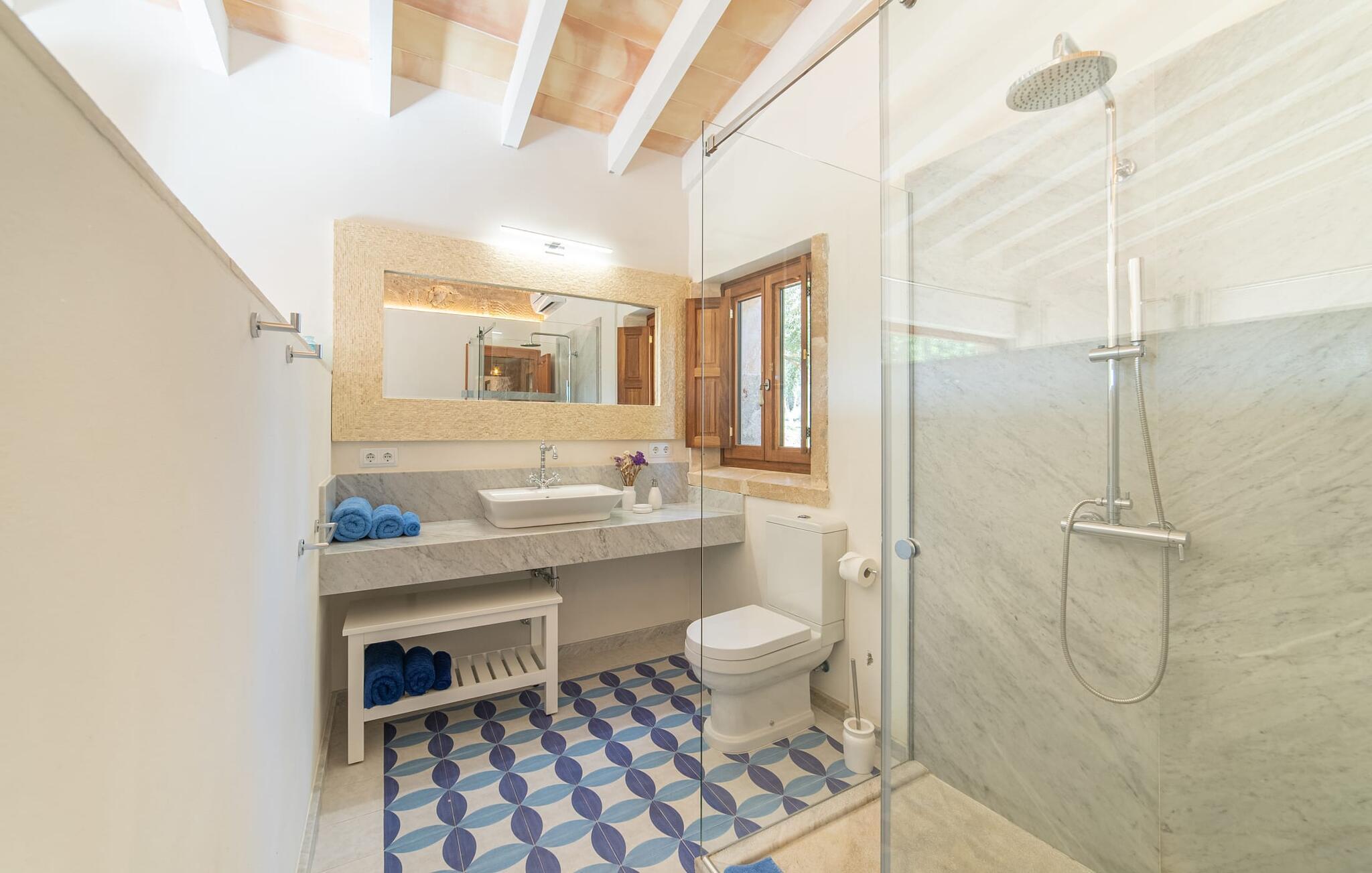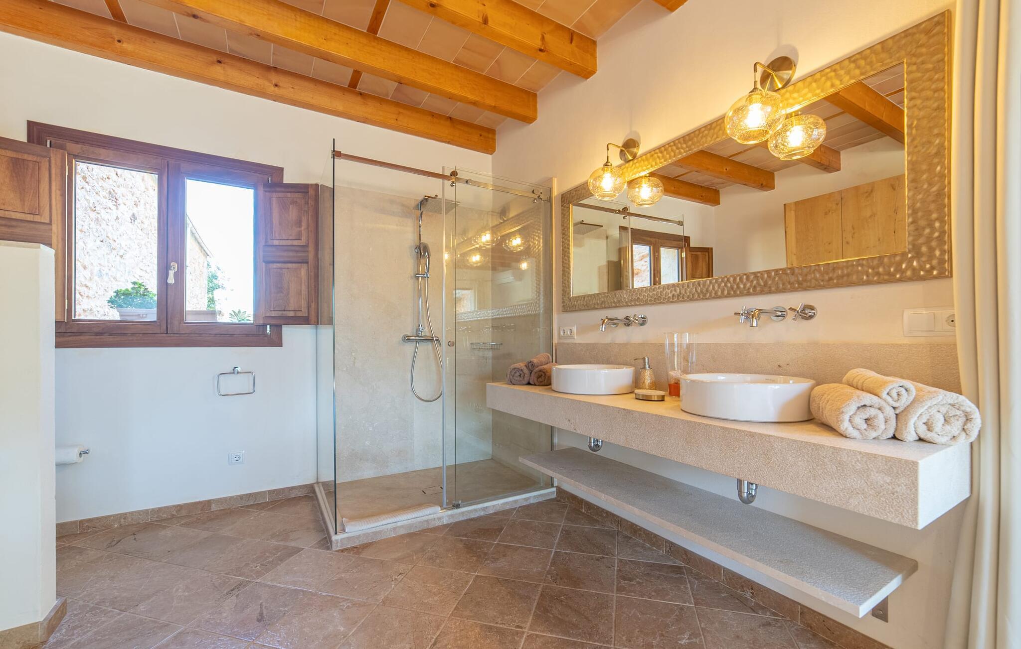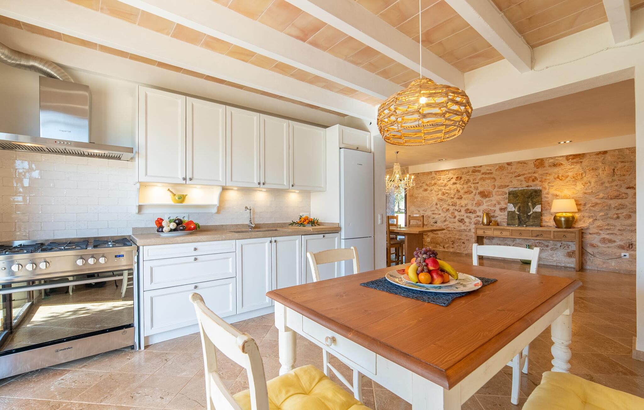 Den smukke bondegård "Can Boleno" ligger i det sydlige Mallorca. Det er omgivet af en 35.000 m² stor grund. Fra den rummelige, overdækkede terrasse på huset har I en god udsigt til det kærligt designede poolområde. Ud over det sensationelle hovedbassin på 20 x 5 m er der en anden, mindre pool. Omkring hovedpoolen er der adskillige komfortable sidde- og liggemuligheder som dagsenge, komfortable hængende stole og stilfulde loungemøbler til at slappe af i solen eller i skyggen. Der er også en mobil grill, en udendørs bruser og et bordtennisbord. Den lejlighedsvis hørbare vej mellem Llucmajor og Campos er cirka 400 m væk og tilbyder en bekvem måde at nå de smukke sandstrande Es Trenc og Sa Rápita på kort tid. Interiøret i dette skønne feriehus i to etager er smagfuldt og kvalitativt indrettet. Store glasskydedøre giver nem udgang fra stue og køkken til den overdækkede terrasse. I er velkommen til at nyde jeres måltider i den hyggelige, åbne spisestue eller i det rummelige køkken i landlig stil. Der er også fire soveværelser med dobbeltsenge i stueetagen. De har hver deres badeværelse og deres egen adgang til det fri. Et af soveværelserne har direkte adgang til den mindre pool. Den øverste etage er helt dedikeret til et stort soveværelse med en-suite badeværelse og udgang til en smuk morgenmadsterrasse med udsigt over det idylliske landskab. Hele landstedet er udstyret med aircondition og varme og byder på ideelle forhold for komfortabelt arbejde hjemmefra. Feriehuset har en afsondret landlig beliggenhed, cirka 10 minutters kørsel fra Llucmajor og Campos. Begge steder byder på gode indkøbsmuligheder og restauranter. De smukke sandstrande Es Trenc og Sa Rápita ligger knap 20 minutter væk i bil. Son Antem Golfbane ligger 13 km derfra.